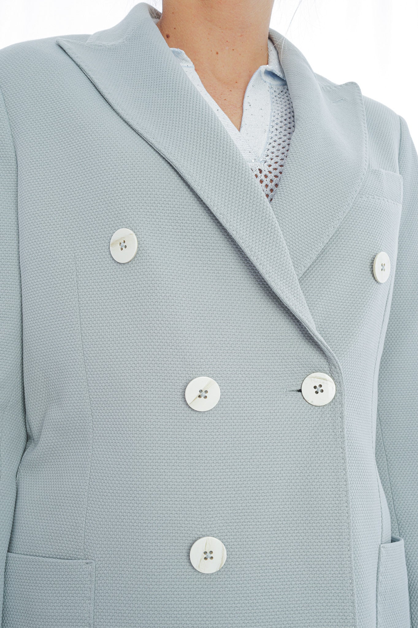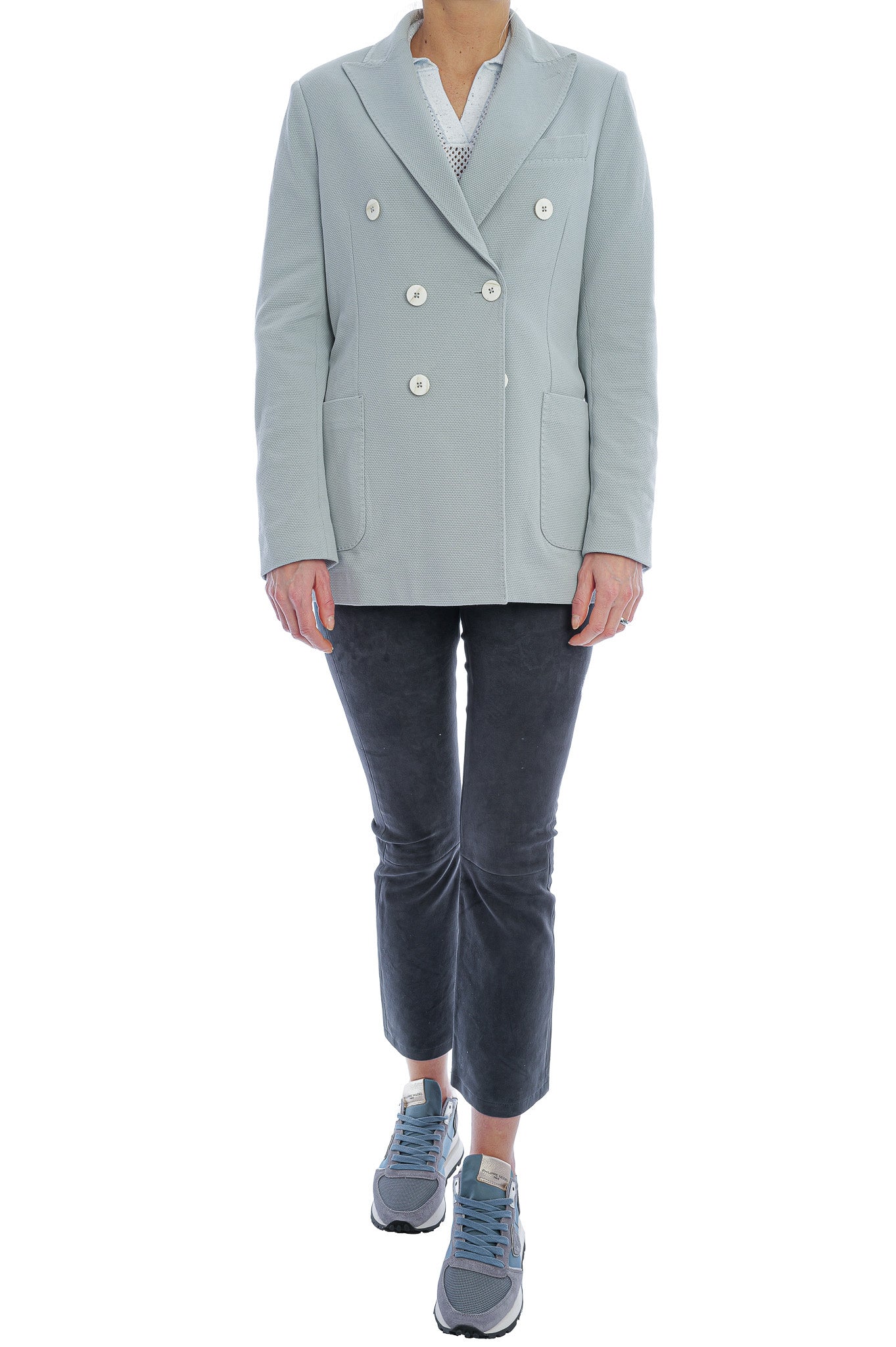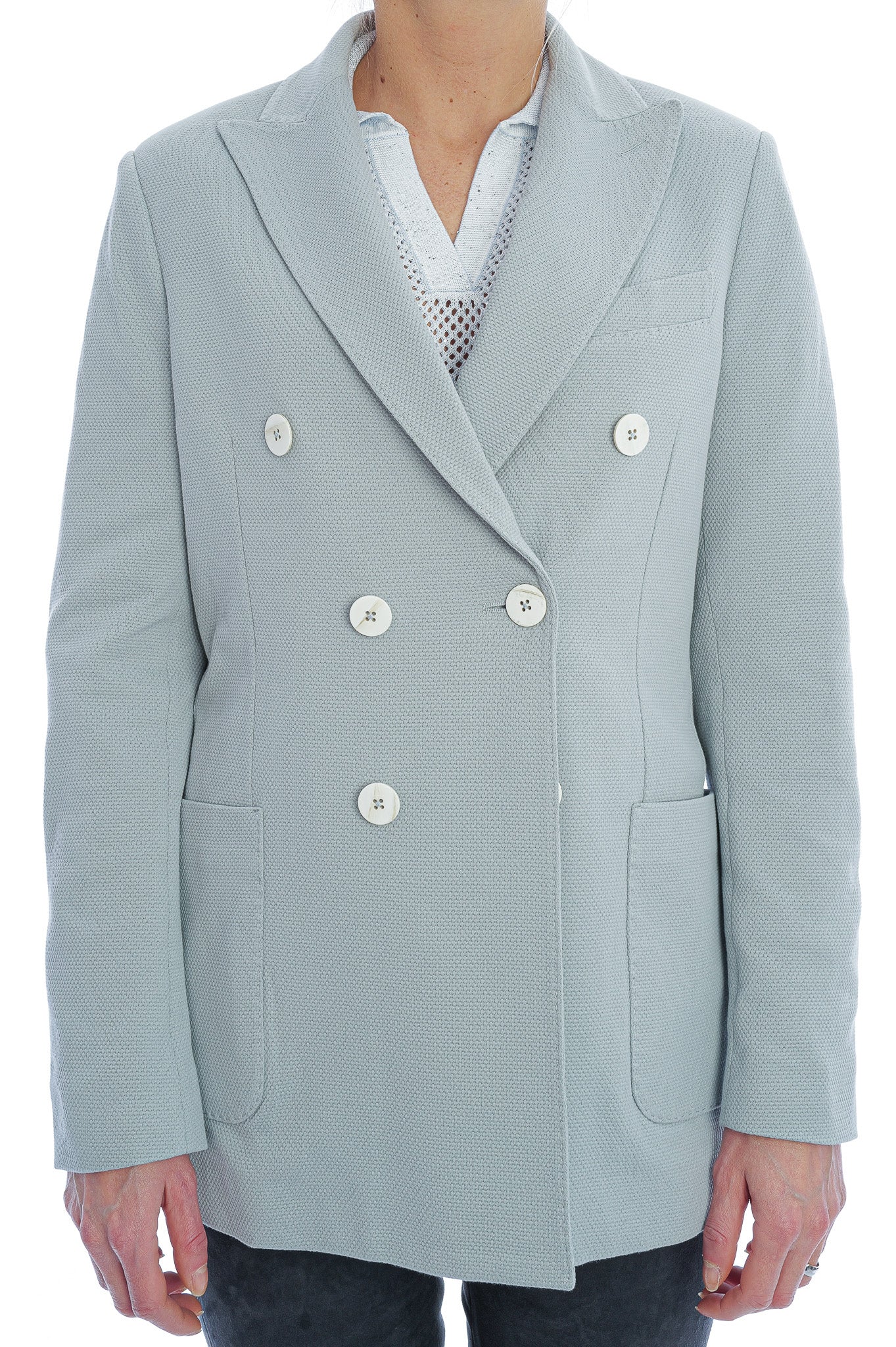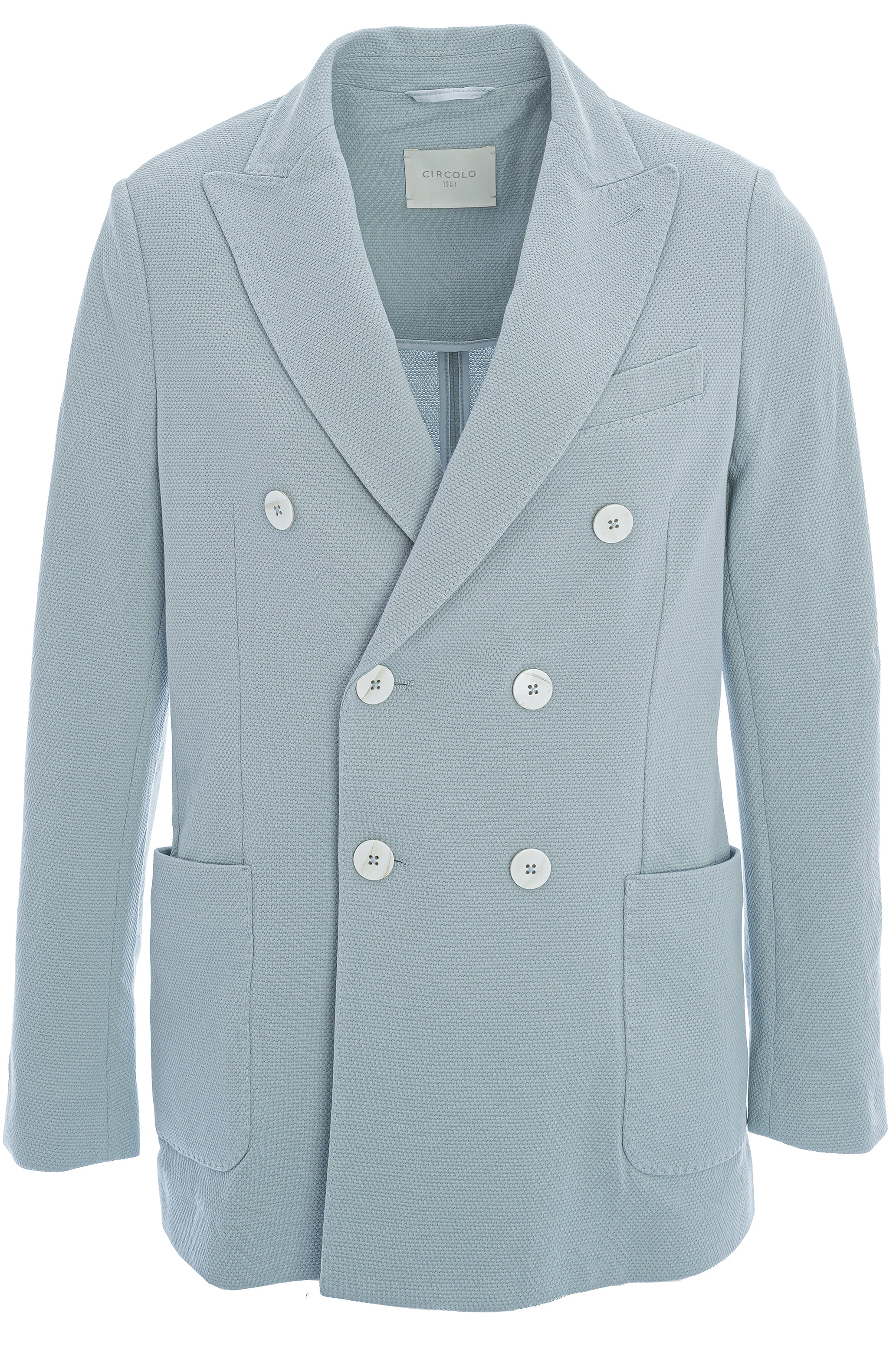 Der doppelreihige Blazer von Circolo 1901 überzeugt mit moderner Struktur und eleganter, hellblauer Farbgebung. Klassisches Revers, markante Knopfleiste und aufgesetzte Taschen verleihen dem Damen- oder Herrenblazer einen stilvollen, zeitgemäßen Look. Die hochwertige Verarbeitung sorgt für hohen Tragekomfort und macht ihn zum perfekten Begleiter für elegante und smarte Casual-Outfits.