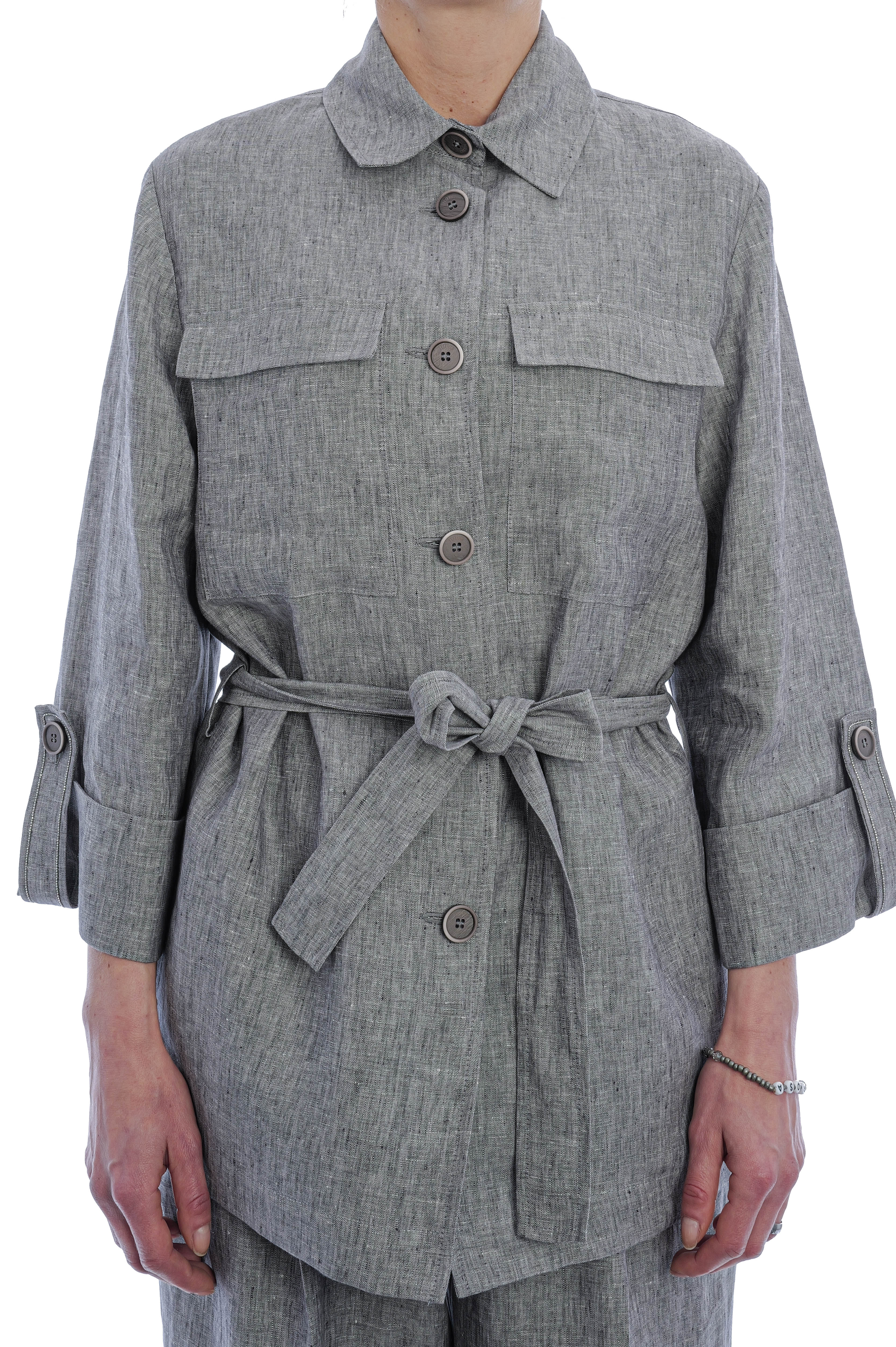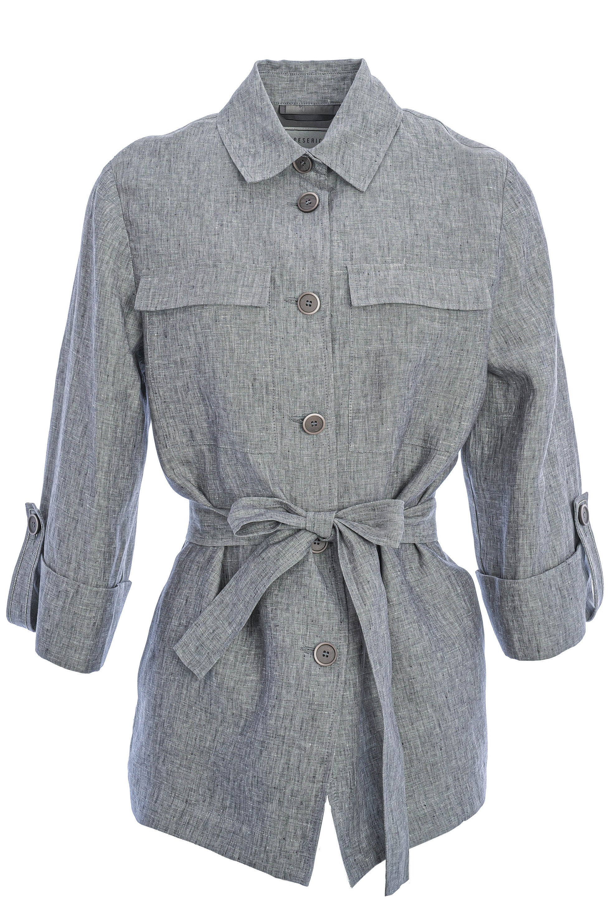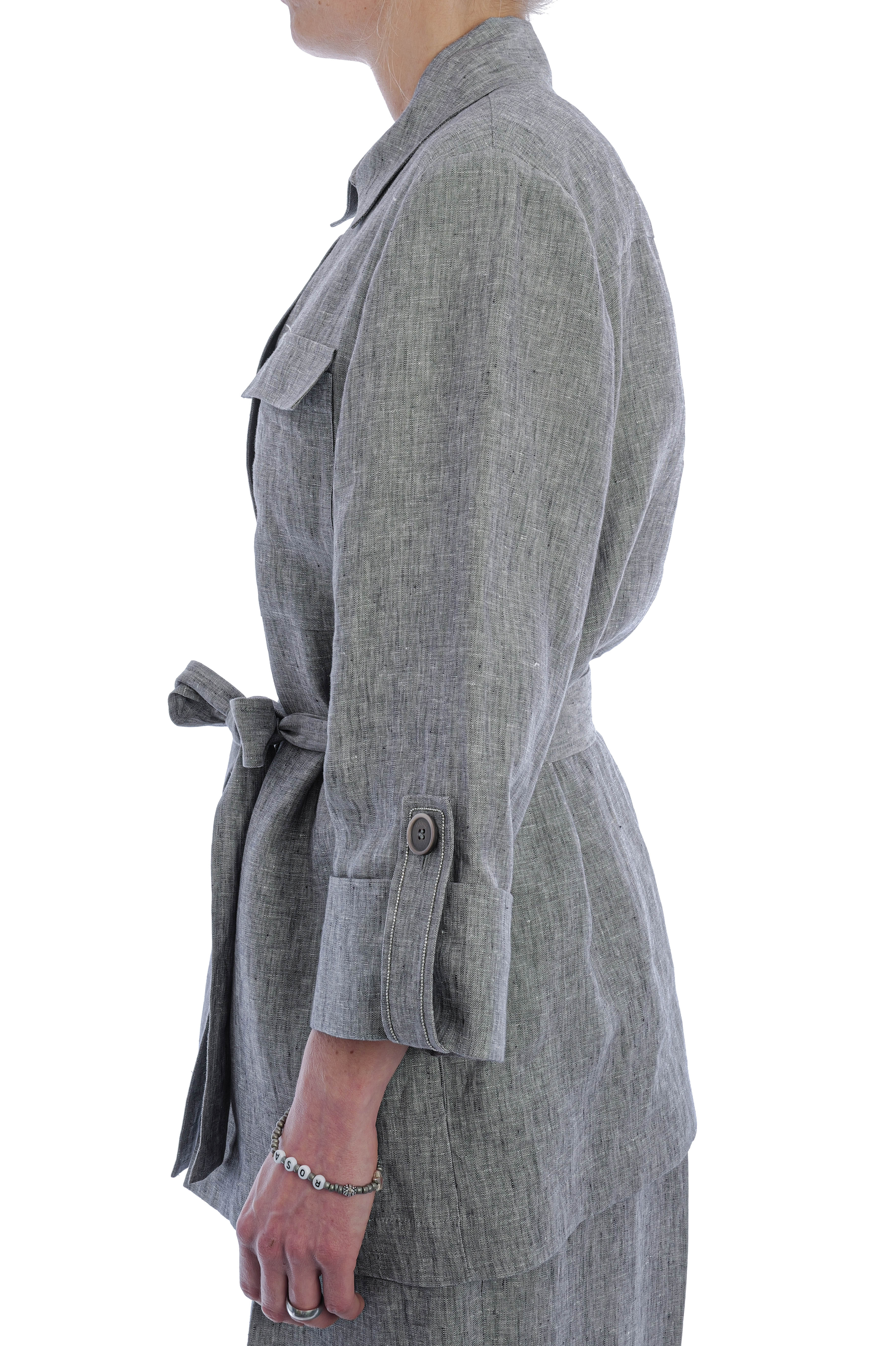 Dieser hochwertige Leinenblazer überzeugt durch seine natürliche, leicht strukturierte Oberfläche und eine elegante, taillierte Silhouette mit Bindegürtel, die die Figur stilvoll betont. Klassische Details wie der Hemdkragen, aufgesetzte Brusttaschen und die edlen Knöpfe verleihen dem Design eine zeitlose Raffinesse und machen ihn zum idealen Begleiter für anspruchsvolle Sommer-Looks.