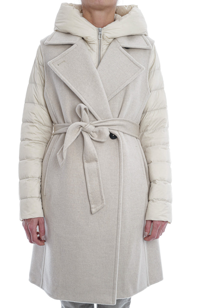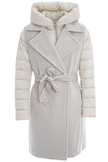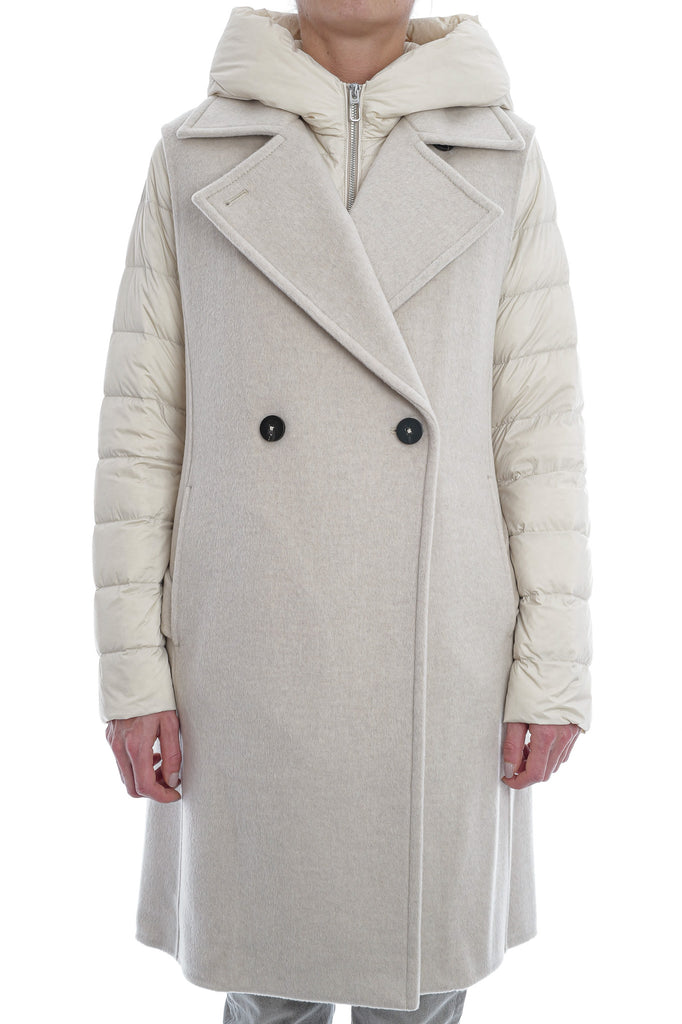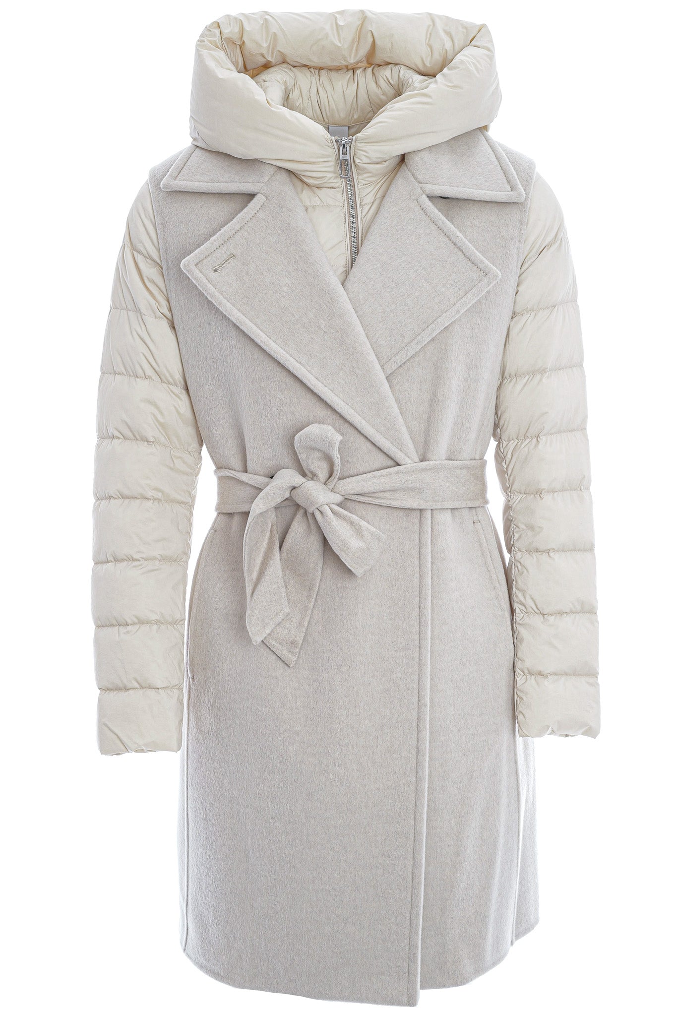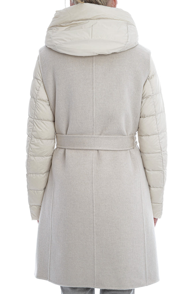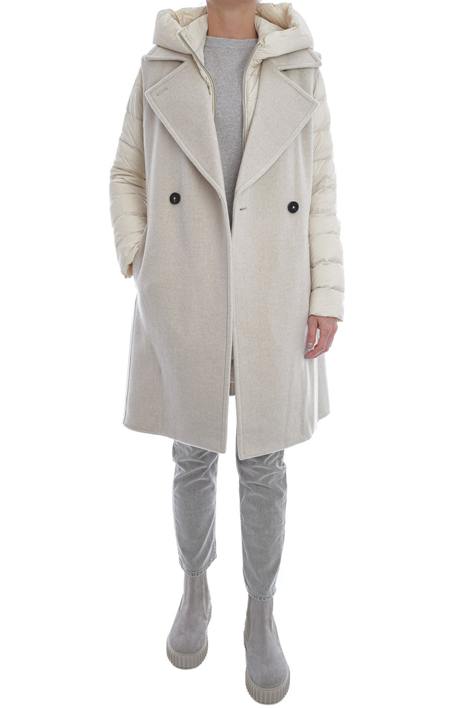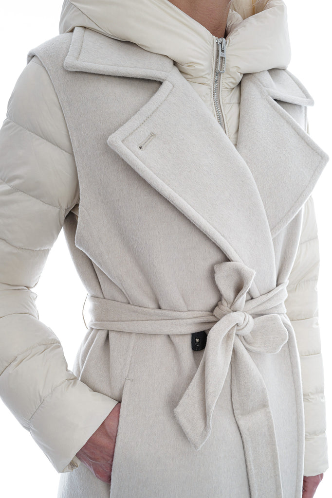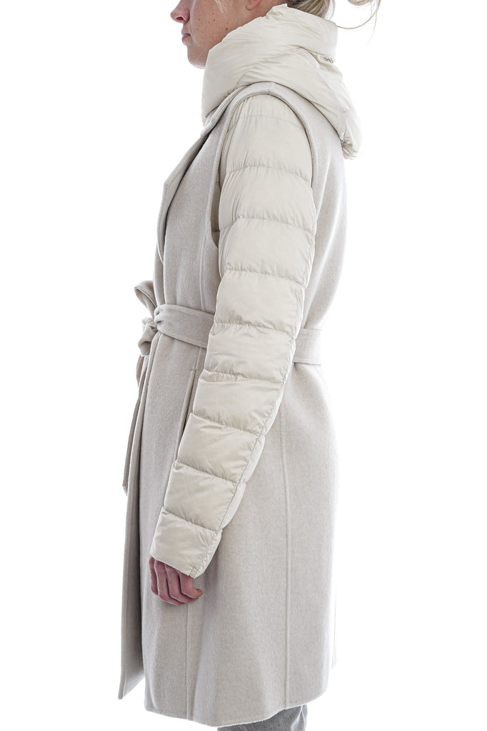 Die ungefütterte, lange Doppelreihweste aus DUNO’s „ATTIC“ Projekt besticht durch luxuriöse Woll-Cashmere-Doppellagenqualität, einen taillierenden Gürtel, Knopfverschluss und seitliche Taschen. Innen sorgt eine separat tragbare, ultraleichte Daunenjacke mit Reißverschluss, Kapuze und aufgesetzten Taschen für zusätzlichen Komfort und Vielseitigkeit.