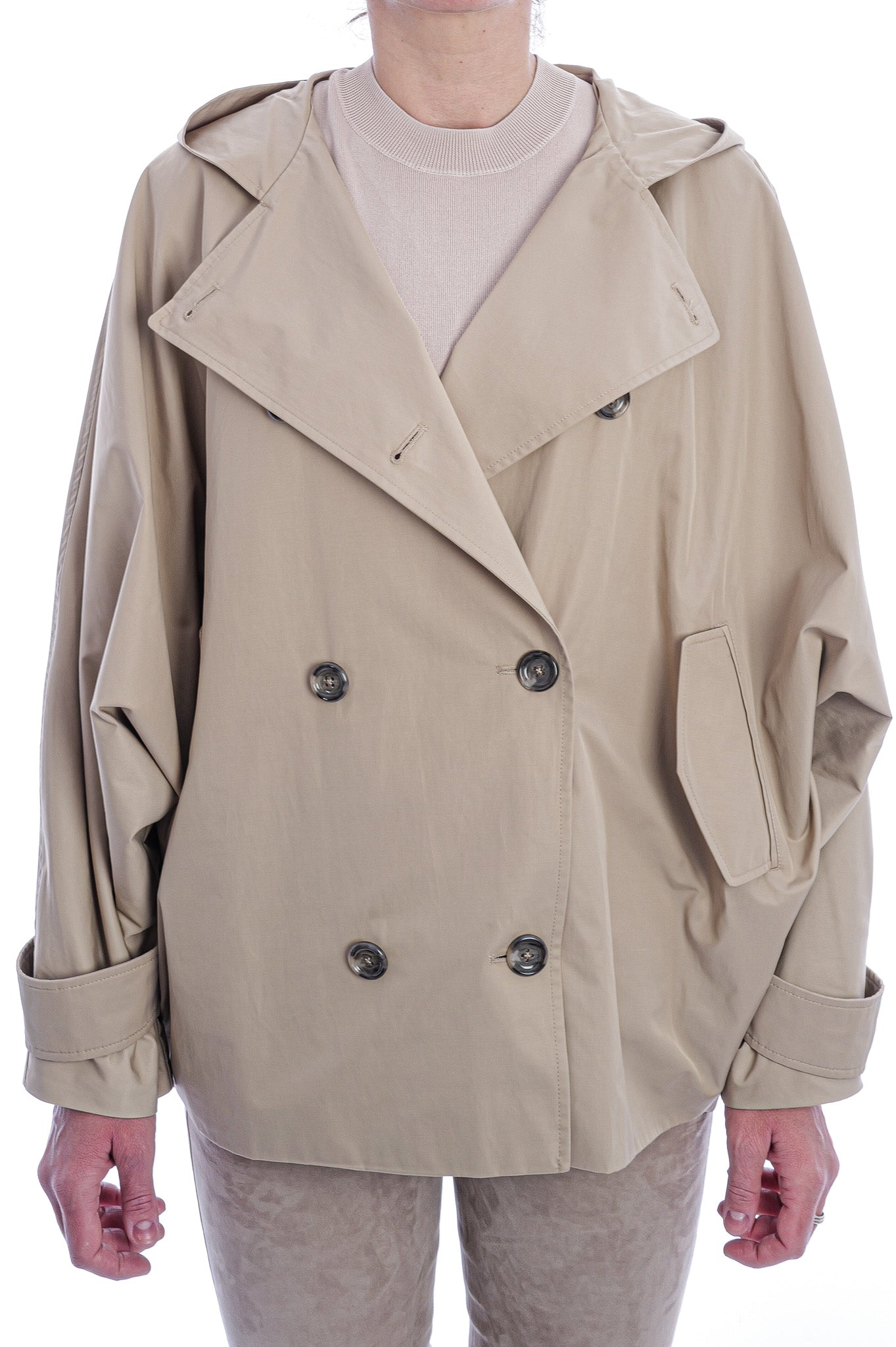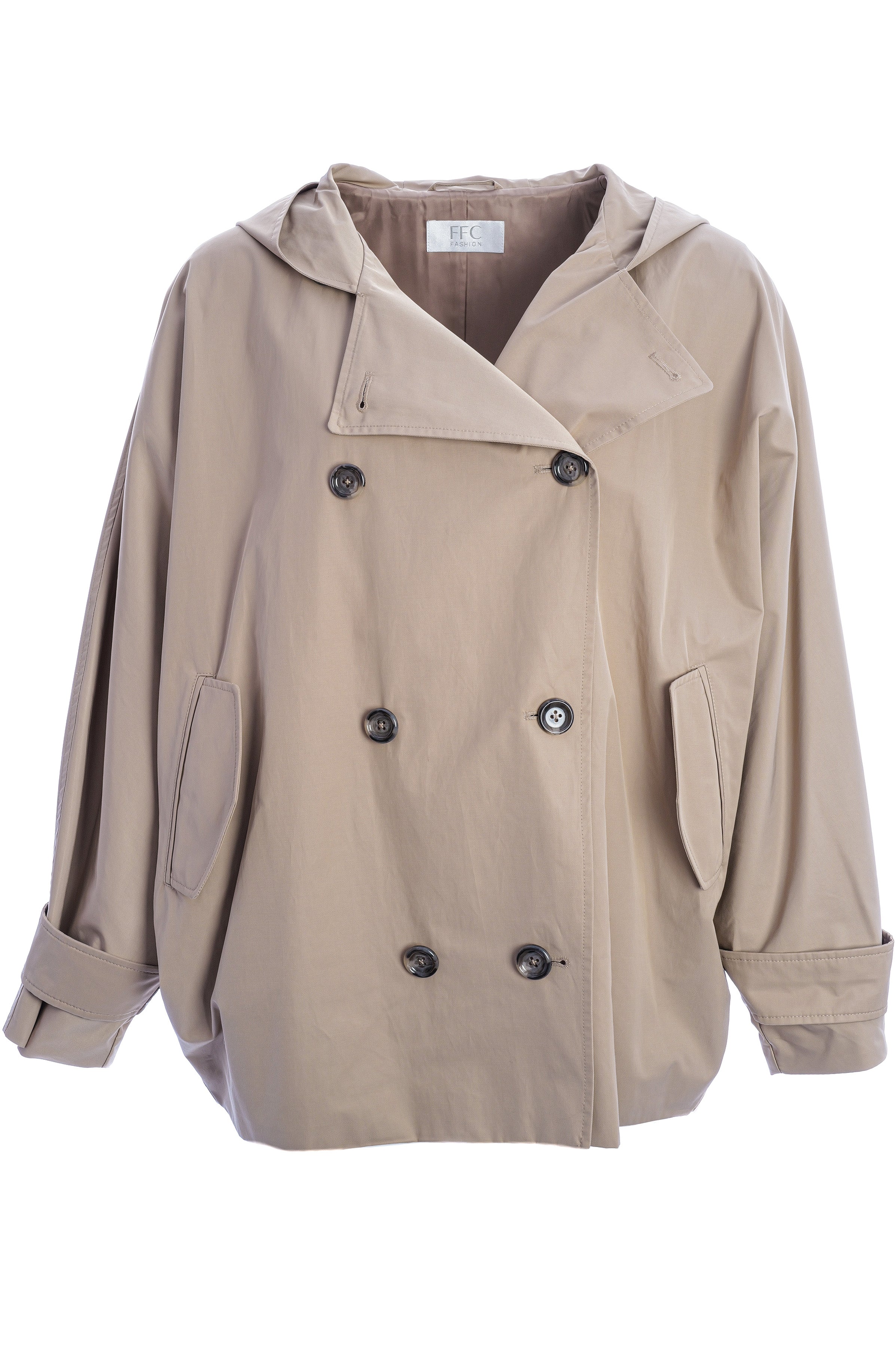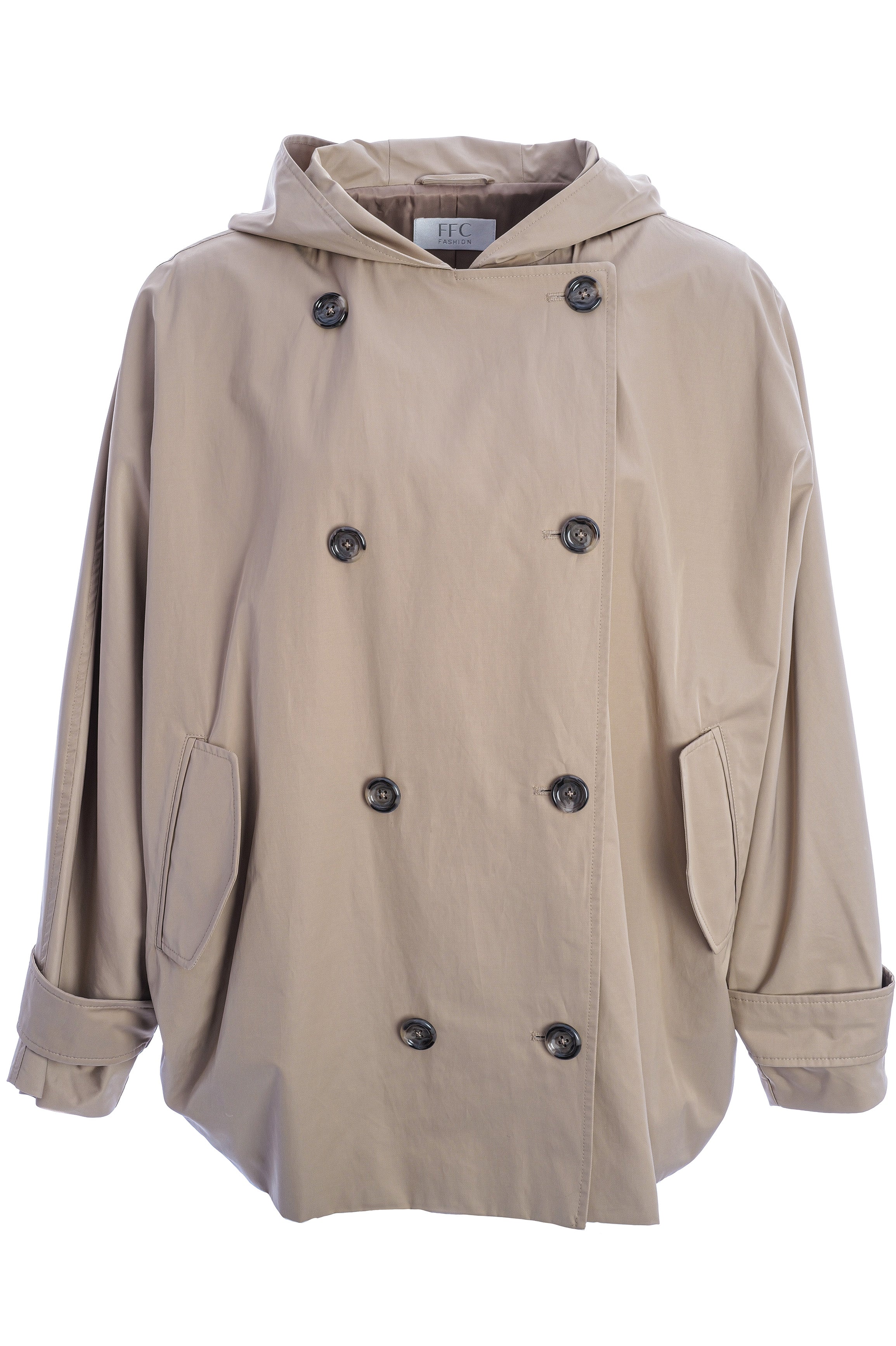 Der kurze, doppelreihige Trenchcoat von FFC besticht durch eine geräumige Kapuzensilhouette, markante Ärmelriemen und seitliche Eingrifftaschen. Weite Fledermausärmel verleihen dem Modell eine moderne, elegante Note und maximalen Tragekomfort.