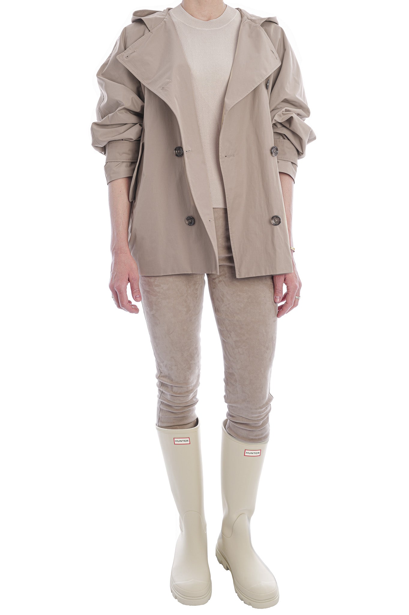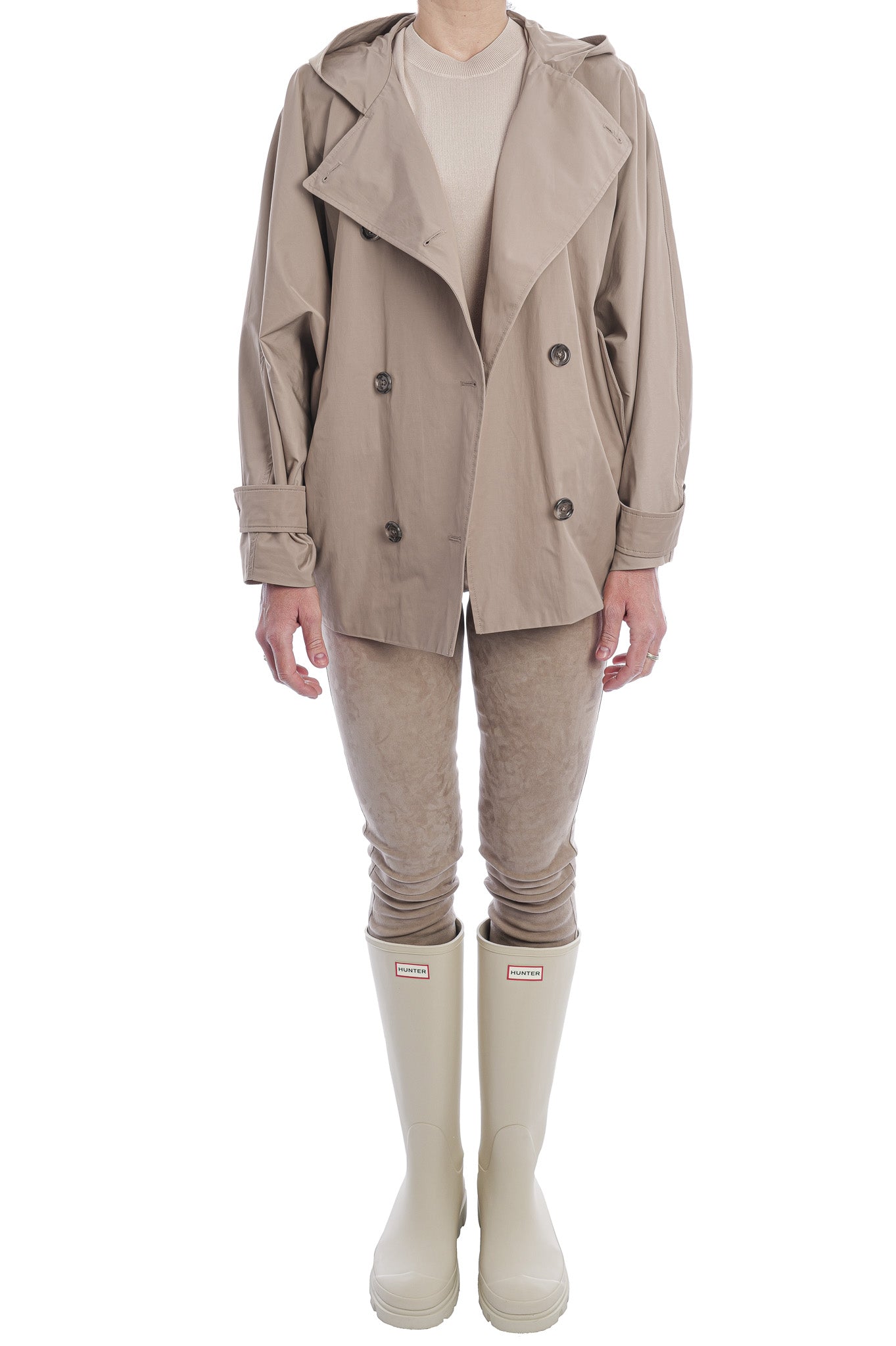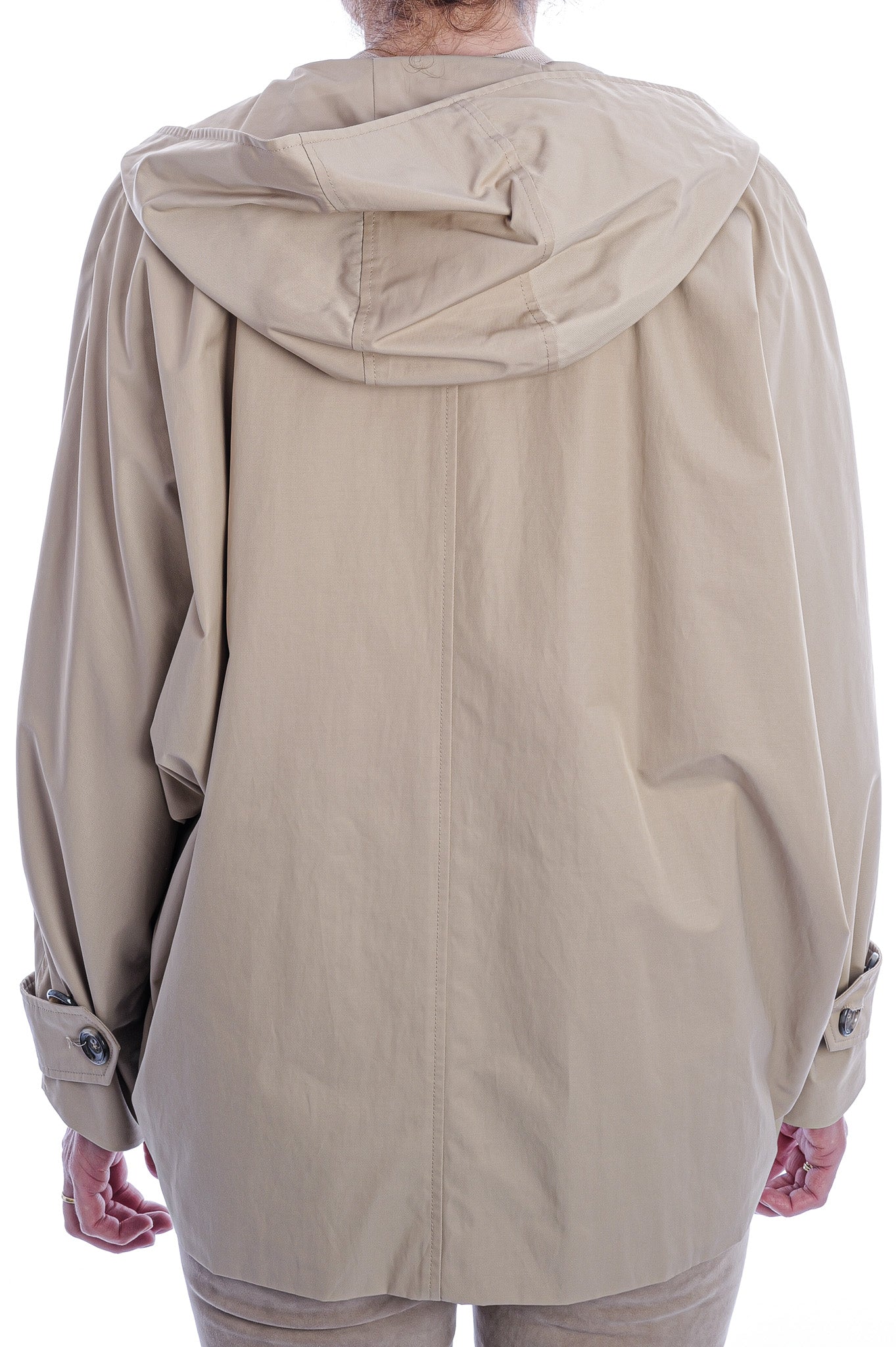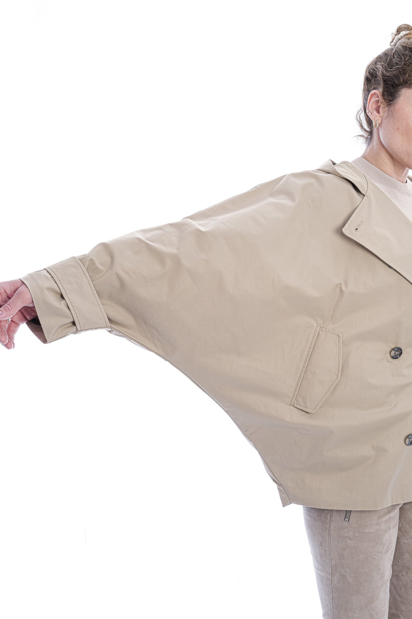 Der kurze, doppelreihige Trenchcoat von FFC besticht durch eine geräumige Kapuzensilhouette, markante Ärmelriemen und seitliche Eingrifftaschen. Weite Fledermausärmel verleihen dem Modell eine moderne, elegante Note und maximalen Tragekomfort.