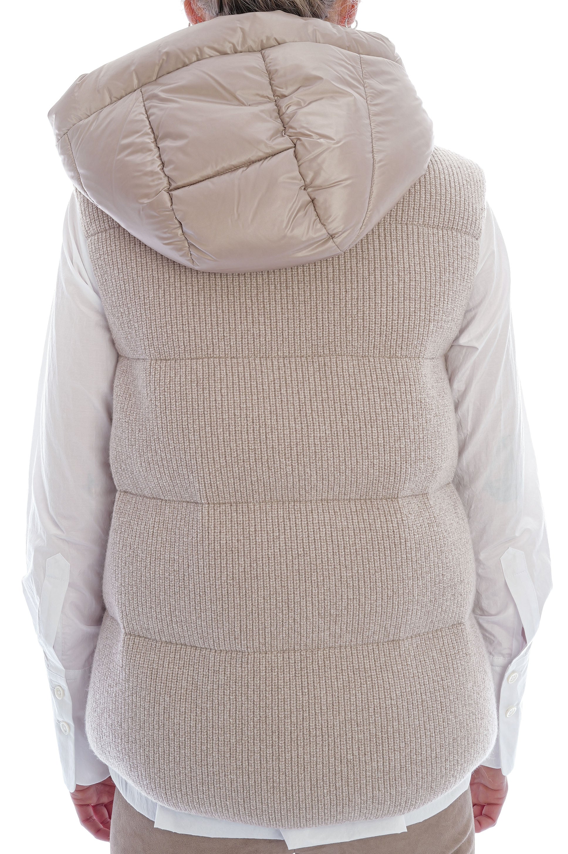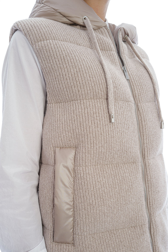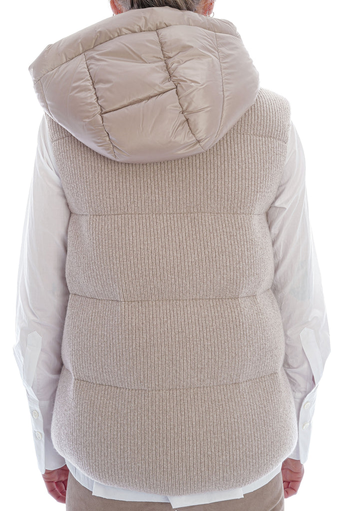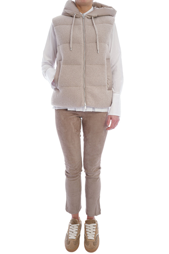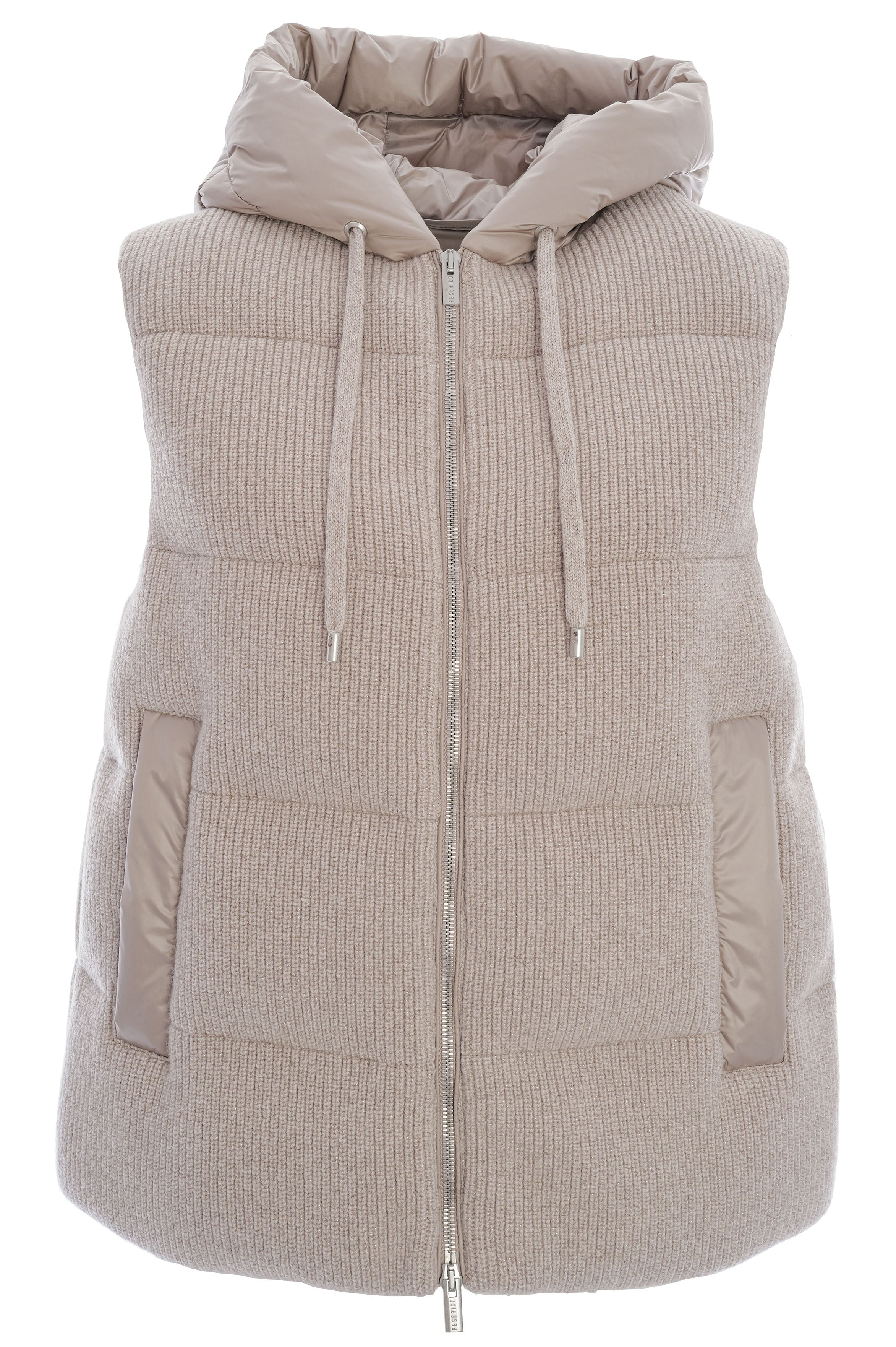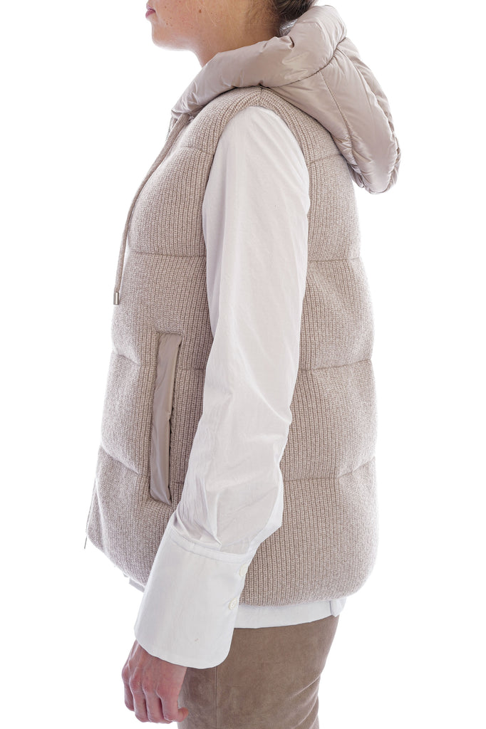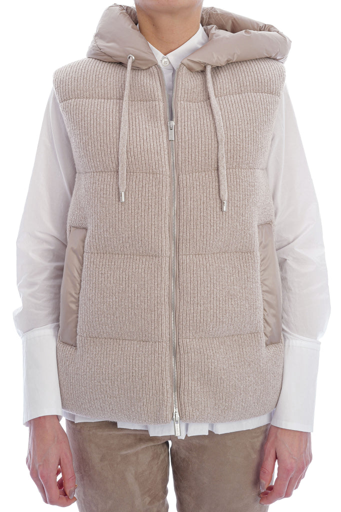Wolle und Kaschmir umhüllen diese Jacke in zurückhaltender Eleganz, während eine Füllung aus hochwertiger, mittelgewichtiger Gänsedaune für angenehme Wärme sorgt. Die Satin-Kapuze verleiht dem Modell eine raffinierte Note und macht es zum perfekten Begleiter für legere Outfits mit stilvollem Anspruch. In edlen Grau- und Beigetönen erhältlich, ist diese gesteppte Weste ein zeitloses Essential für jede Garderobe.