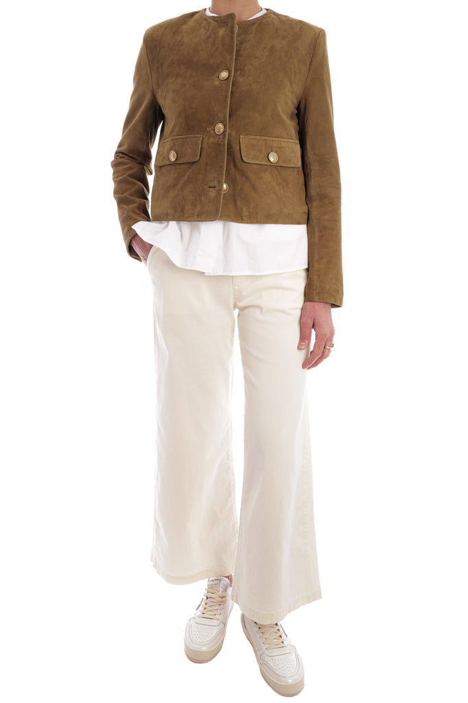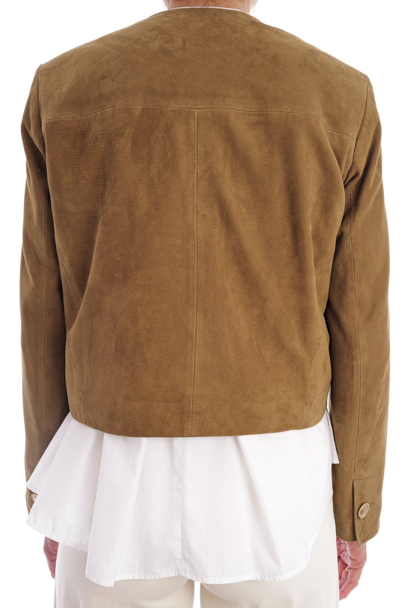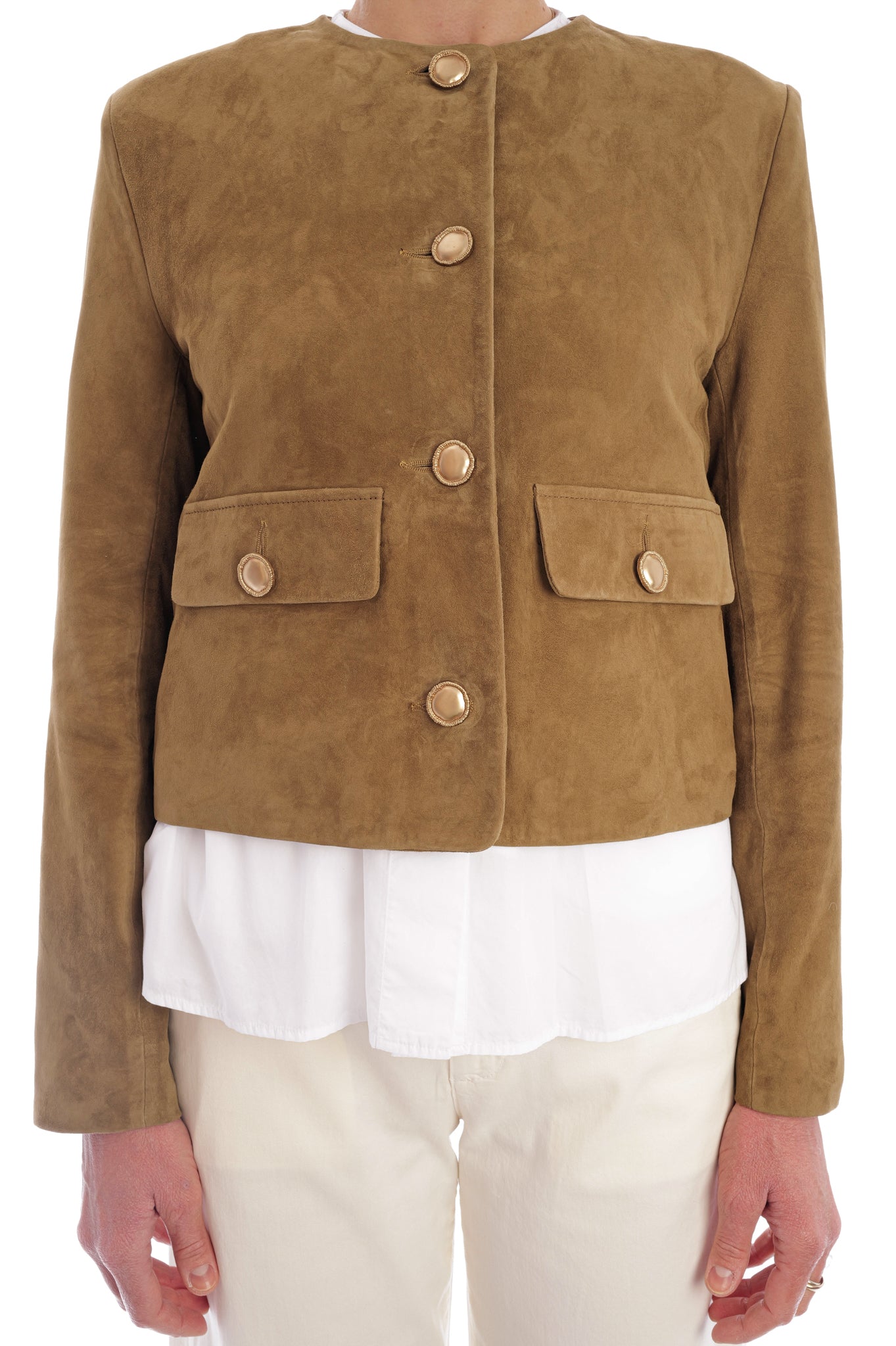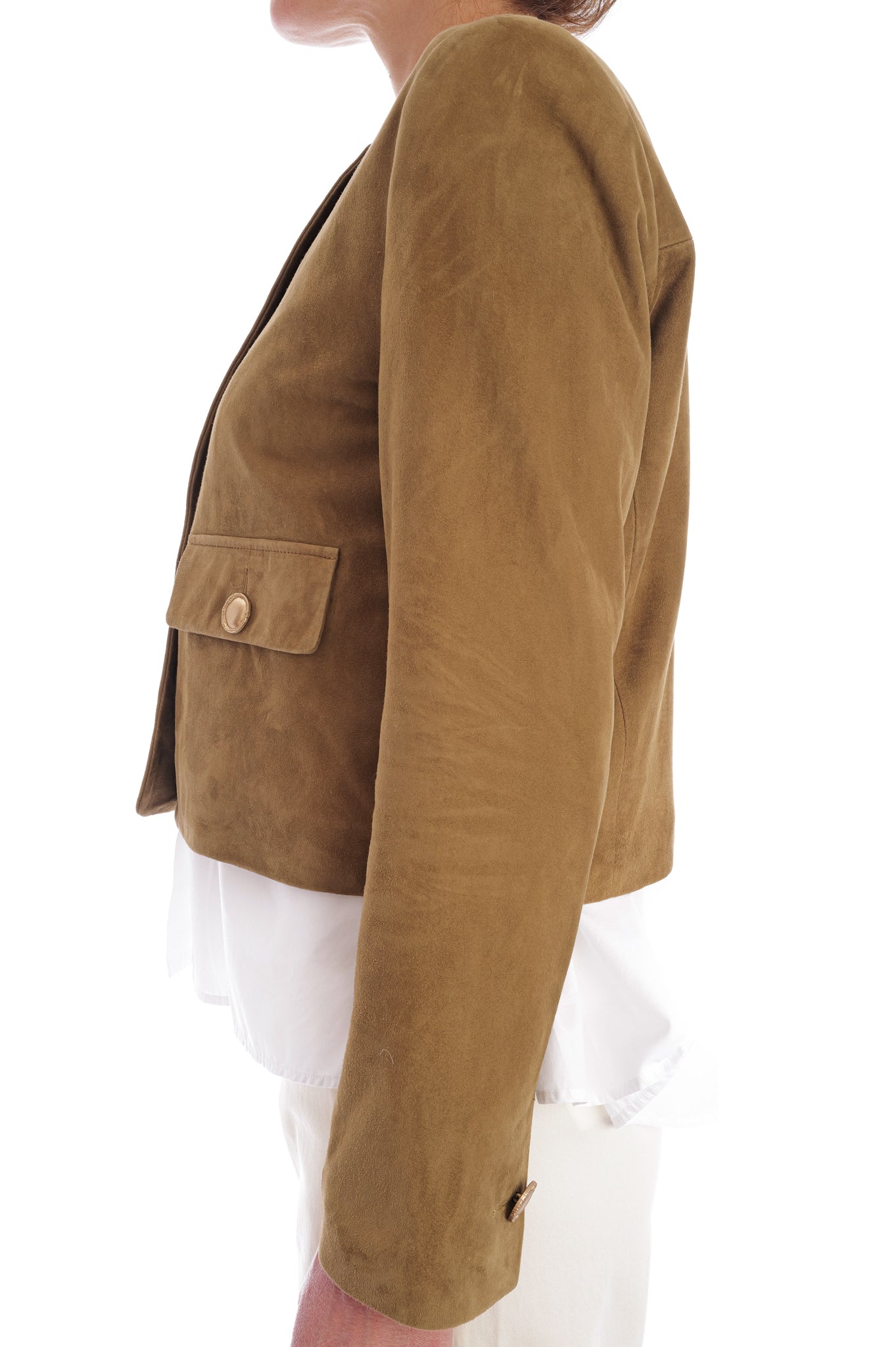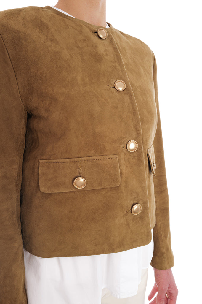 Diese edle, taillierte Wildlederjacke mit goldenen Knöpfen vereint zeitlose Eleganz mit modernem Chic. Die figurbetonte Silhouette und das leicht verkürzte Design setzen stilvolle Akzente, während die luxuriöse Haptik des Wildleders und die glänzenden Details den anspruchsvollen Look perfekt abrunden – ein vielseitiges Statement-Piece für jeden Anlass.