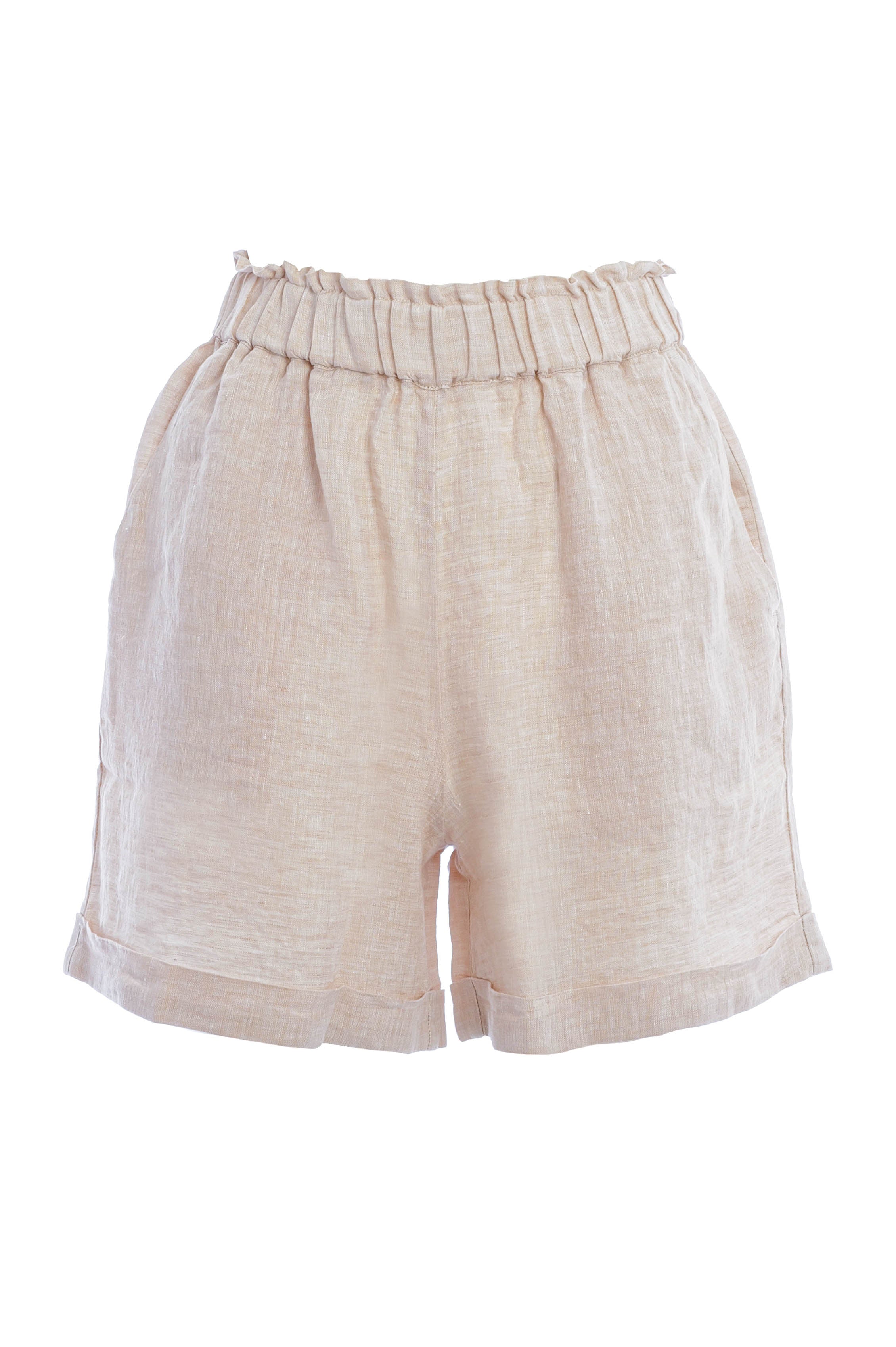 Diese Leinen-Shorts überzeugen mit hoher Leibhöhe und geradem, kurzem Bein für eine moderne, feminine Silhouette. Der elastische Bund und seitliche Eingrifftaschen sorgen für Komfort und Funktionalität im Alltag. Ein hochwertiges Sommer-Basic, das mit fixiertem Beinaufschlag lässige Eleganz in jede Damen-Garderobe bringt.