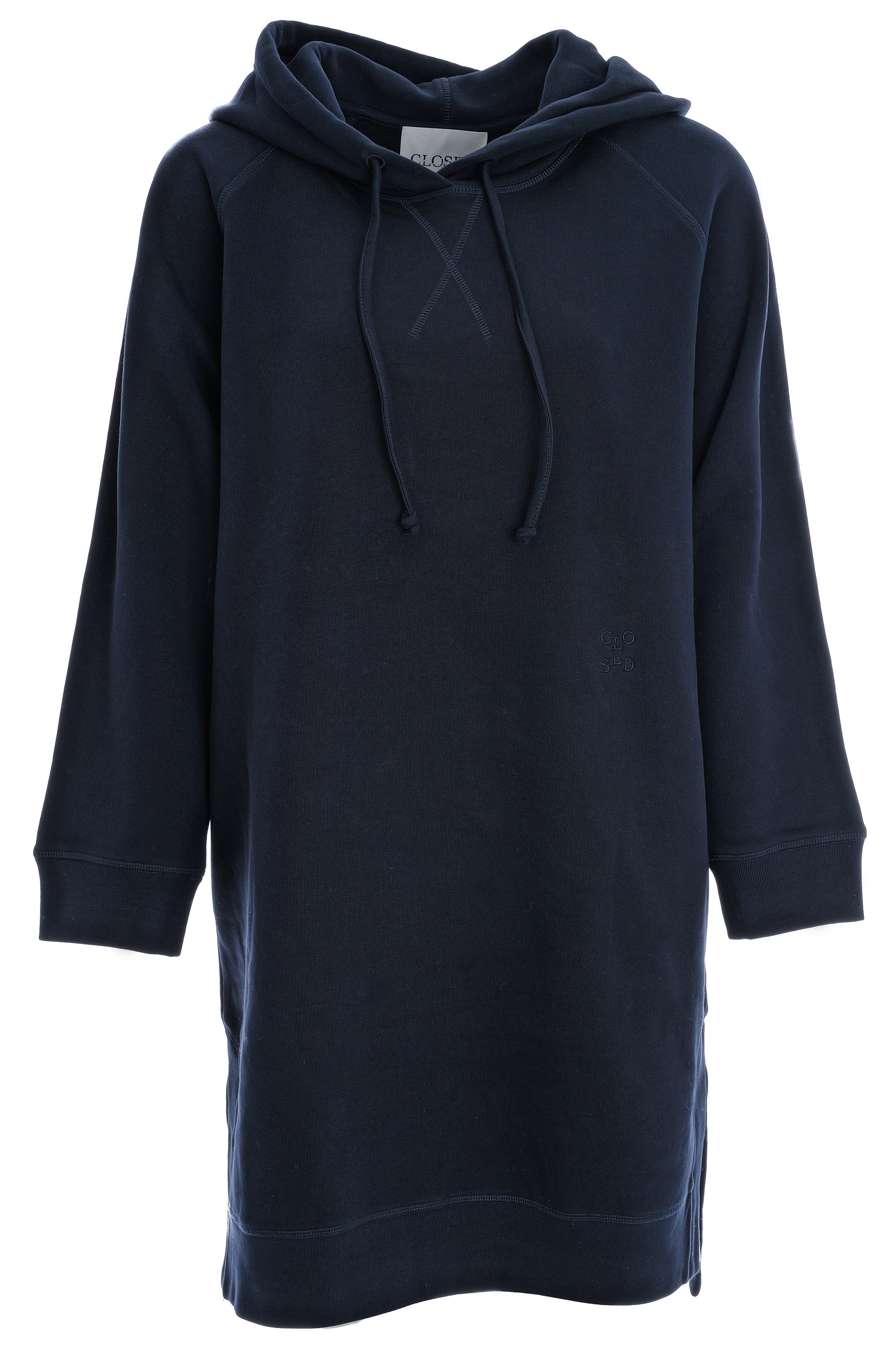 Das Hoodie-Kleid aus weicher Bio-Baumwolle mit gebürsteter Innenseite verbindet gemütlichen Tragekomfort mit modernen Details. Raglanärmel, ein verlängerter Rückensaum, praktische Seitentaschen sowie feine Akzente wie die Closed Monogramm-Stickerei und das Flatlock-Dreieck am Ausschnitt runden den lässig-eleganten Look ab.