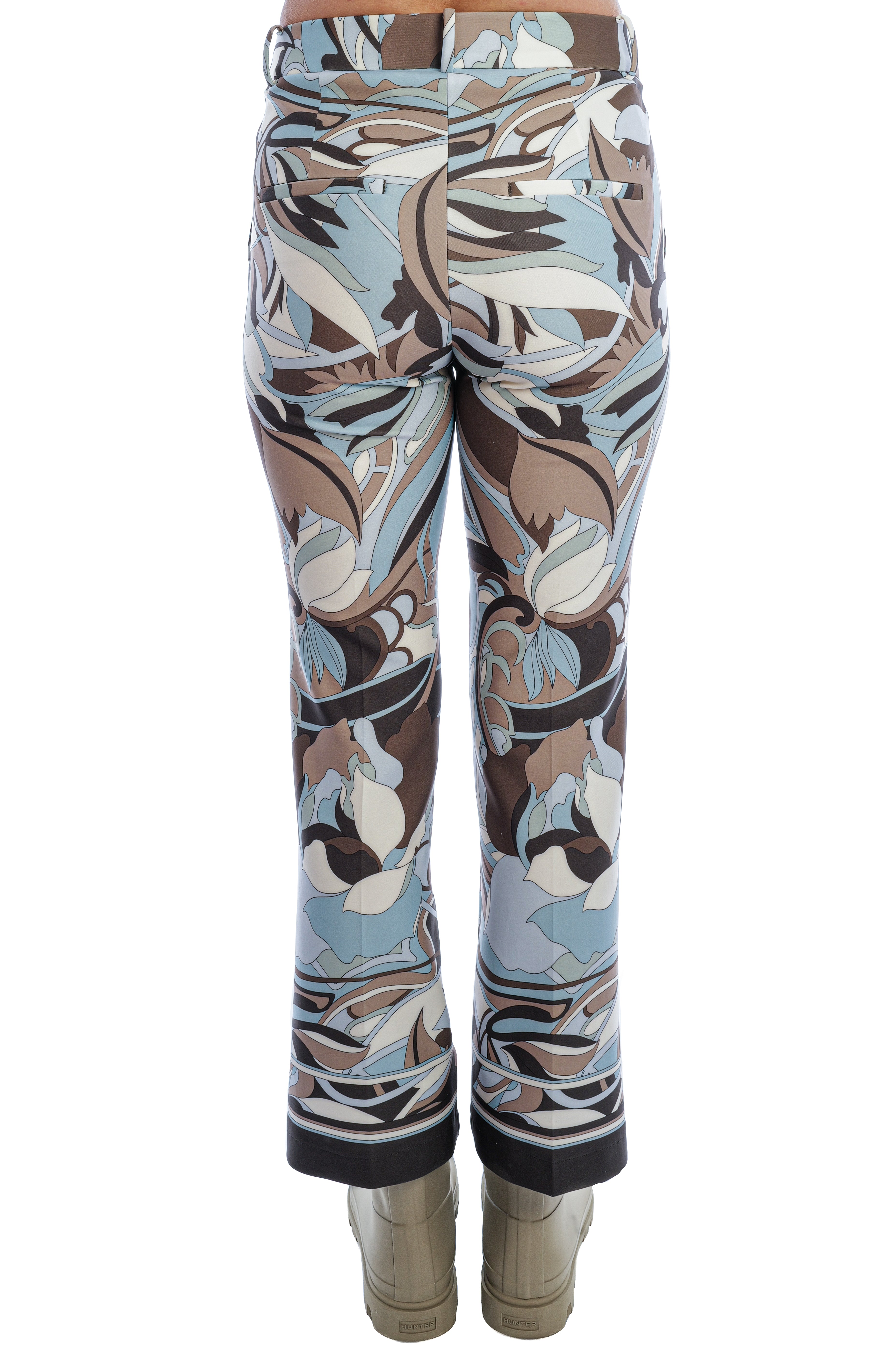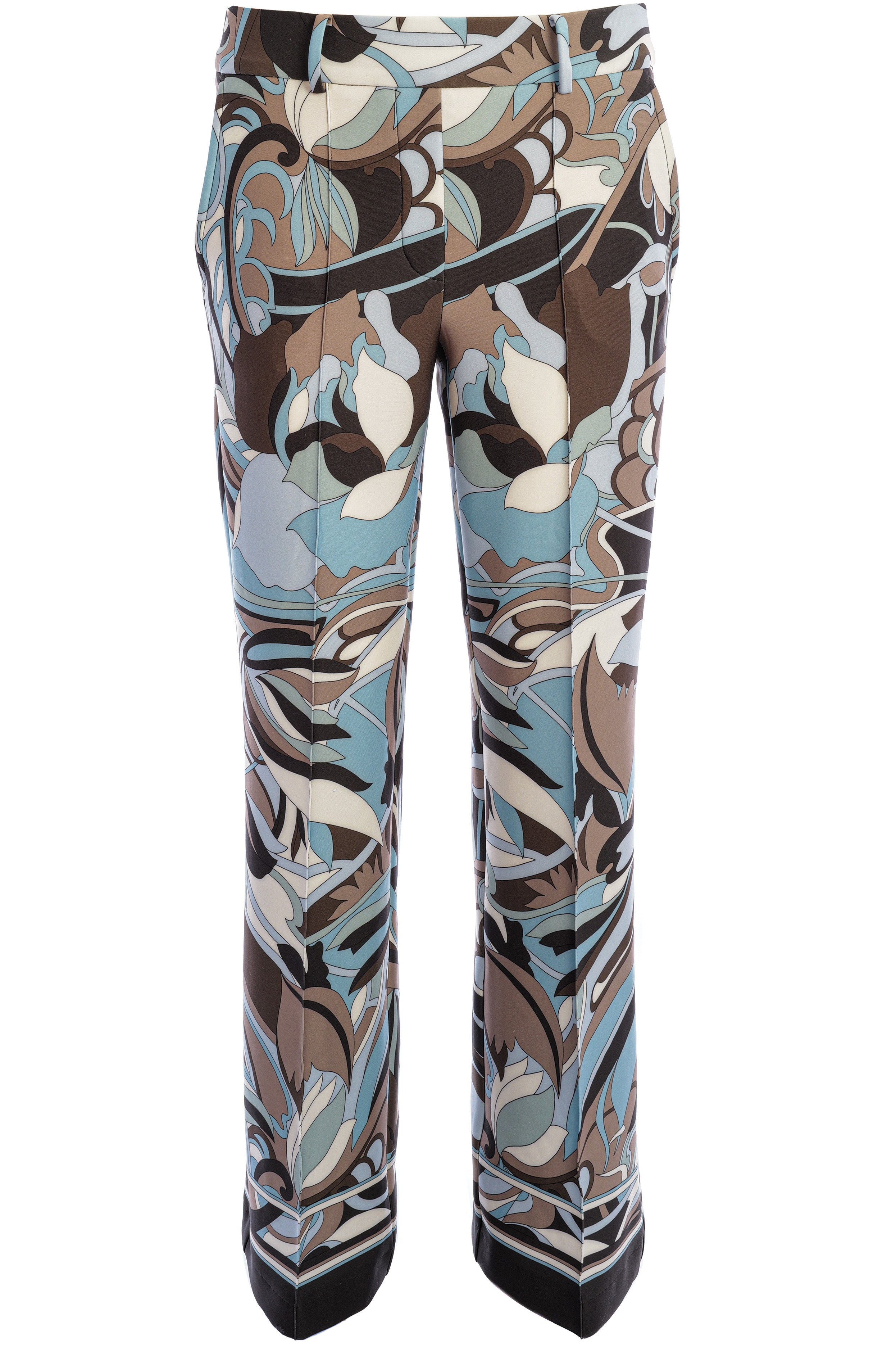 Hose mit hoher Leibhöhe und ausgestelltem Bein, veredelt durch feine Biesennähte und ein stilvolles Allover-Muster. Seitliche Eingrifftaschen, Leistentaschen am Gesäß und die glatte, weiche Haptik sorgen für Komfort und eine elegante Silhouette.