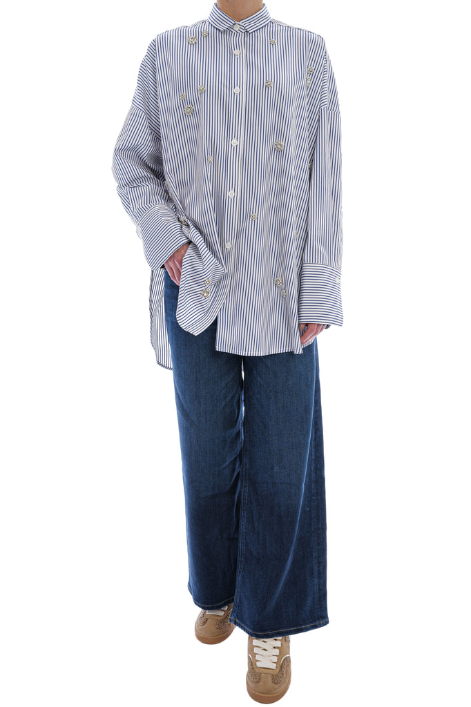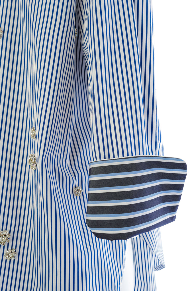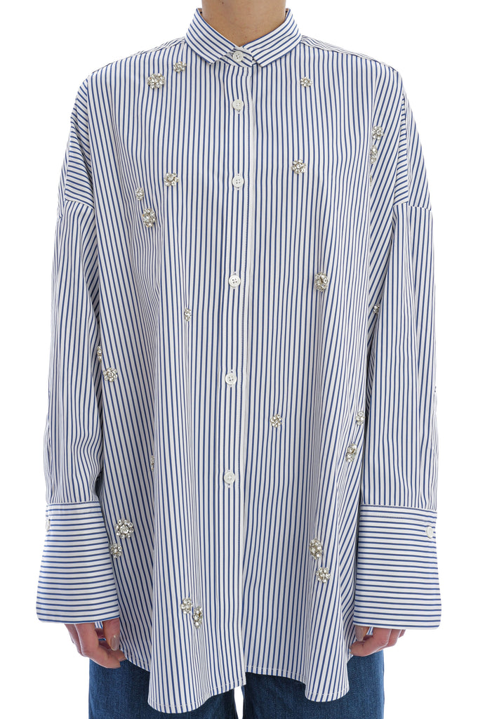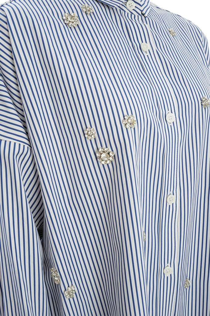 Diese weit geschnittene Bluse besticht durch einen modernen Haifischkragen, überschnittene Schultern und breite Manschetten mit Knopfdetail. Seitliche Schlitze und handgearbeitete Strassapplikationen in zarter Blütenform verleihen dem Design eine luxuriöse, feminine Note.