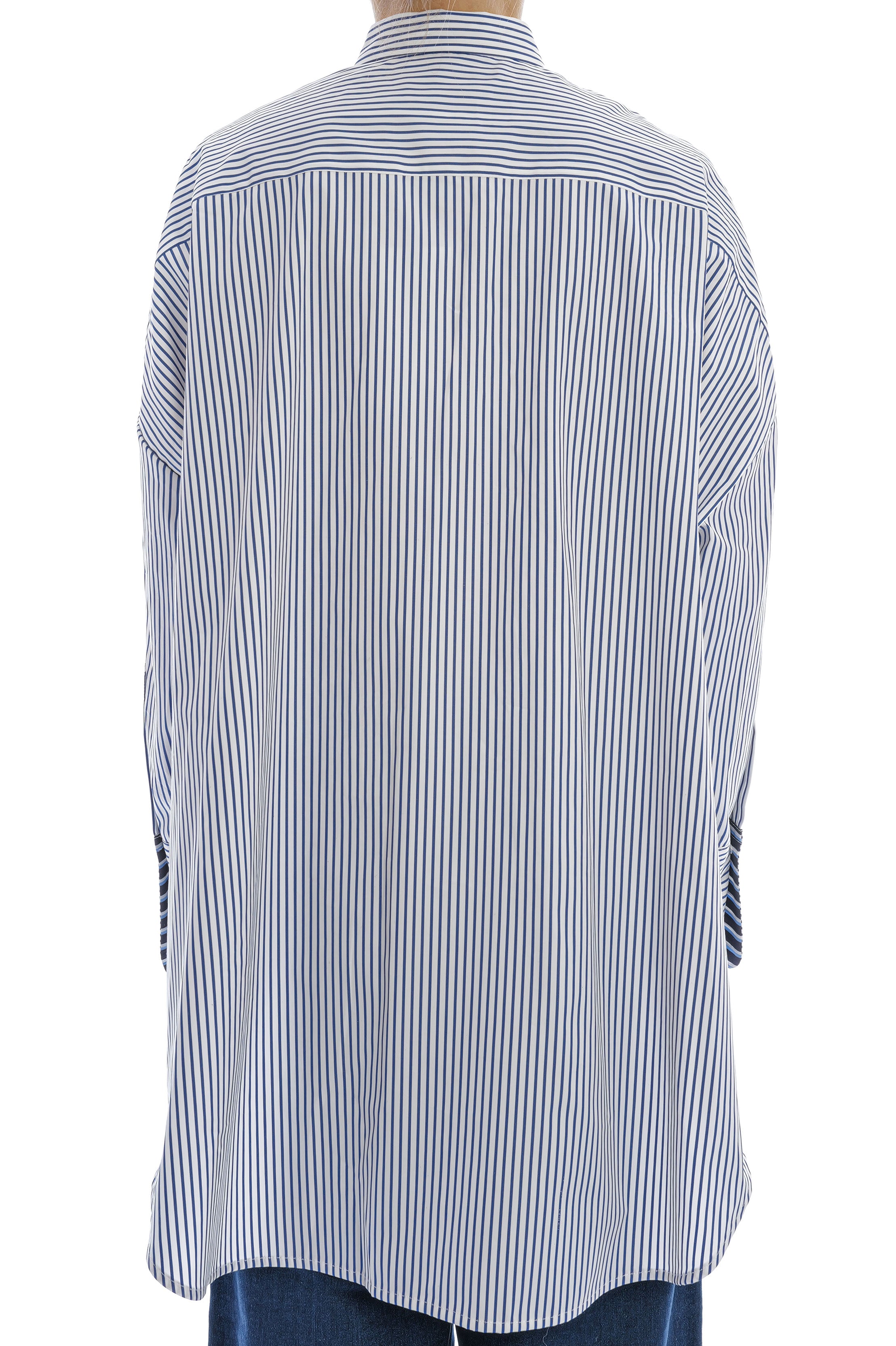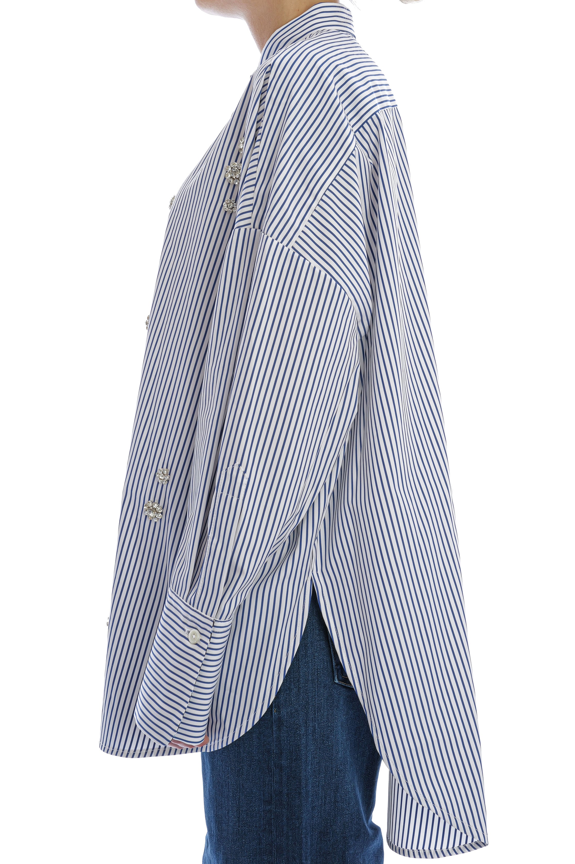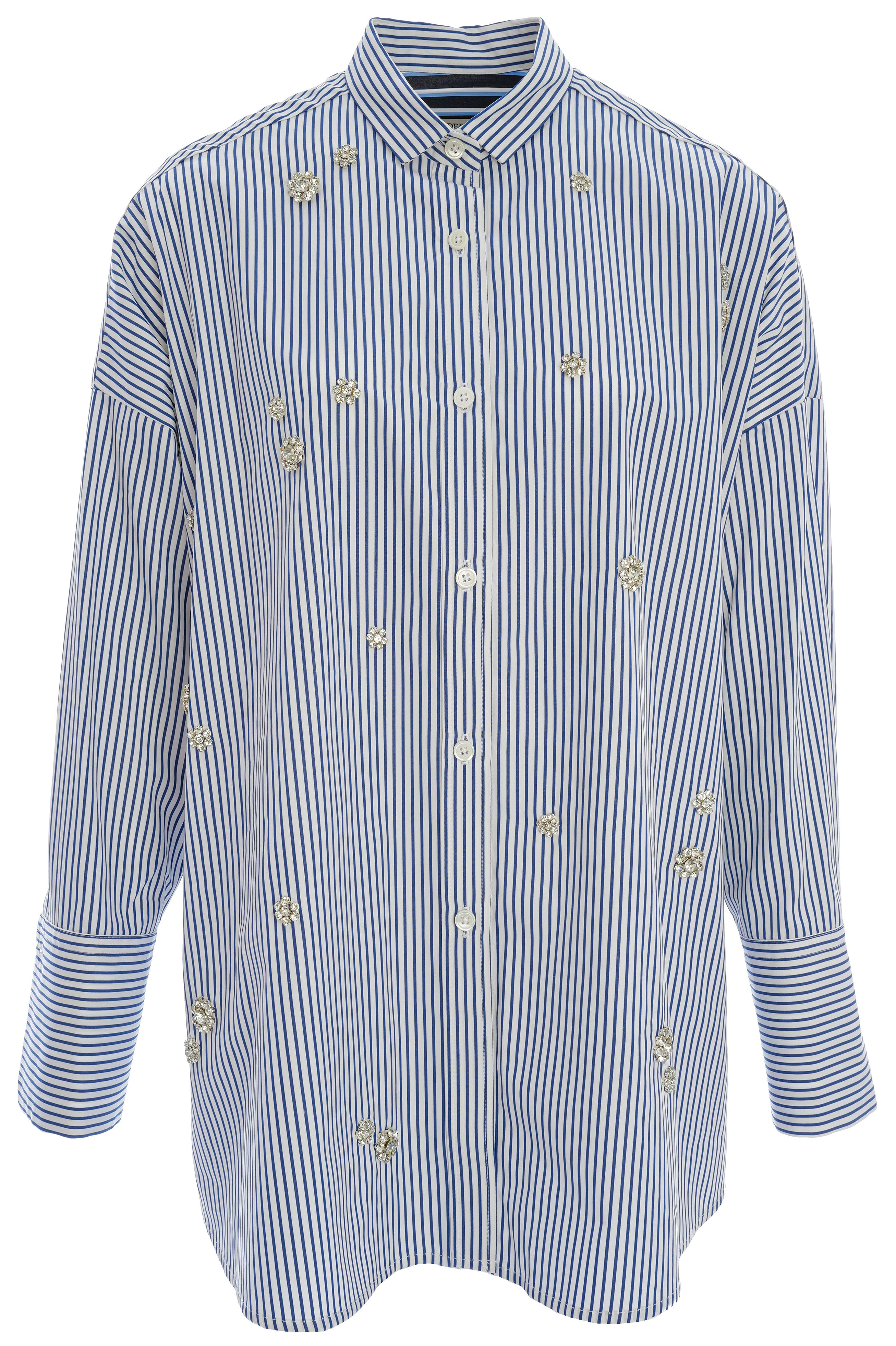 Diese weit geschnittene Bluse besticht durch einen modernen Haifischkragen, überschnittene Schultern und breite Manschetten mit Knopfdetail. Seitliche Schlitze und handgearbeitete Strassapplikationen in zarter Blütenform verleihen dem Design eine luxuriöse, feminine Note.