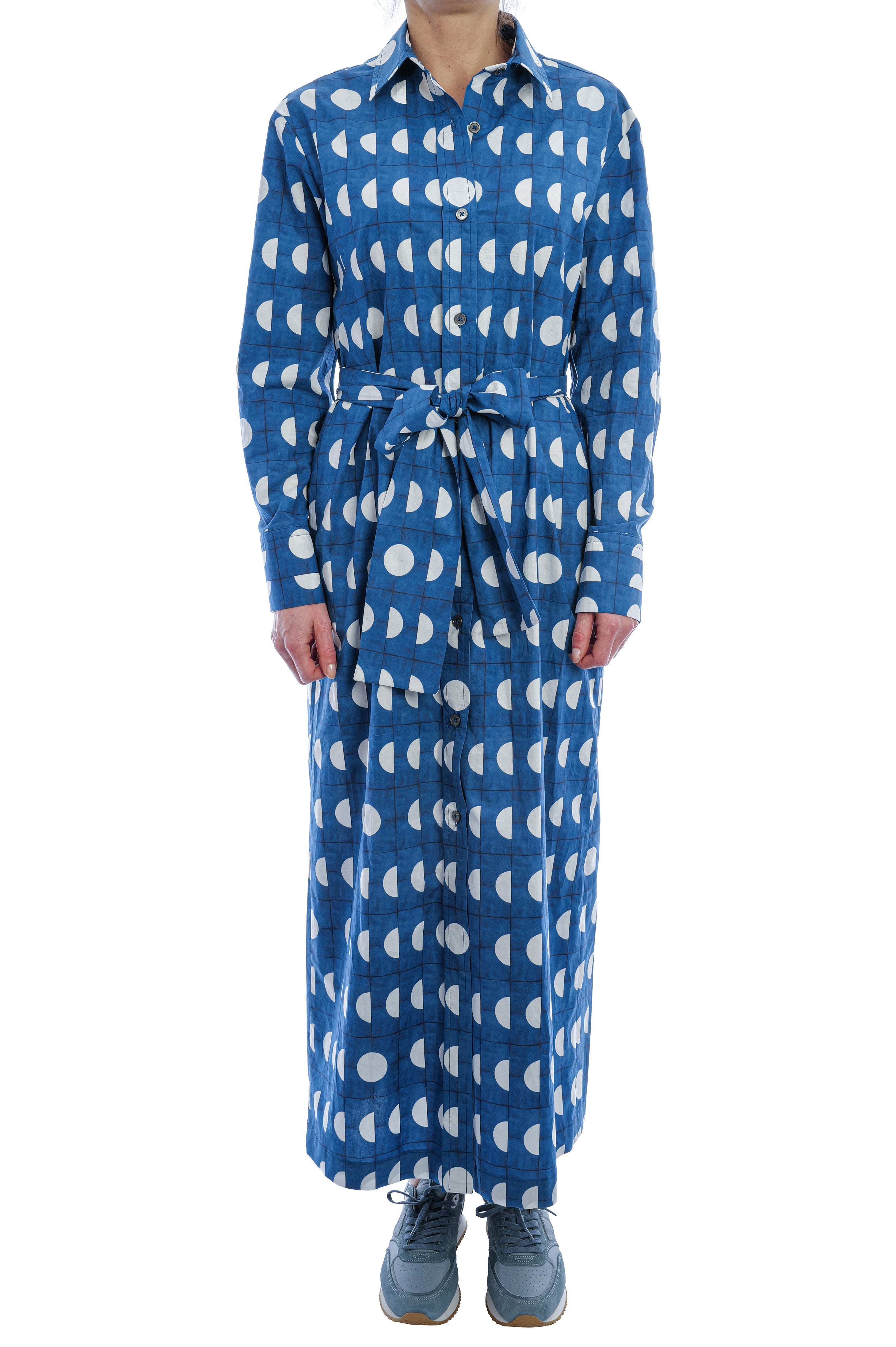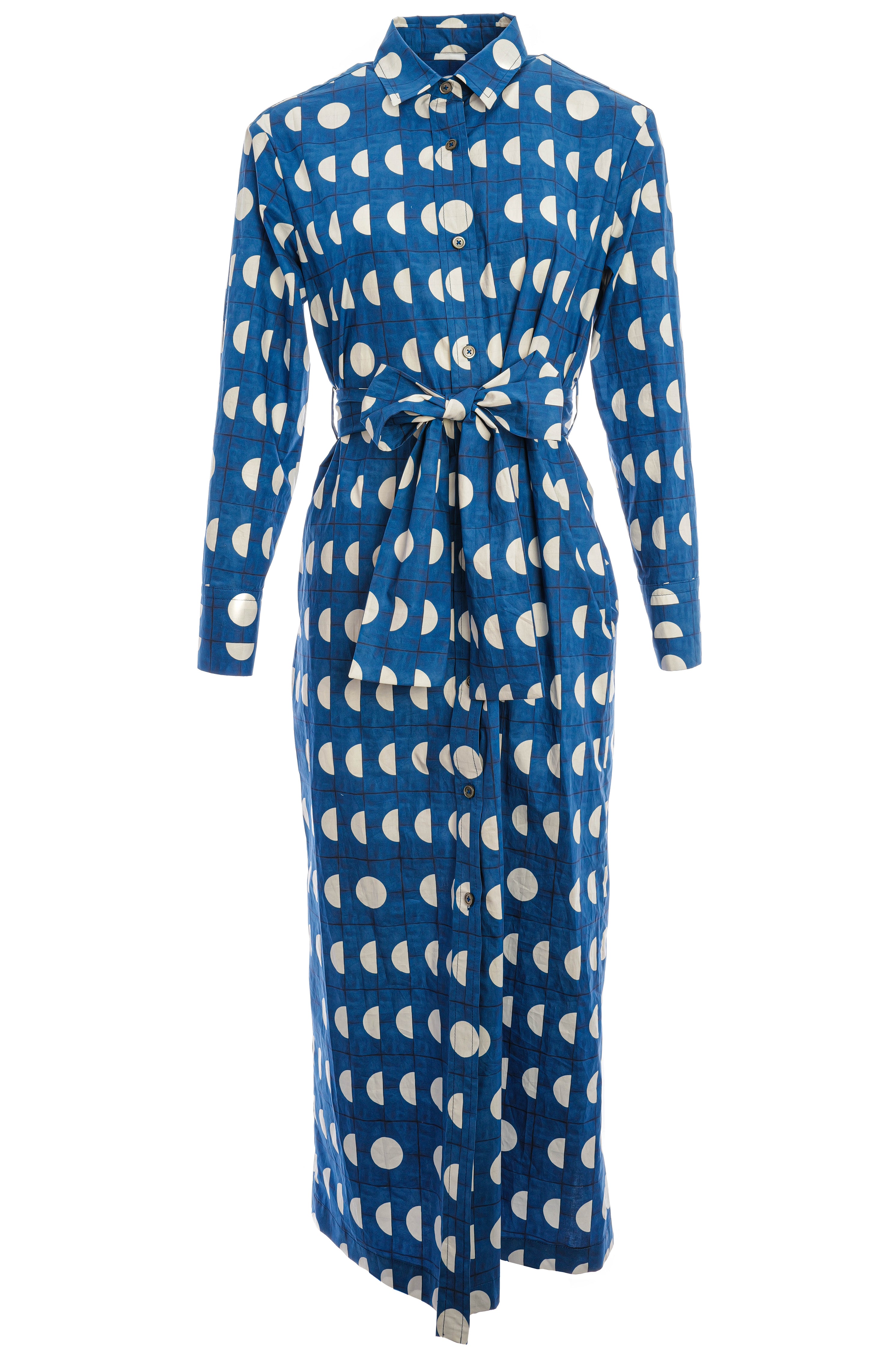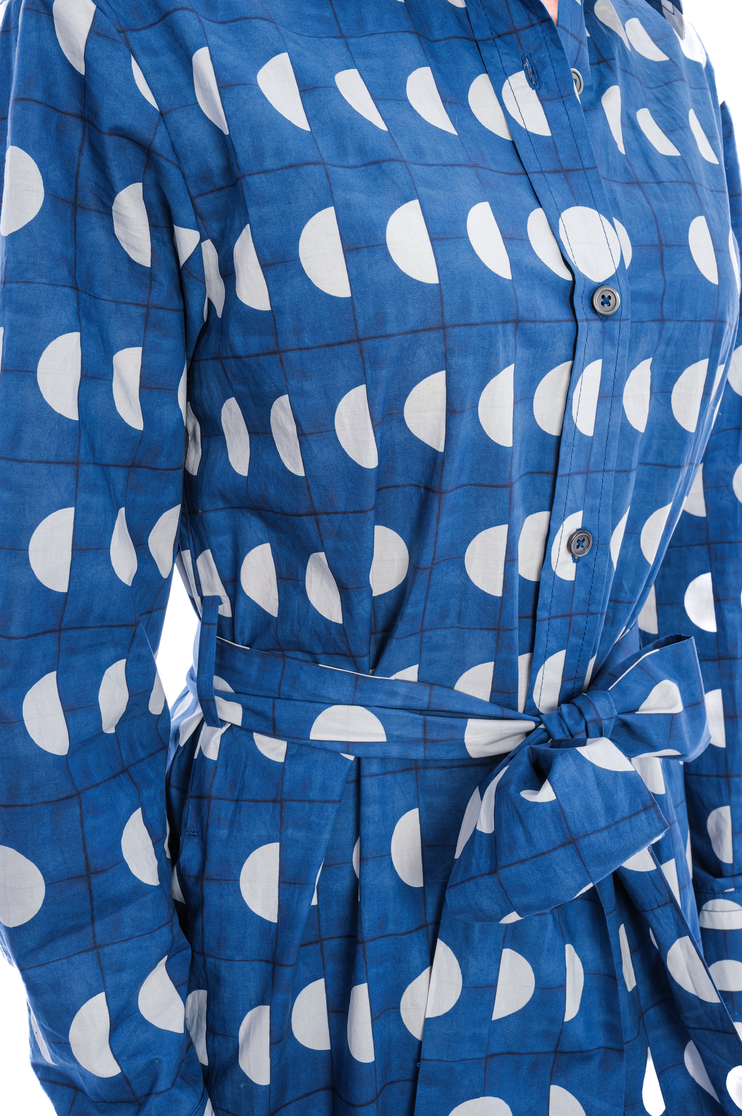 ODEEH steht für moderne, architektonische Silhouetten, hochwertige Materialien und grafische Prints. Dieses elegante Hemdblusenkleid von Odeeh überzeugt mit einer modernen grafischen Allover-Printkombination aus Halbkreisen und feinem Karomuster auf intensivem Blau. Die durchgehende Knopfleiste, der klassische Kragen und der bindbare Taillengürtel verleihen der fließenden Midi-Silhouette eine feminine Struktur und zeitlose Raffinesse.