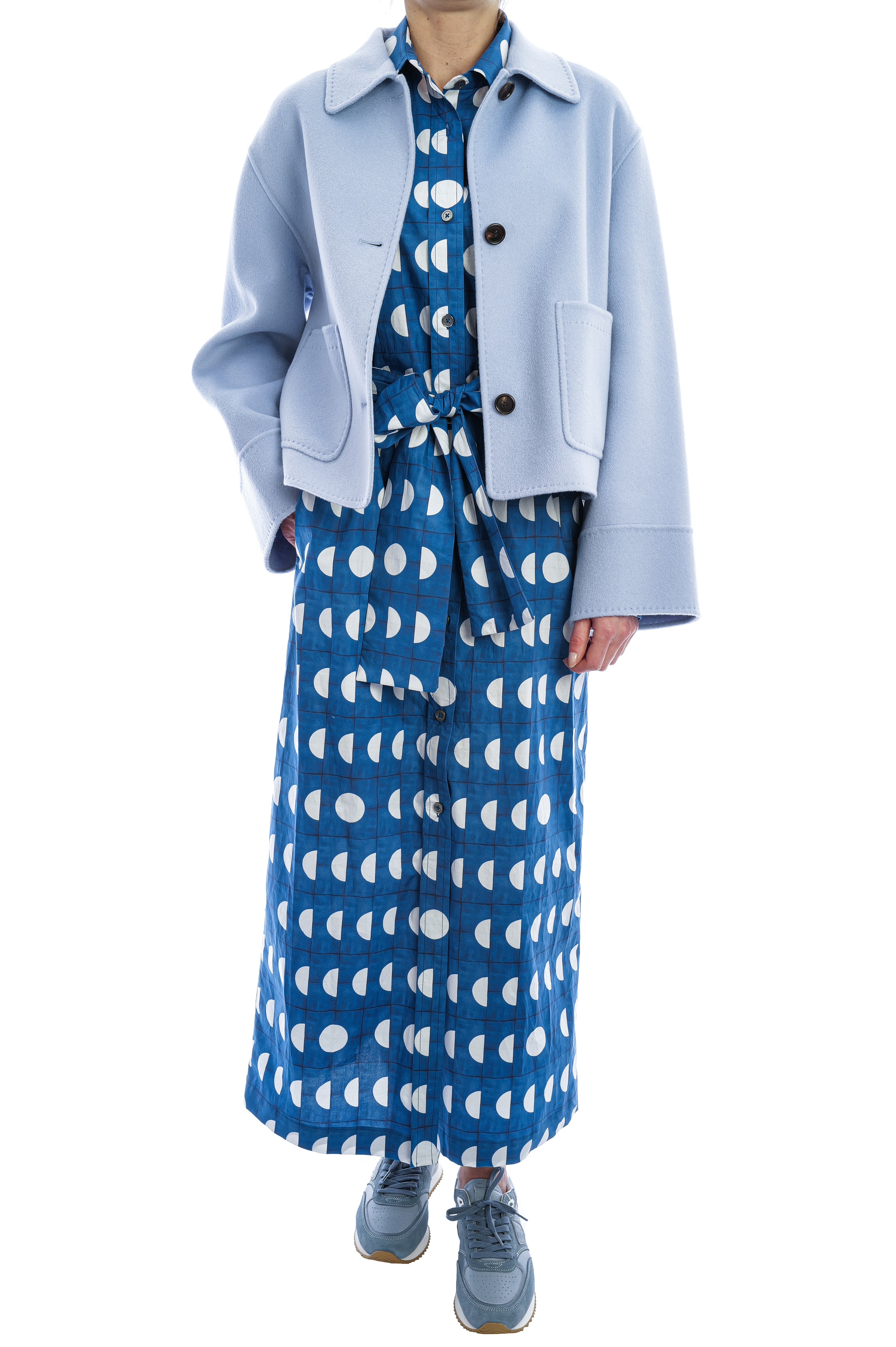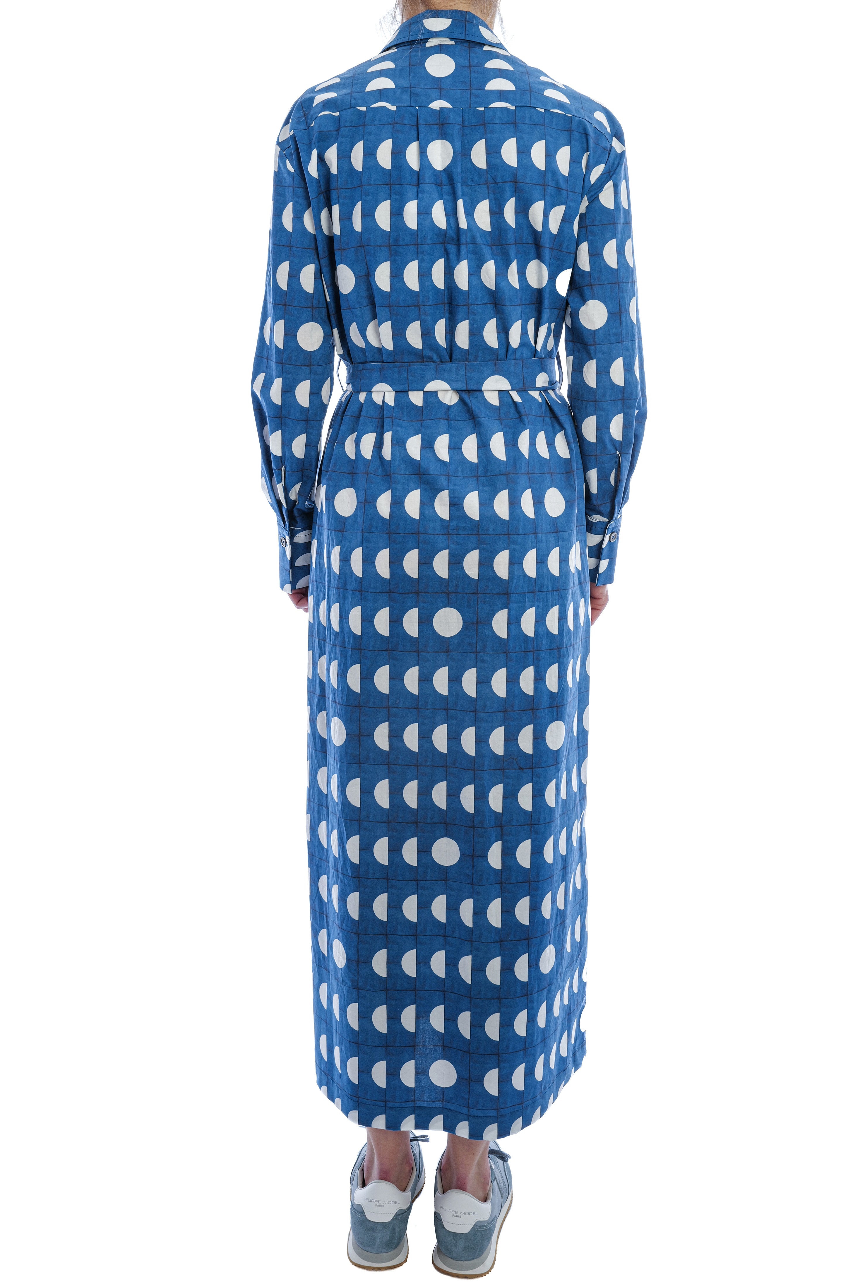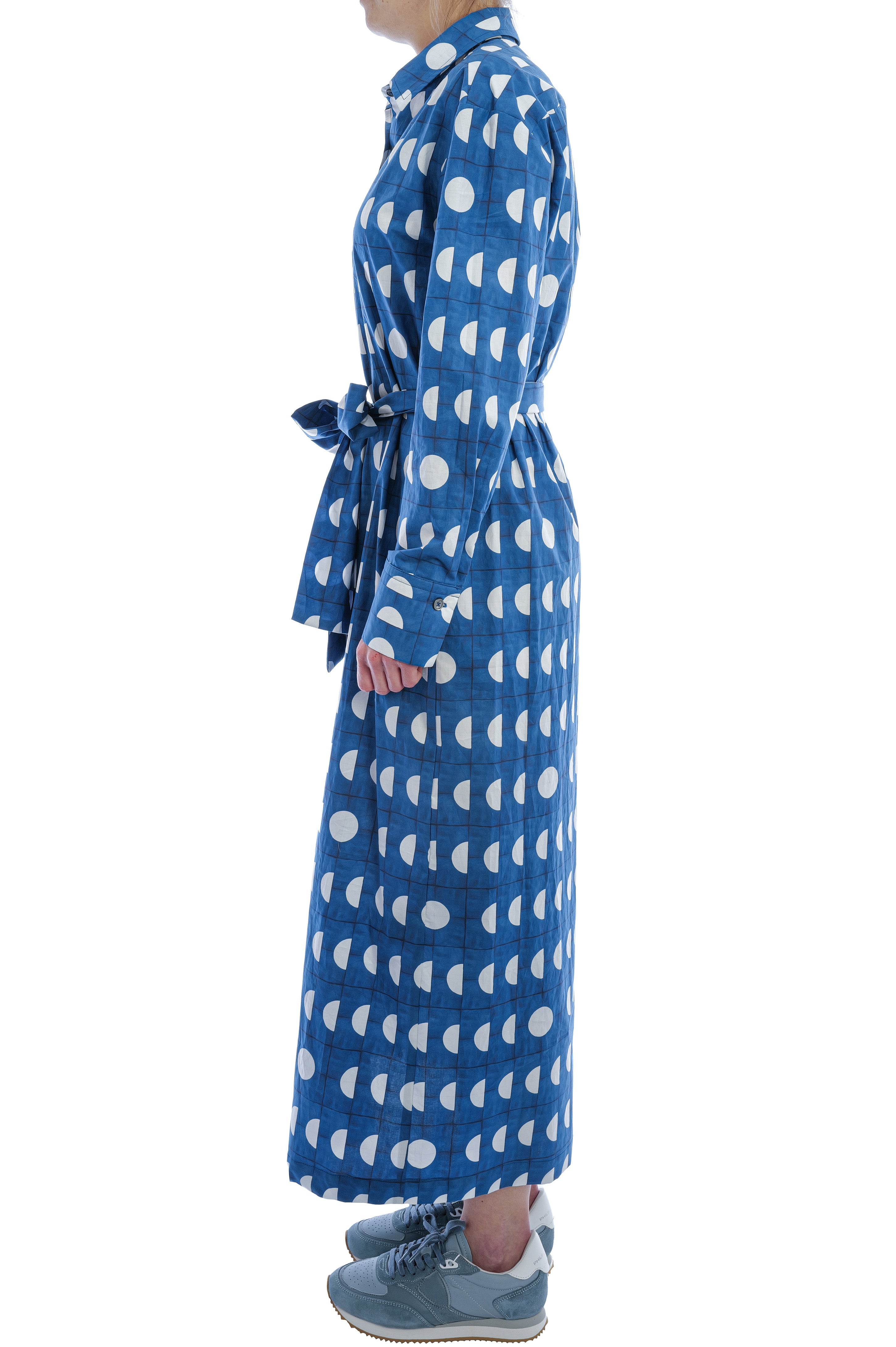 ODEEH steht für moderne, architektonische Silhouetten, hochwertige Materialien und grafische Prints. Dieses elegante Hemdblusenkleid von Odeeh überzeugt mit einer modernen grafischen Allover-Printkombination aus Halbkreisen und feinem Karomuster auf intensivem Blau. Die durchgehende Knopfleiste, der klassische Kragen und der bindbare Taillengürtel verleihen der fließenden Midi-Silhouette eine feminine Struktur und zeitlose Raffinesse.