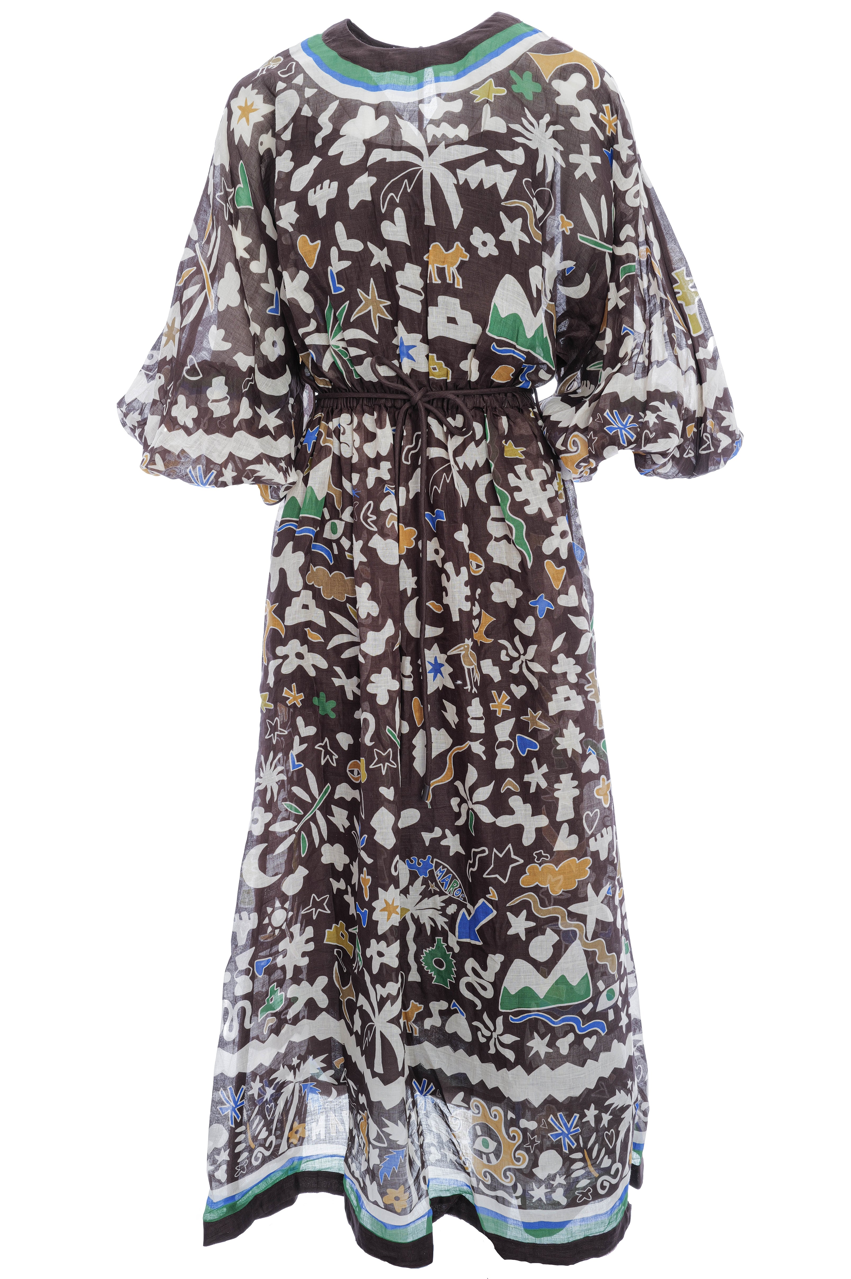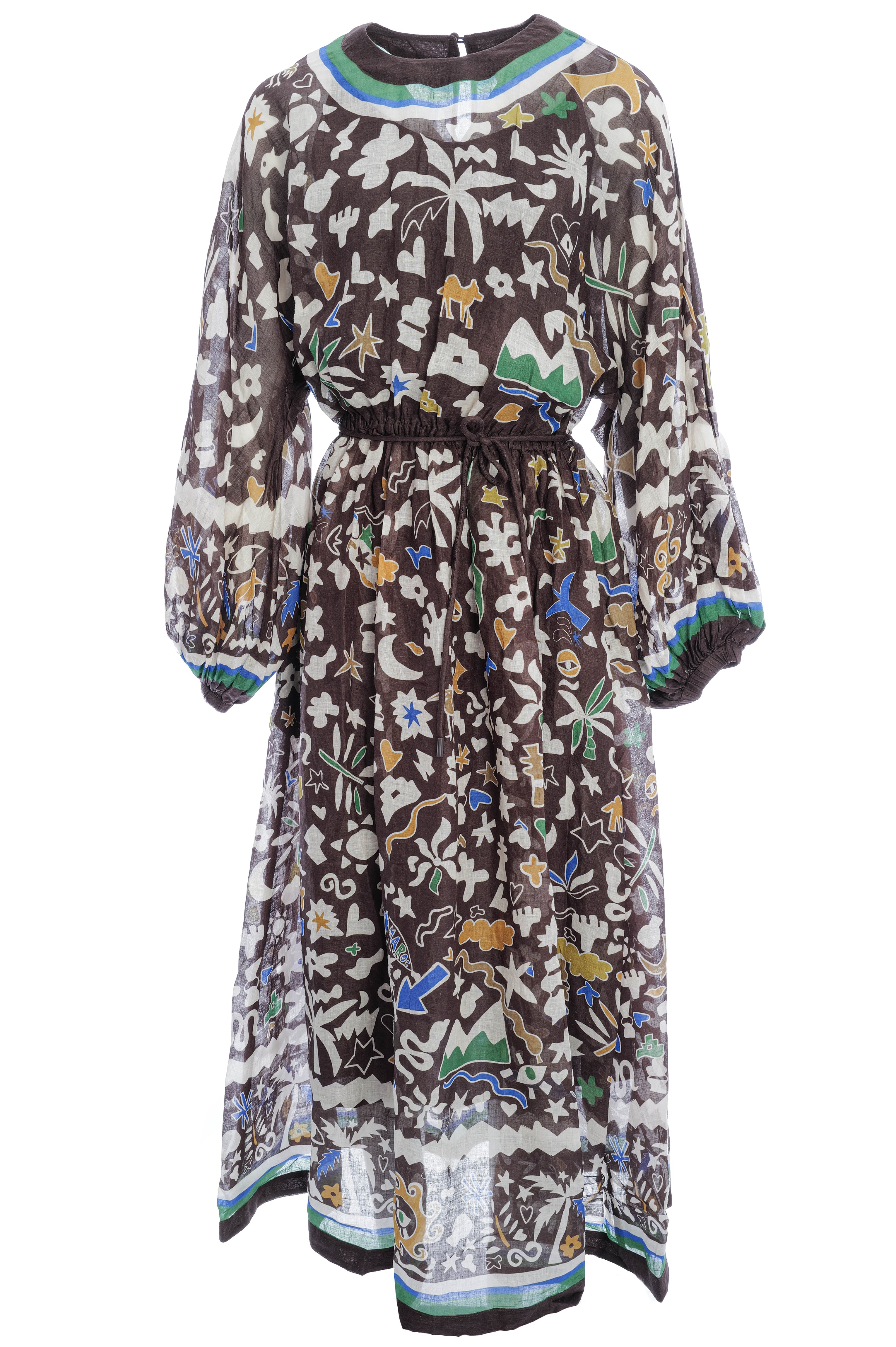 Das lange Kleid überzeugt mit entspannter Silhouette, rundem Ausschnitt und einem Verschluss mit Knopf und Schlaufe am Nacken. Elastische Bündchen an den Ärmeln sowie ein elastischer Taillenbund sorgen für Komfort, während das Kleid aus 100 % Ramie gefertigt ist.