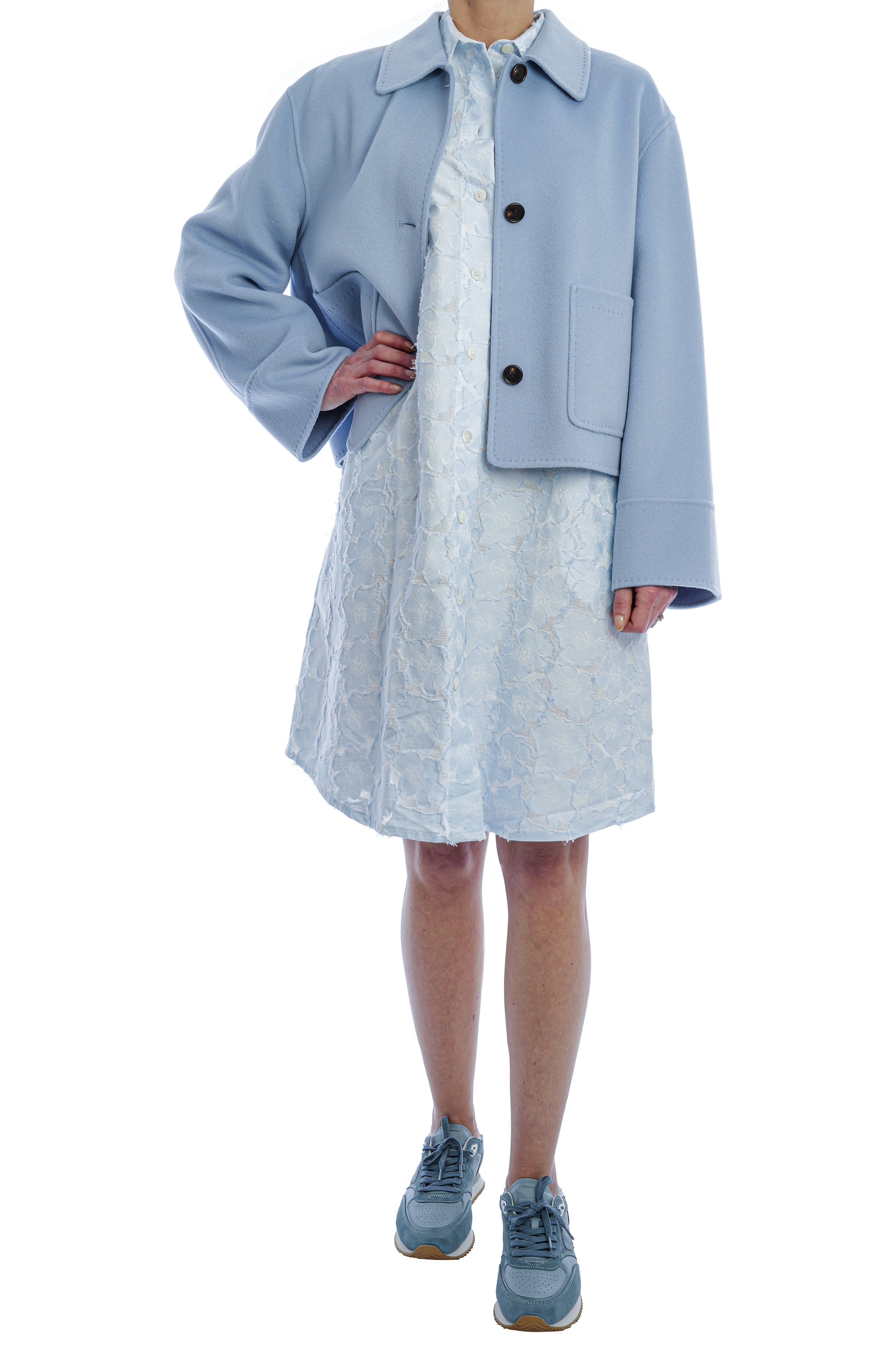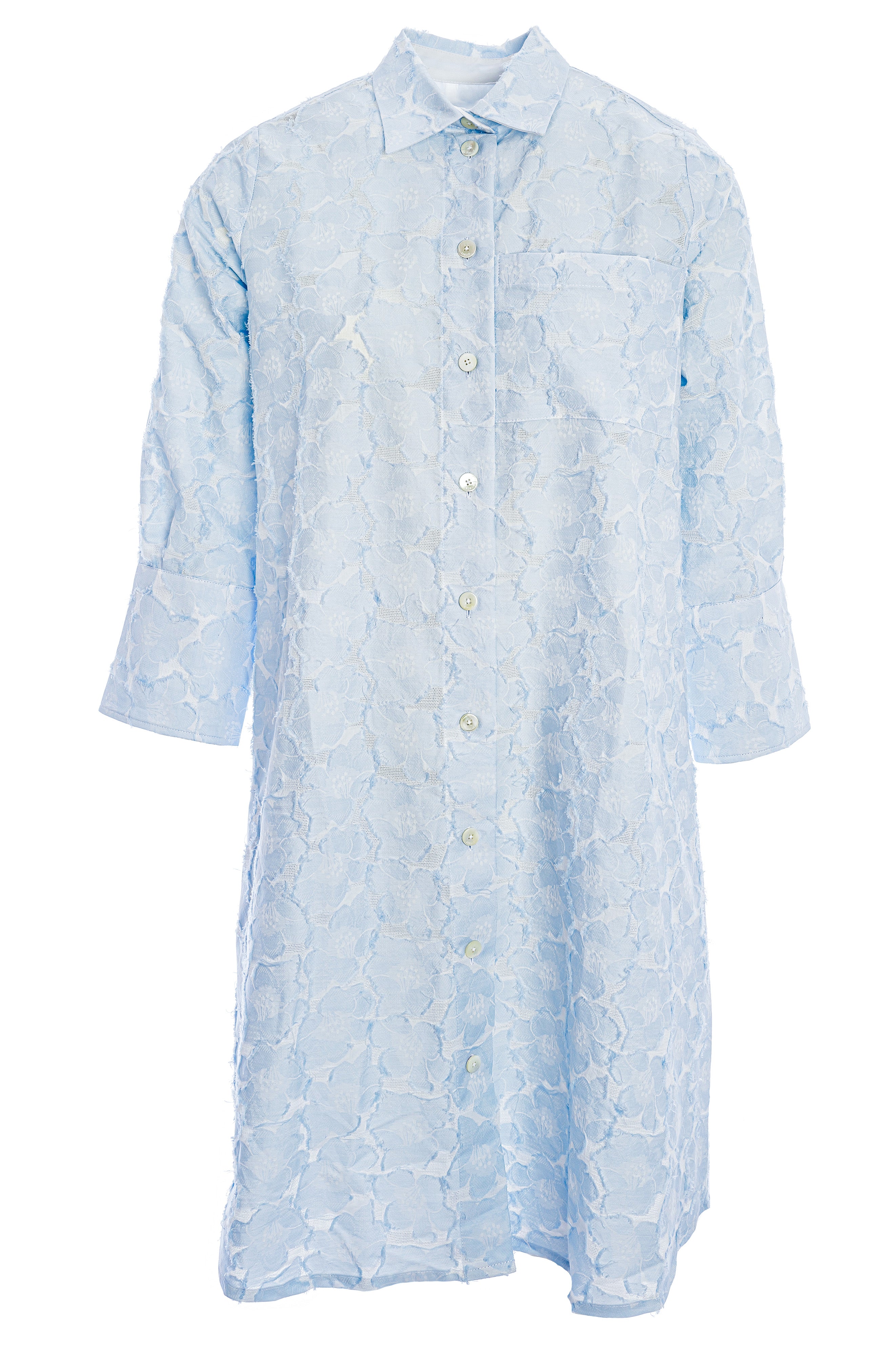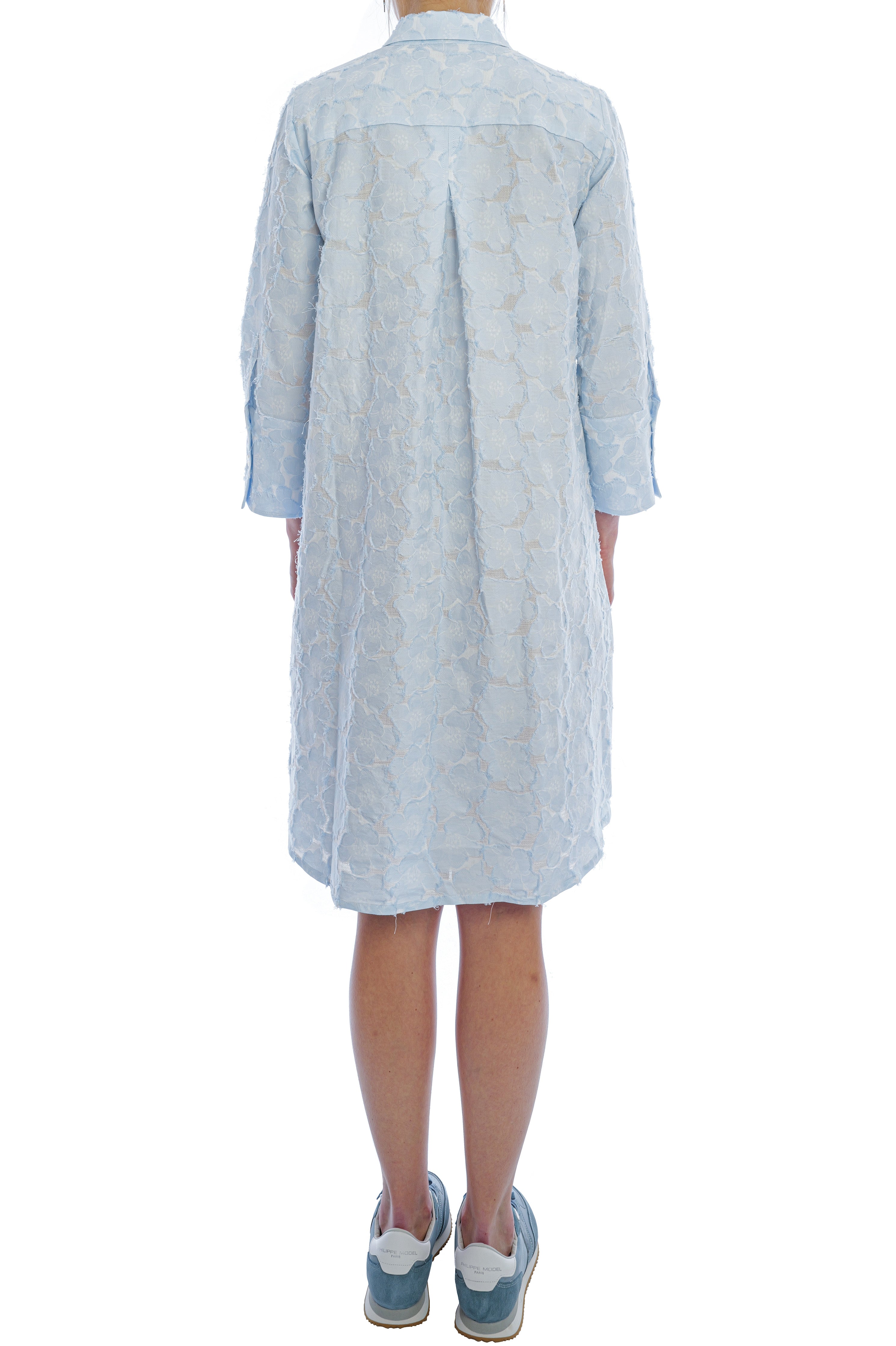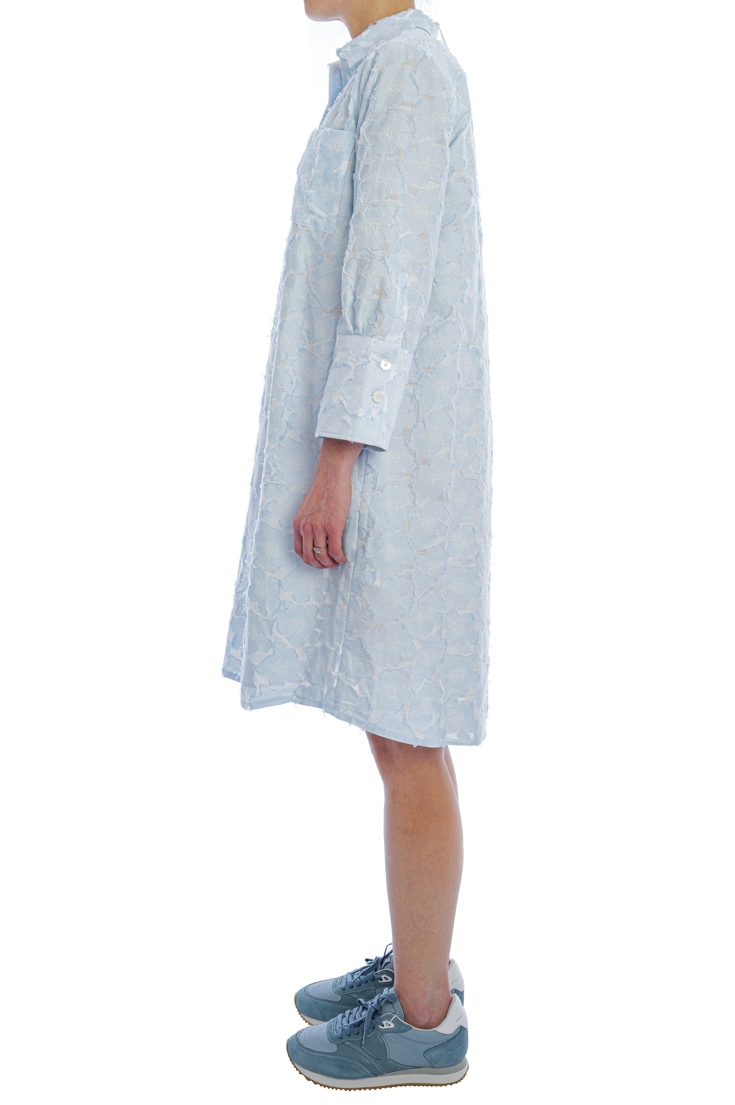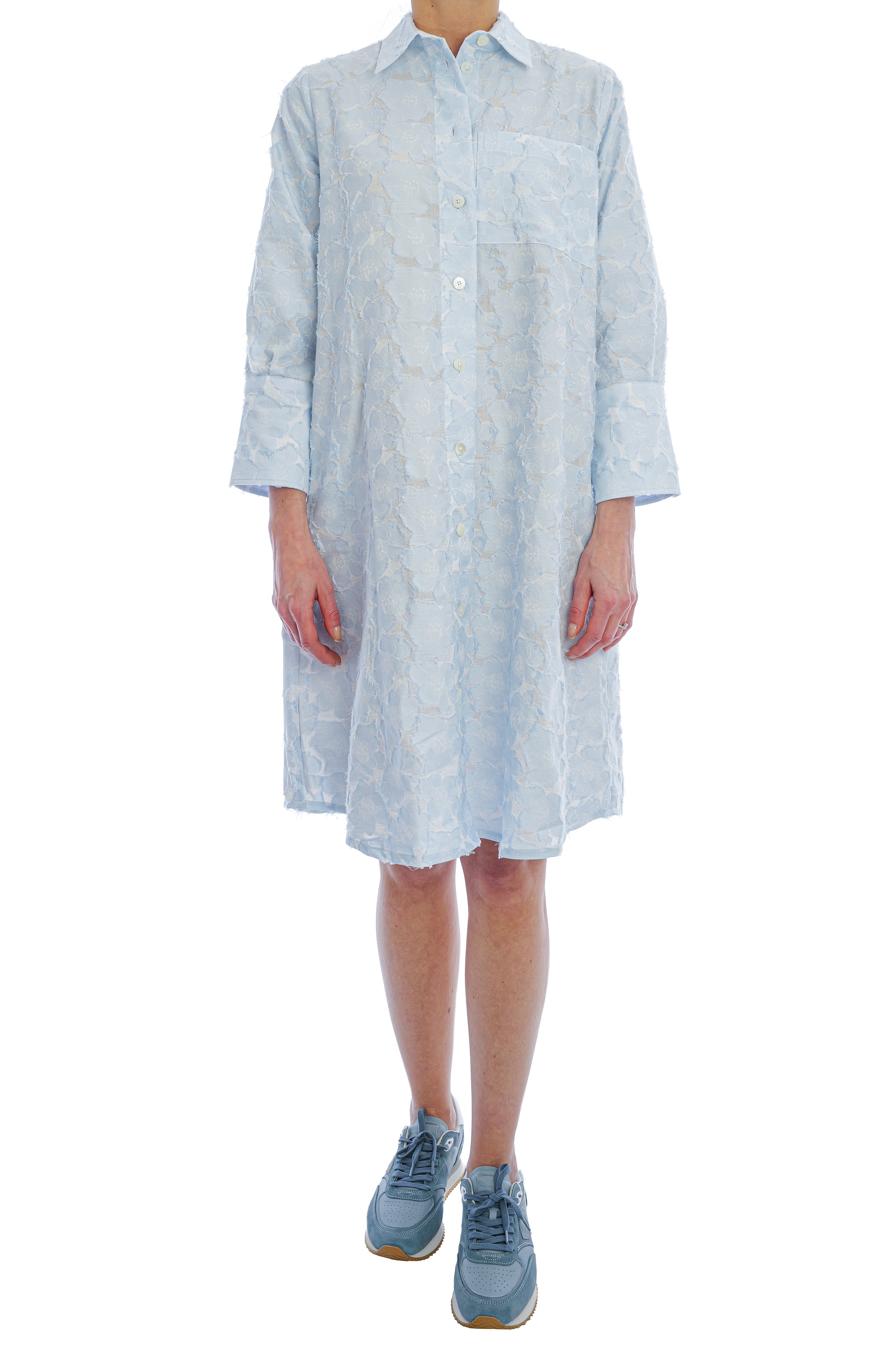 Das Kleid von Edelle überzeugt mit seiner entspannten, leicht ausgestellten Silhouette, klassischem Hemdkragen und einer durchgehenden Knopfleiste, die dem Design eine zeitlose Eleganz verleiht. Das hochwertige, fein strukturierte Material mit floraler Prägung sorgt für eine edle Optik, angenehme Leichtigkeit und ein besonders komfortables Tragegefühl.