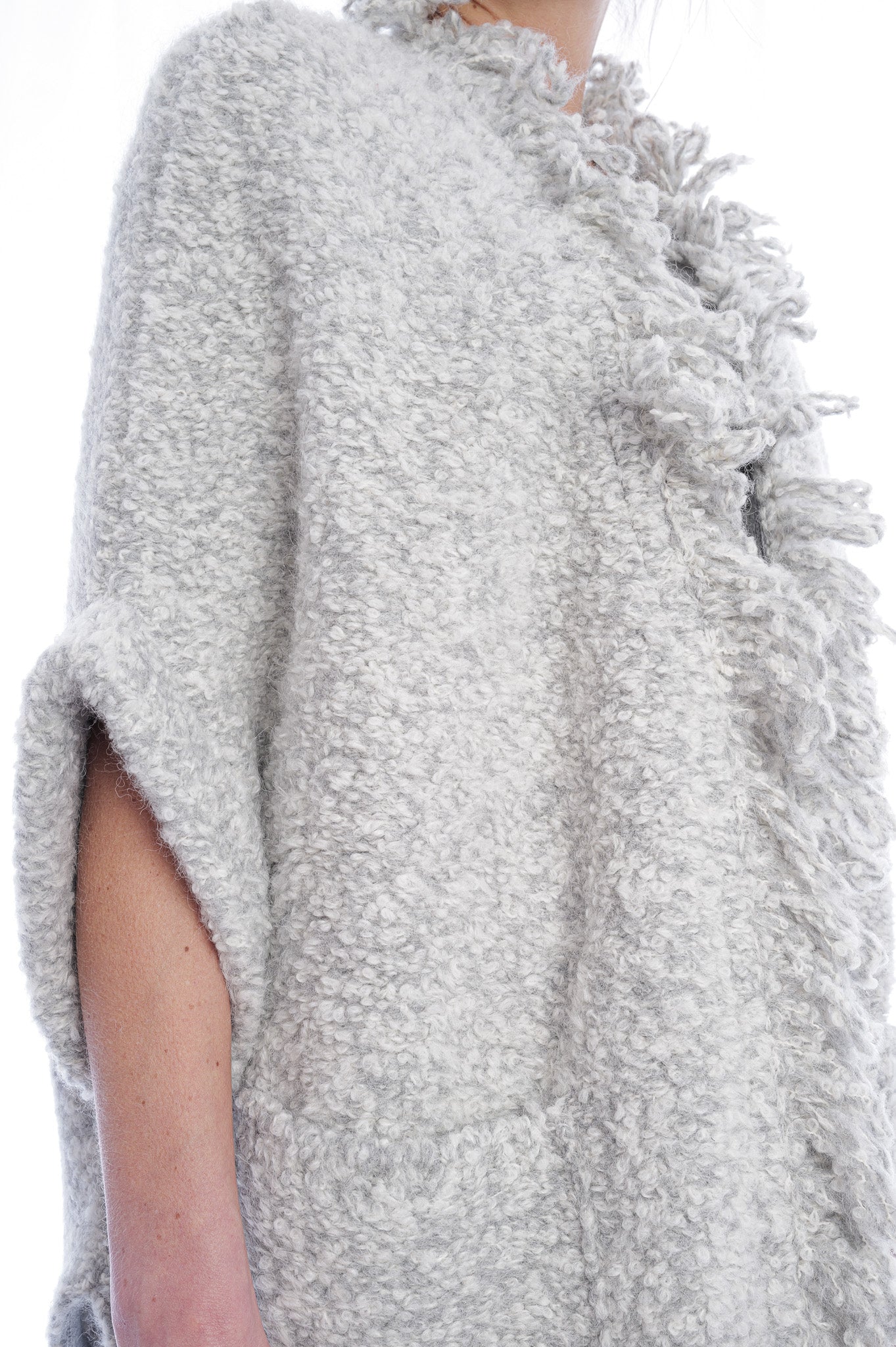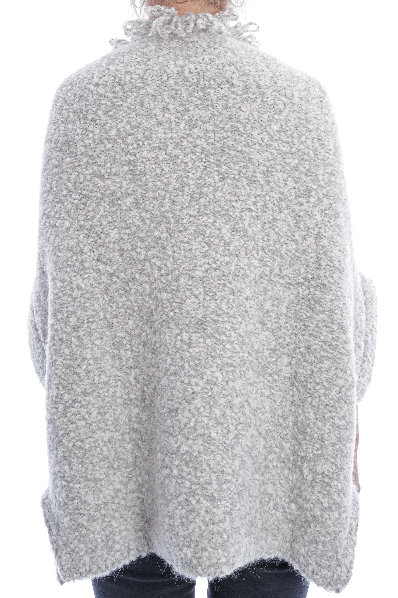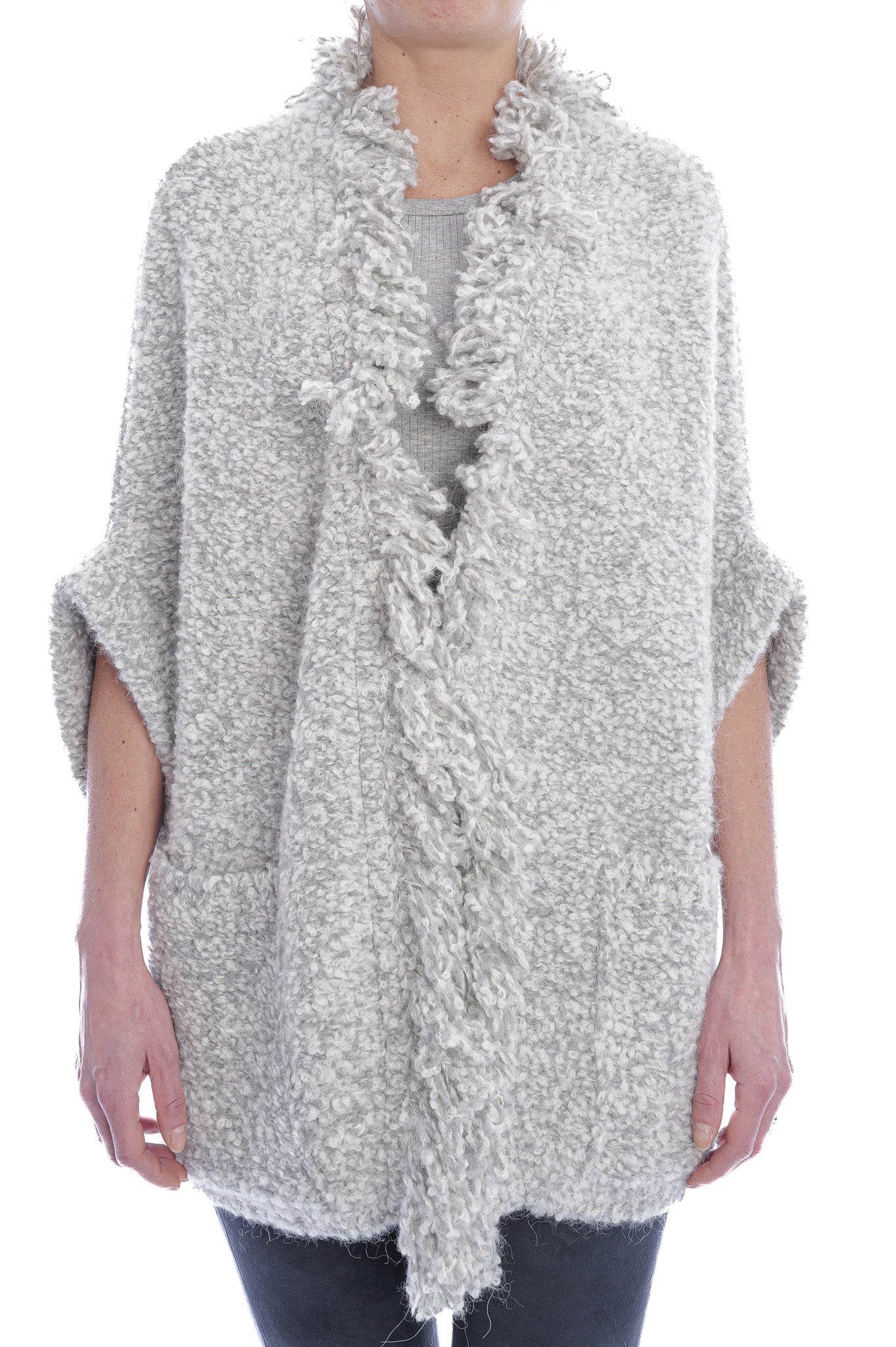 Grob gestricktes Cape in grau melierter Optik mit dekorativem Fransensaum am Verschluss. Das Modell verfügt über halbe Ärmel und ist länger geschnitten, wodurch es locker fällt und angenehm wärmt. Ein stilvolles Layering-Piece mit lässigem Charakter.