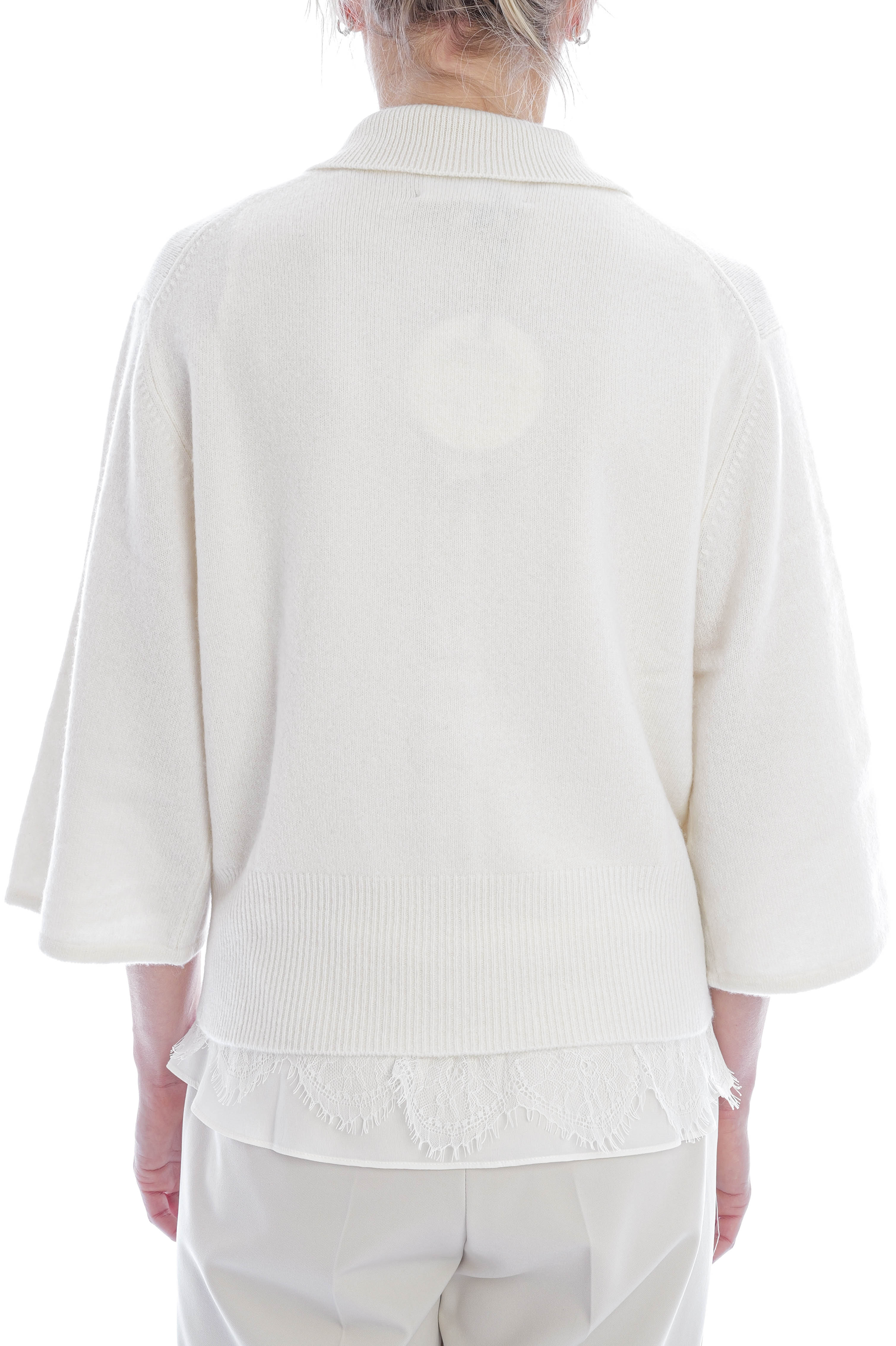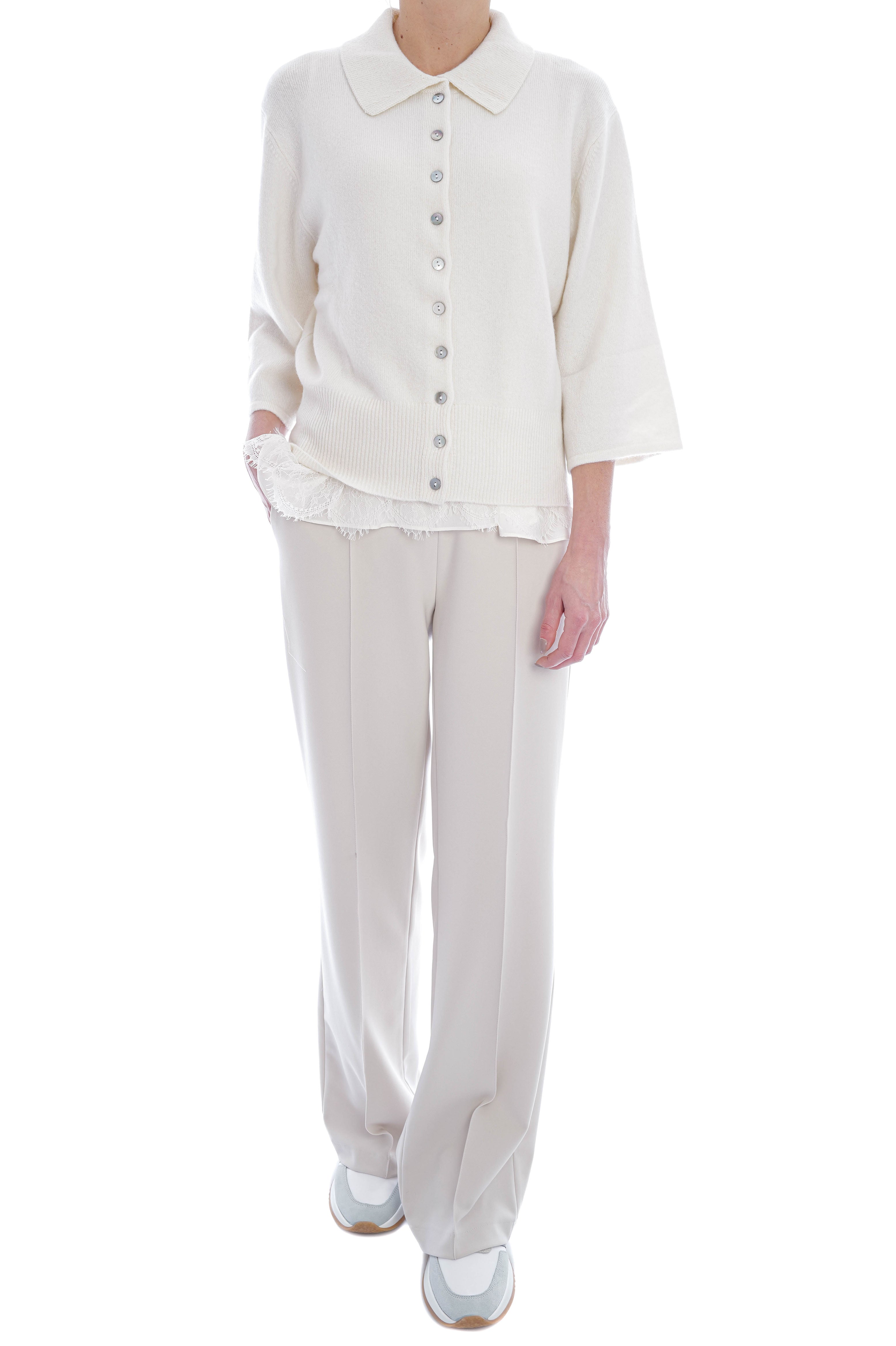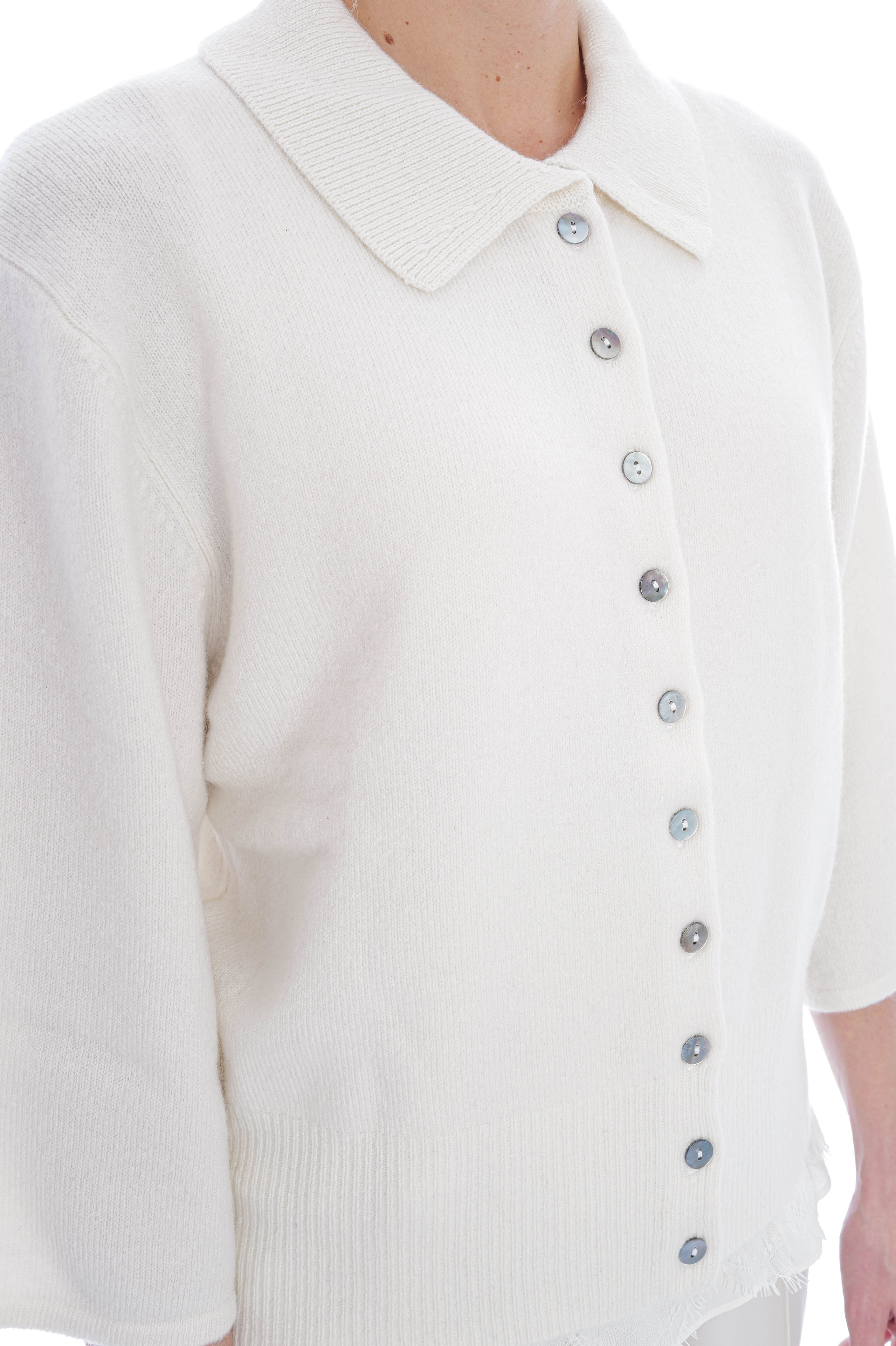 Der Pullover aus Glattstrick besticht durch seine weiche Haptik, leicht V-förmige Passform und elegante 3/4-Ärmel. Ein gerippter Polokragen und edle Perlmuttknöpfe runden das stilvolle Design harmonisch ab – perfekt für klassische und raffinierte Looks.