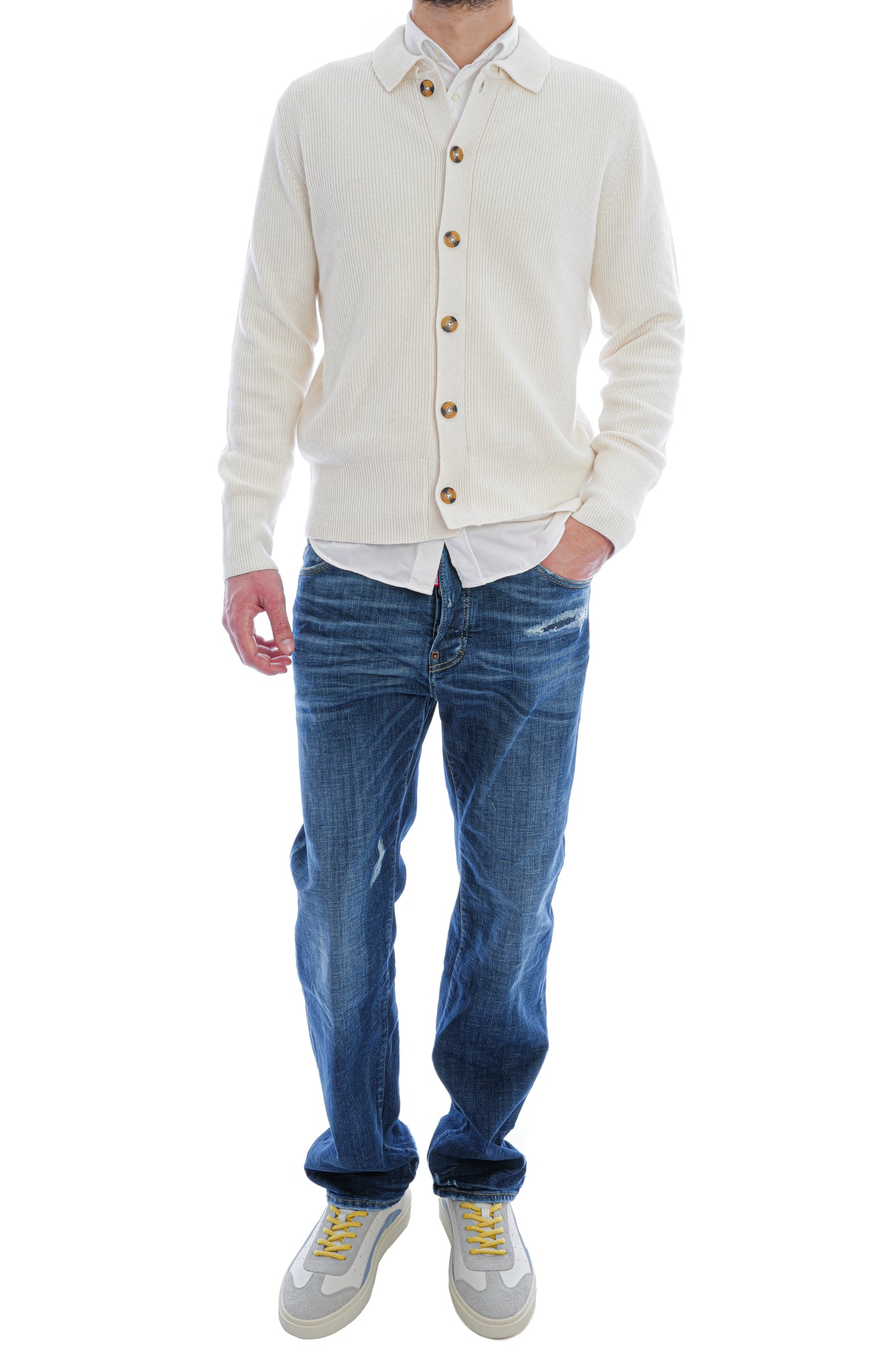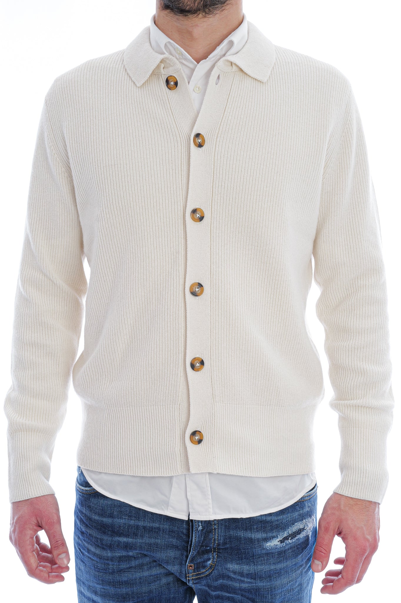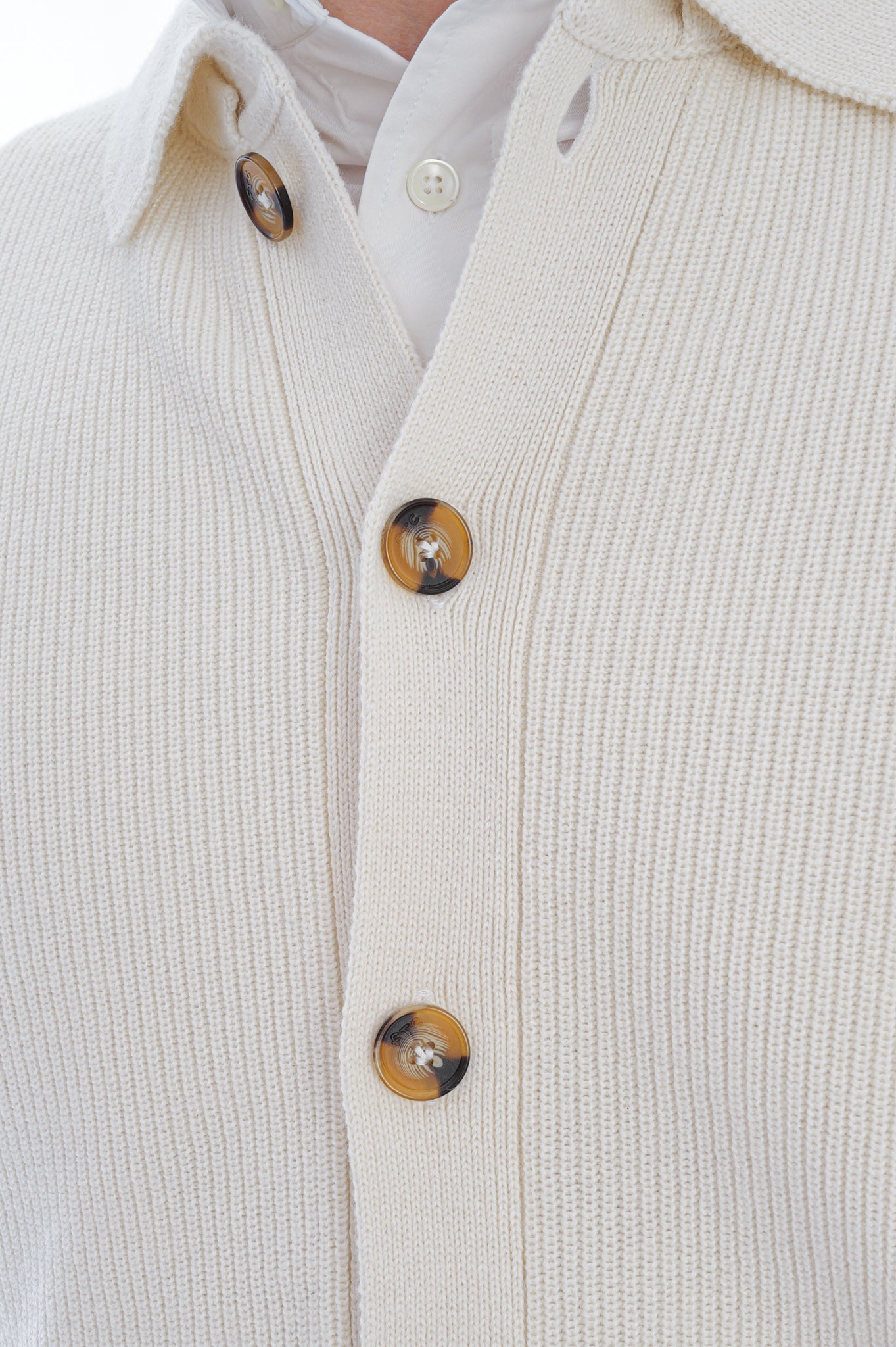 Der Pullover aus Halbpatentstrick bietet eine markante Struktur, lange Ärmel mit gerippten Abschlüssen und einen Hemdkragen für eine klare, angezogene Optik. Gerippter Saum und durchgehende Knopfleiste mit klaren Nahtverläufen sorgen für definierte Form und sauberen Look.