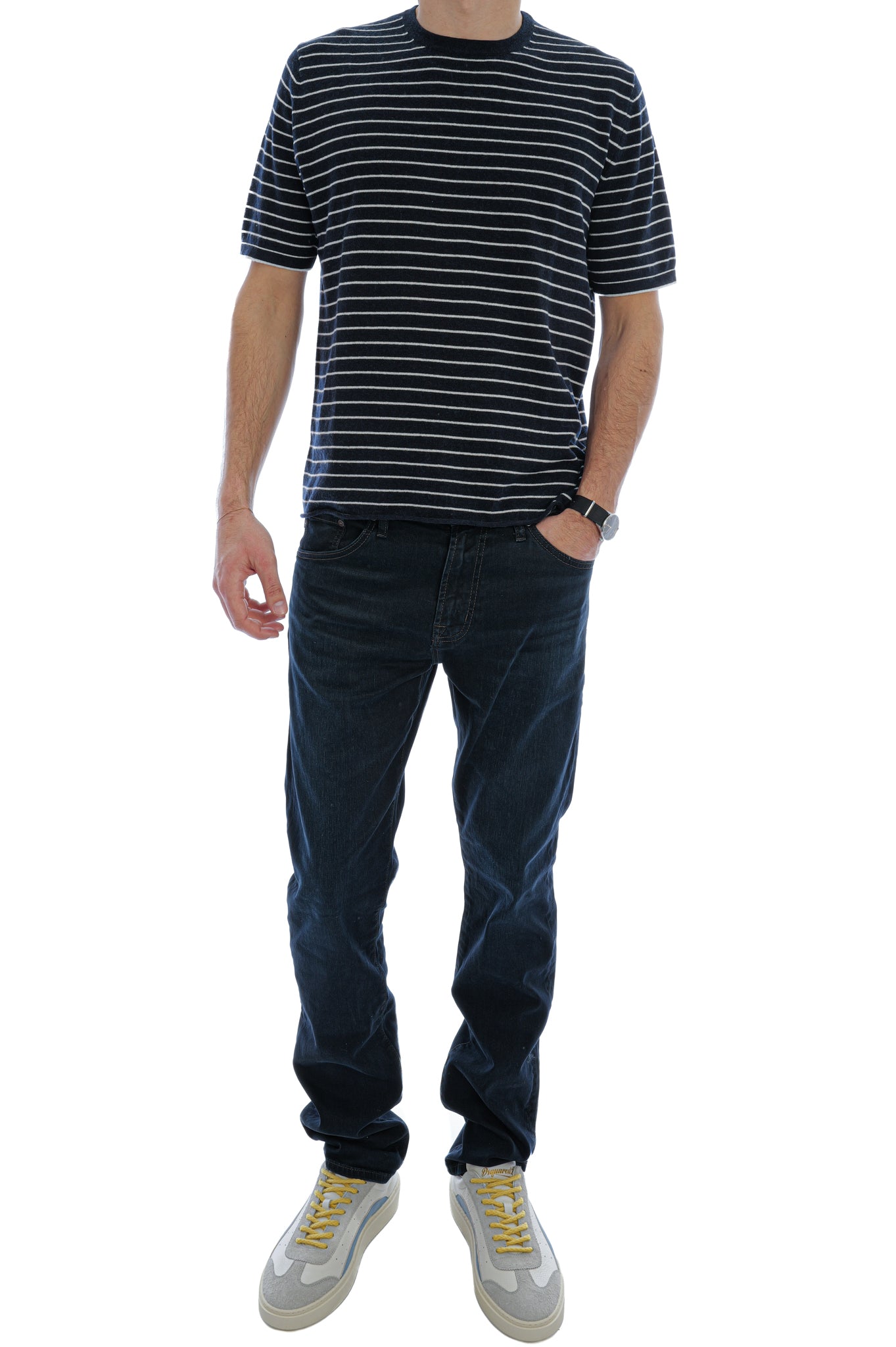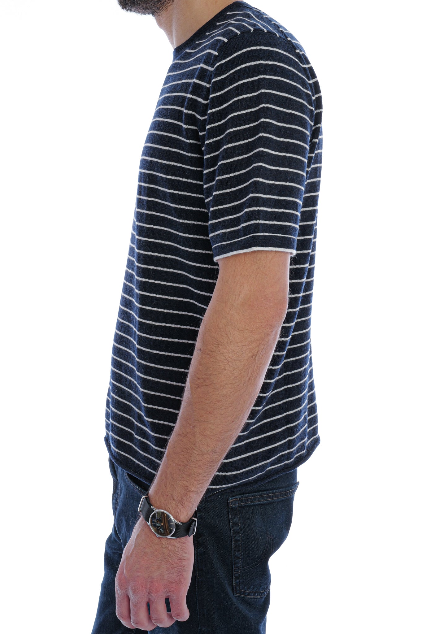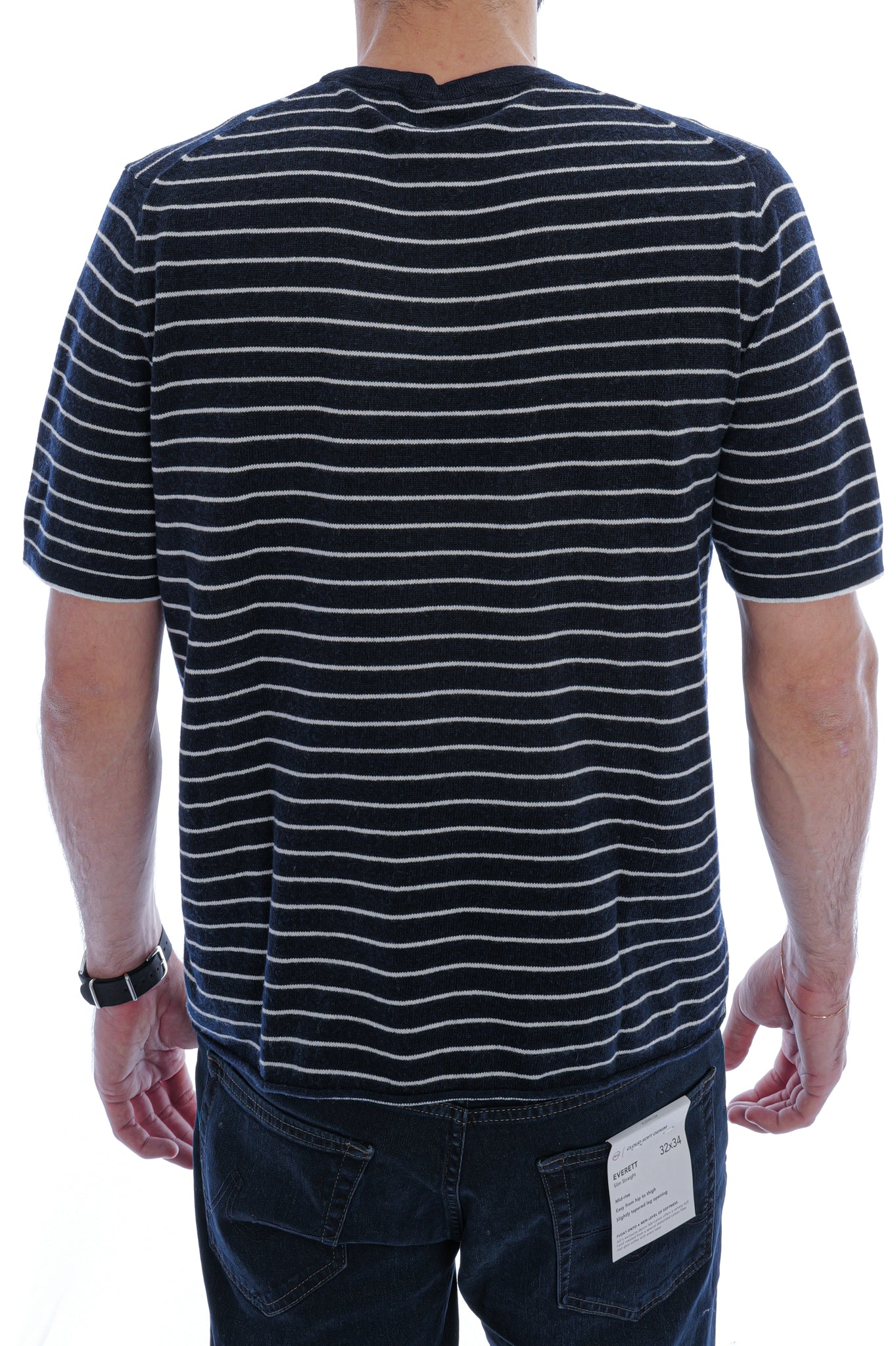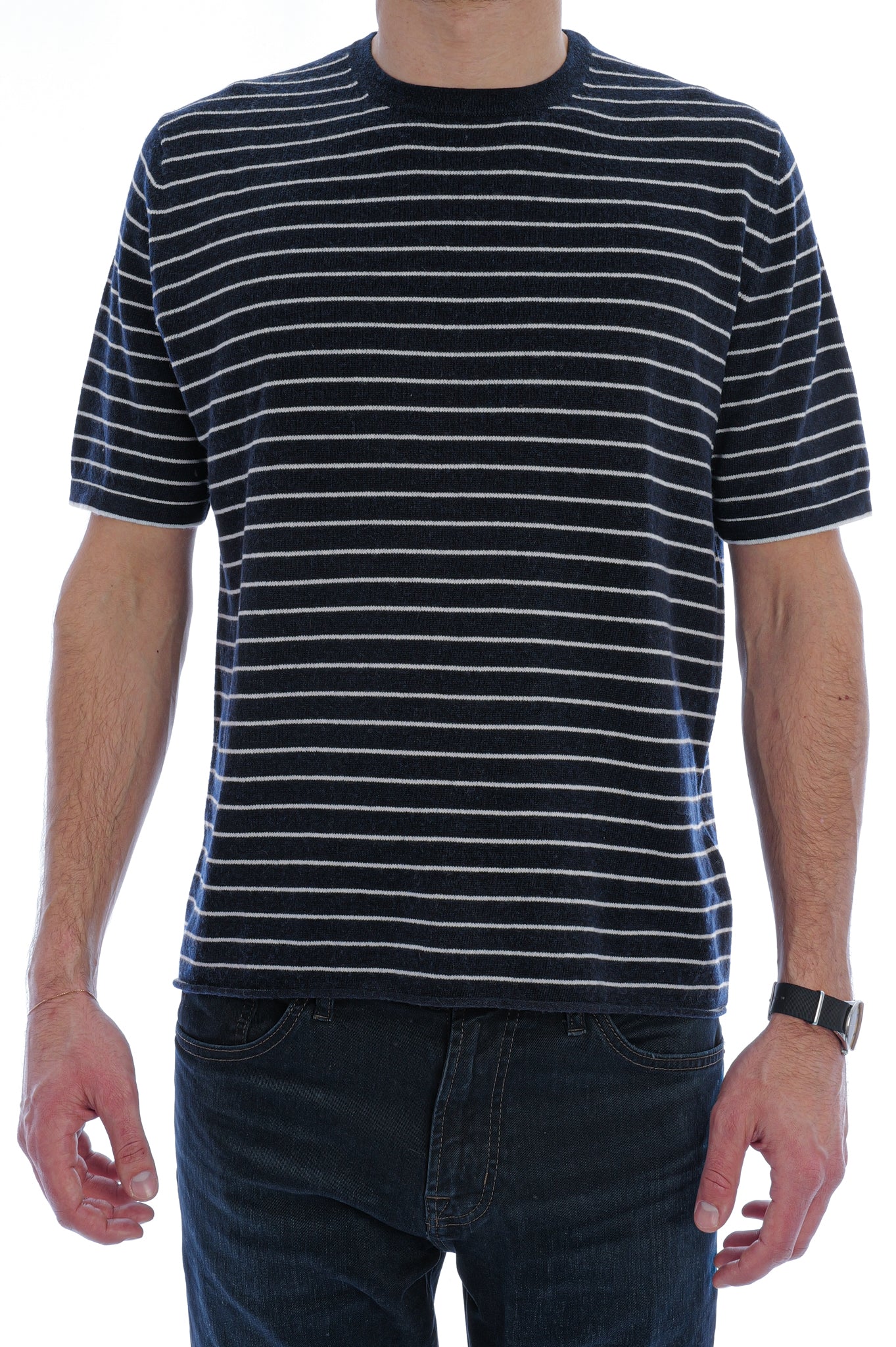 Das T-Shirt in Glattstrick mit feinem Streifenmuster verfügt über kurze Ärmel, einen Rundhalsausschnitt und einen geraden Saum mit lockerem Fall. Die Streifen-Details setzen Kontraste und Bewegung, ideal zum Layering im Sommer oder solo an sonnigen Tagen.