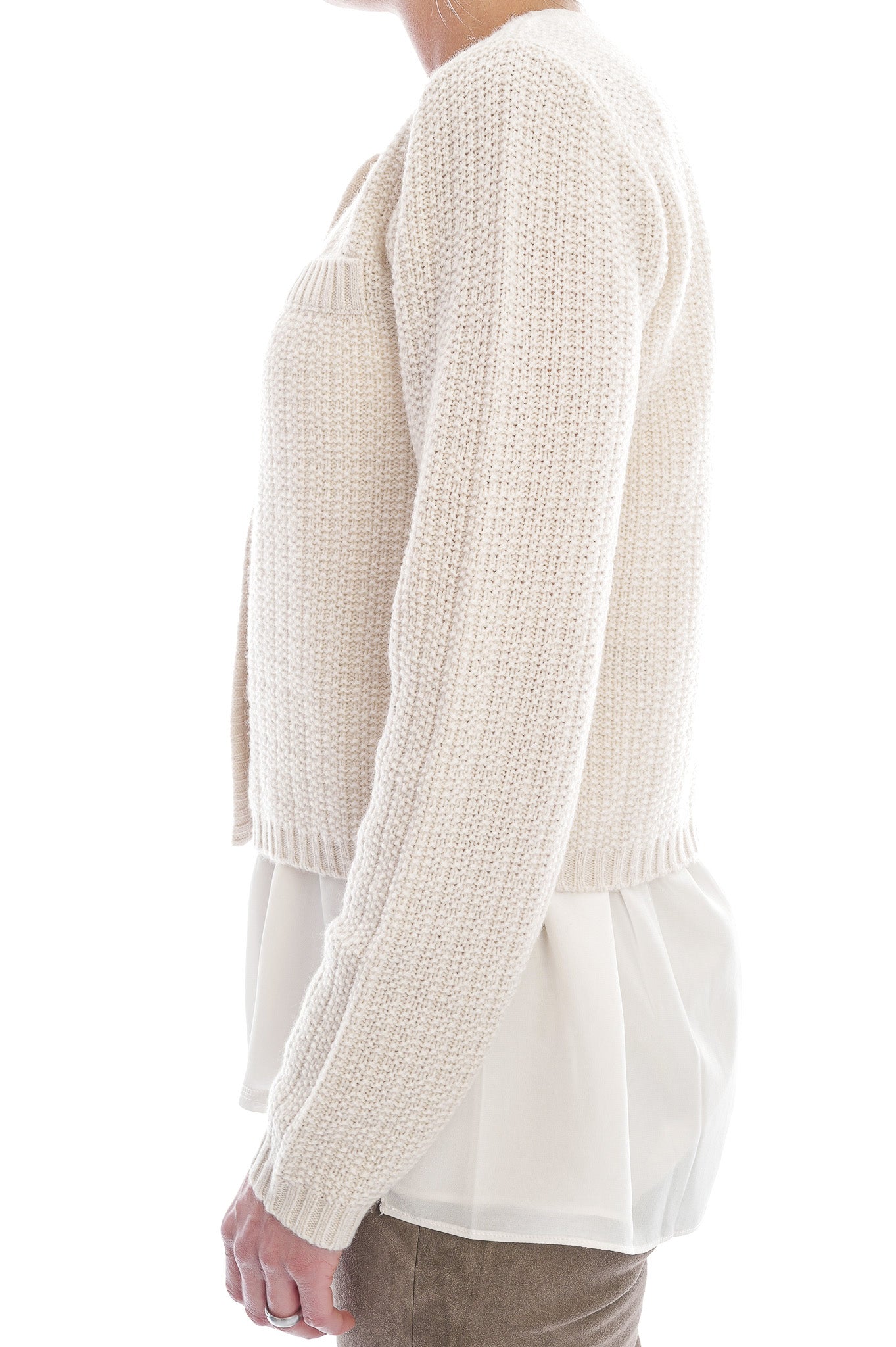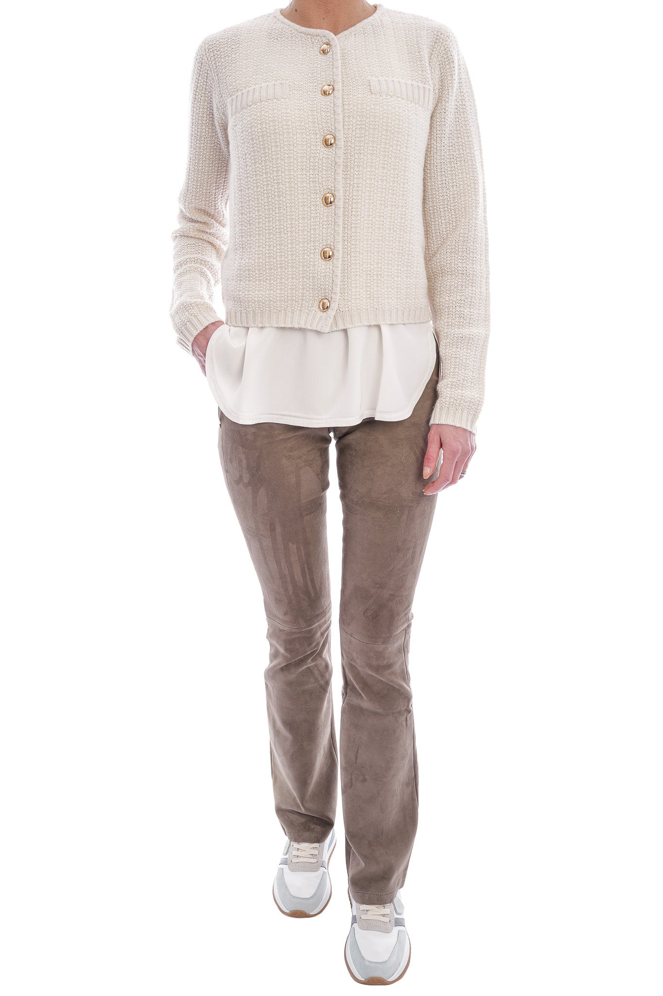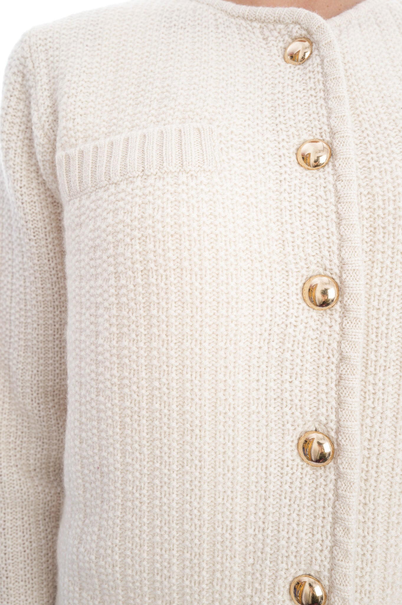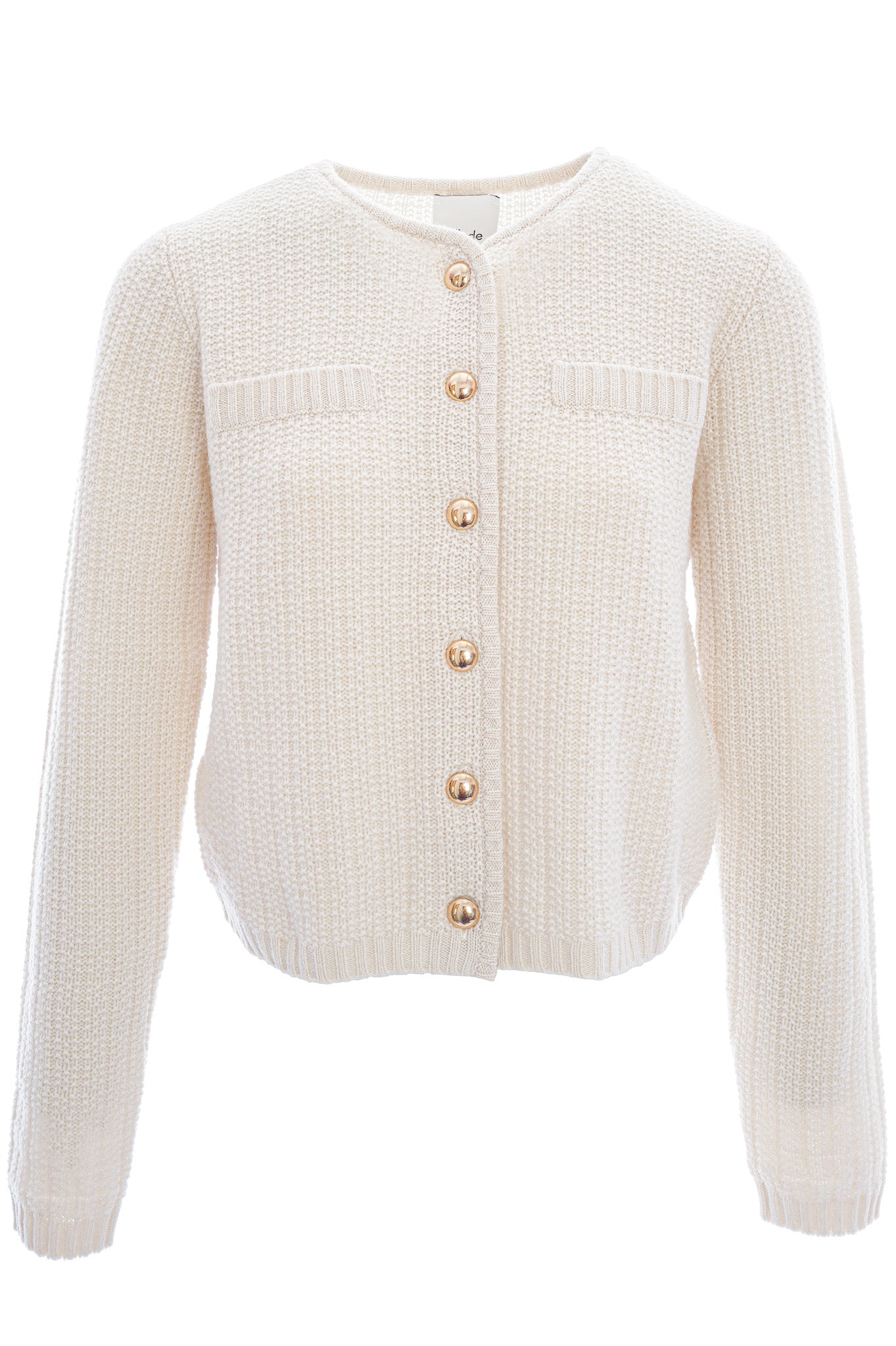 Die Strickjacke ist aus einem feinen, gleichmäßig strukturierten Waffel- oder Körbchenstrickmuster gearbeitet, das der Oberfläche eine leicht strukturierte, aber dezente Optik verleiht. Sie hat einen runden Ausschnitt, lange Ärmel, zwei Brusttaschen und eine durchgehende Knopfleiste mit glänzenden goldfarbenen Knöpfen, die einen eleganten Akzent setzen.