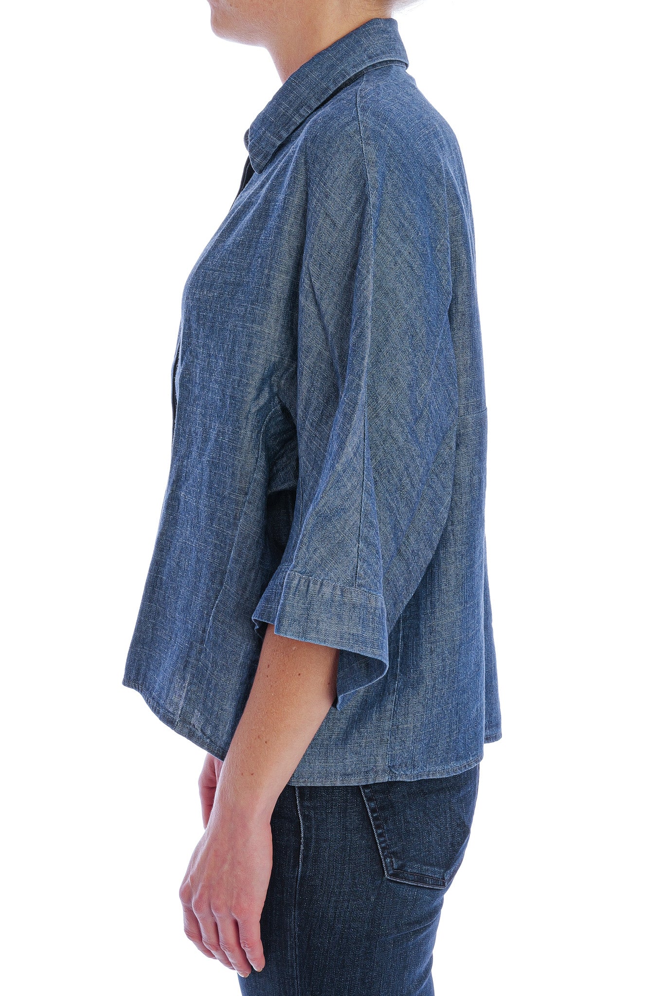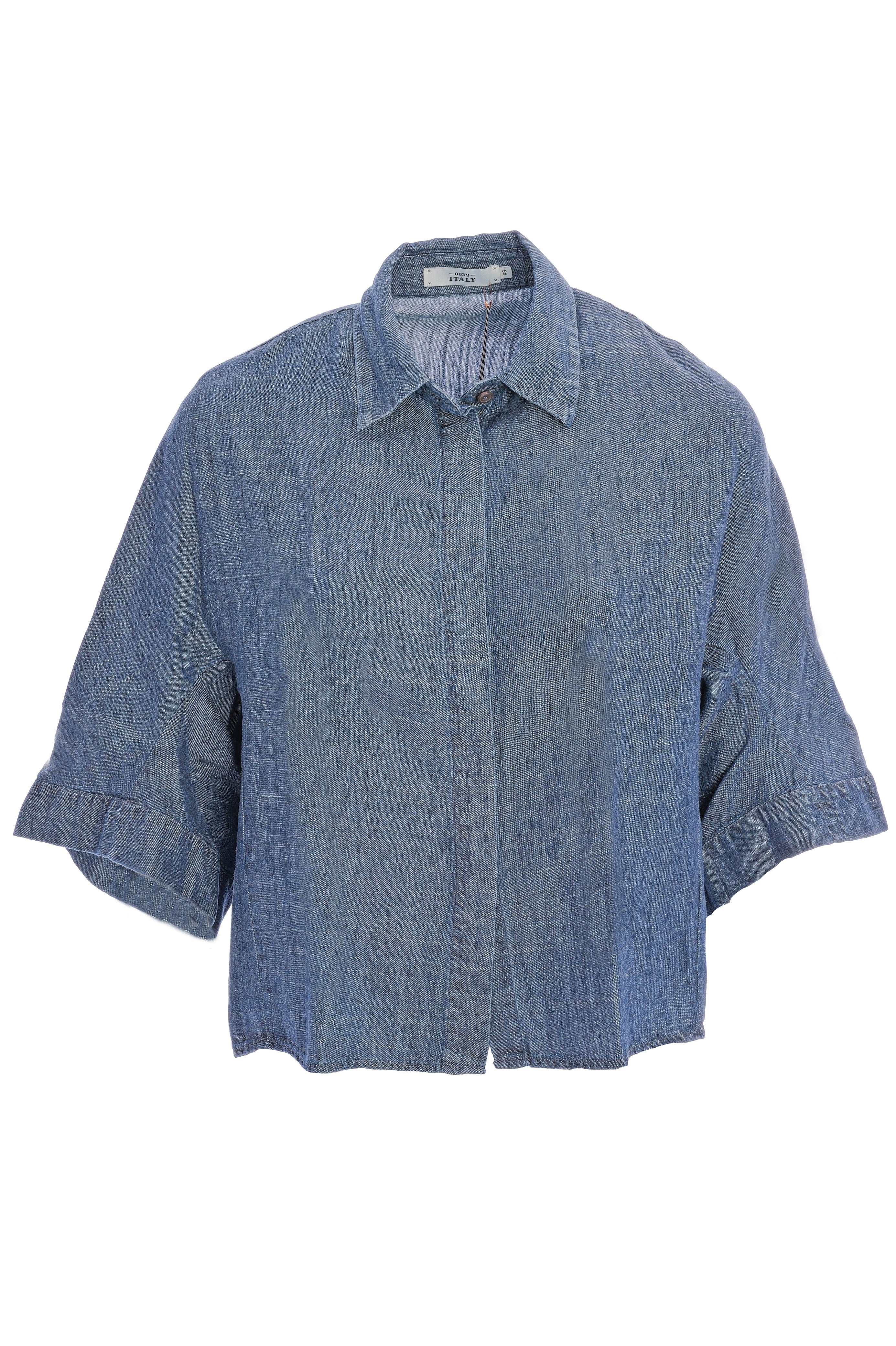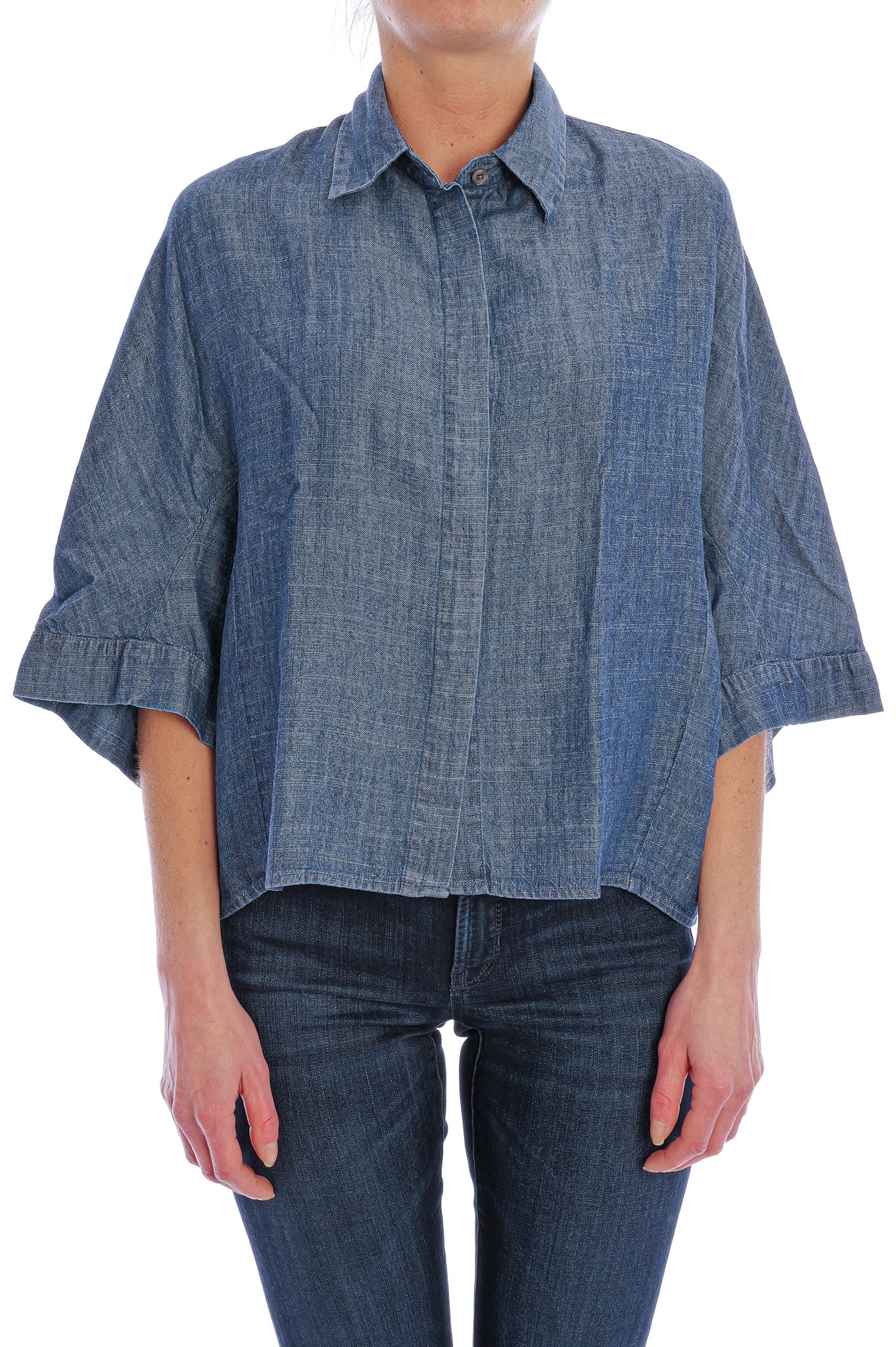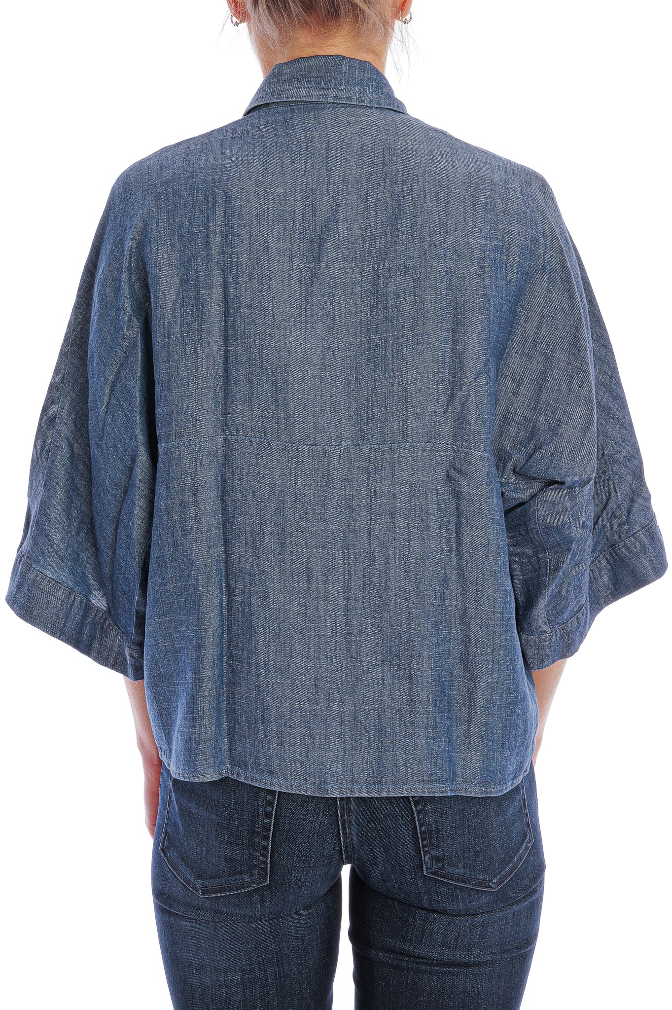 Diese Bluse überzeugt mit einem modernen Oversize-Schnitt, Hemdblusenkragen und einer durchgehenden, verdeckten Knopfleiste. Der leichte Stoff in Denimoptik und die überschnittenen Schultern sorgen für einen lässigen, zeitgemäßen Look.