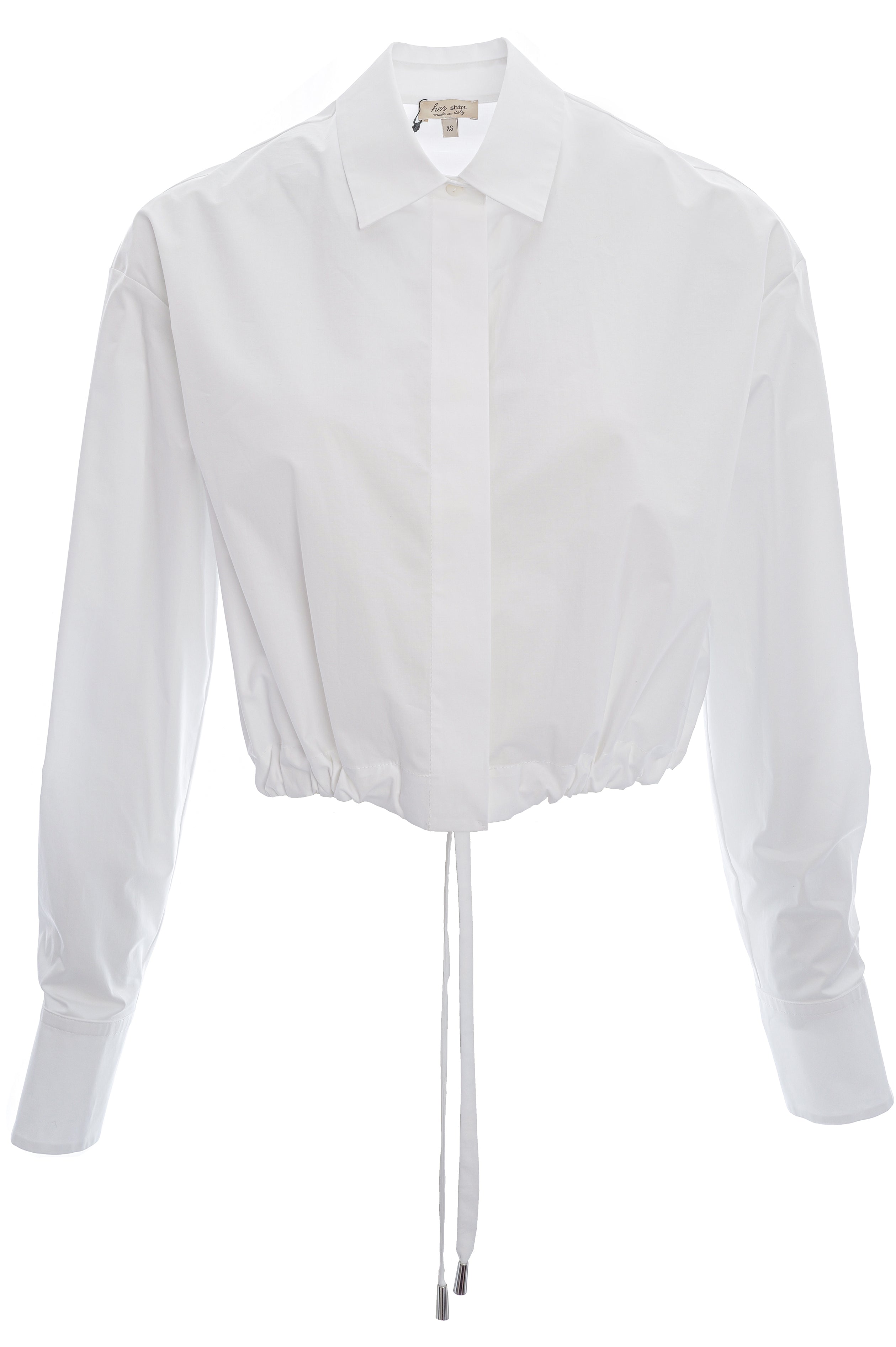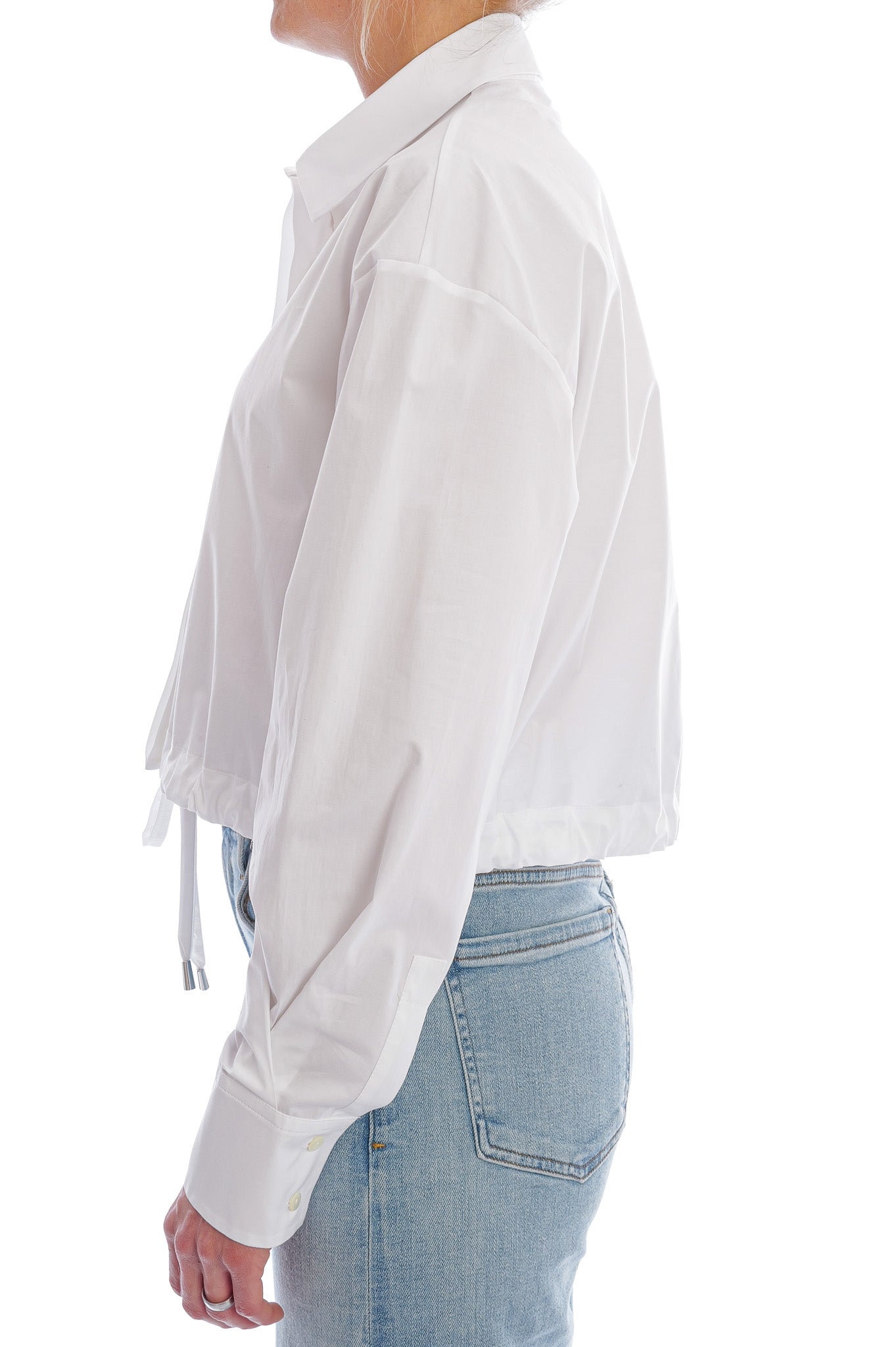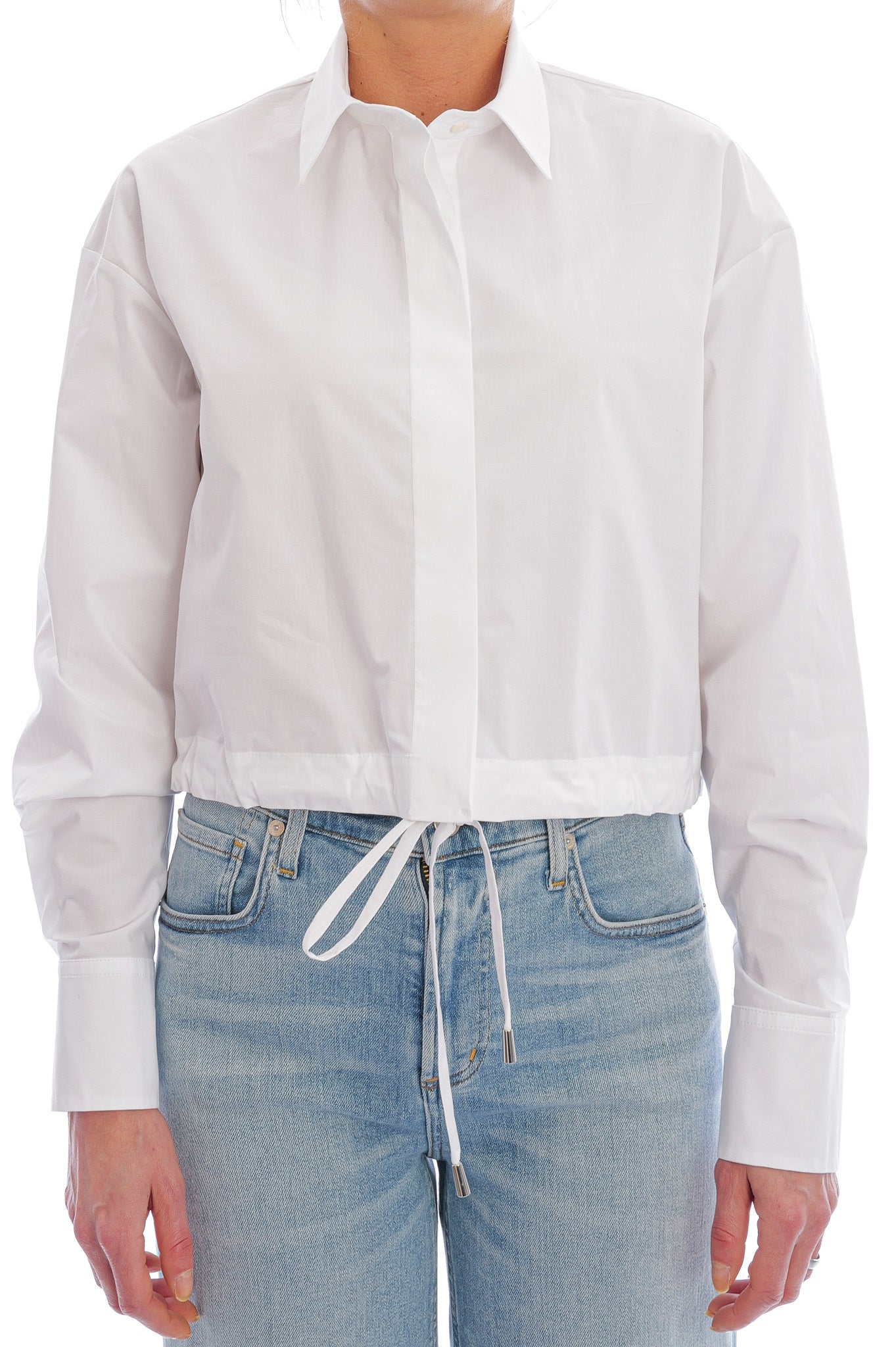 Leichte Baumwollbluse mit Hemdkragen, kurzem Schnitt und breiten Manschetten, veredelt durch einen lässigen Schnürzugbund für einen modernen Look.