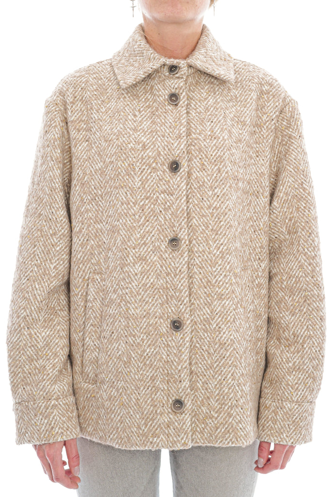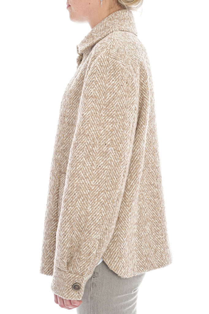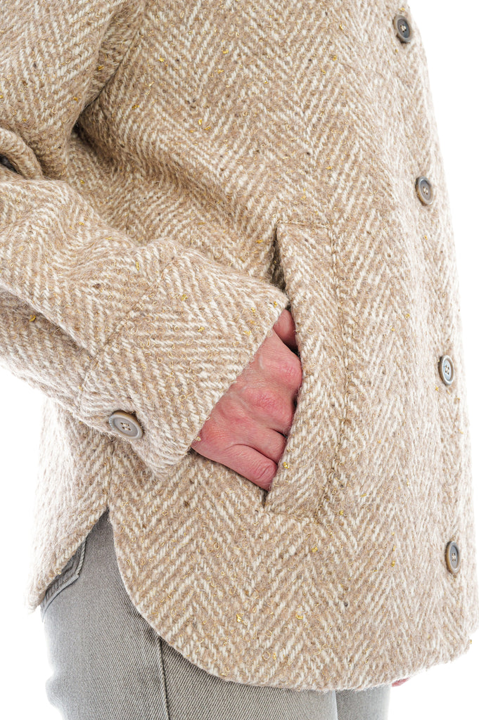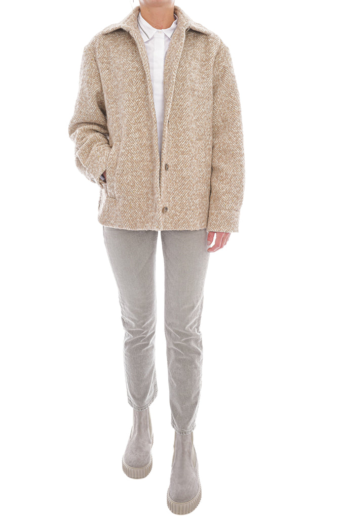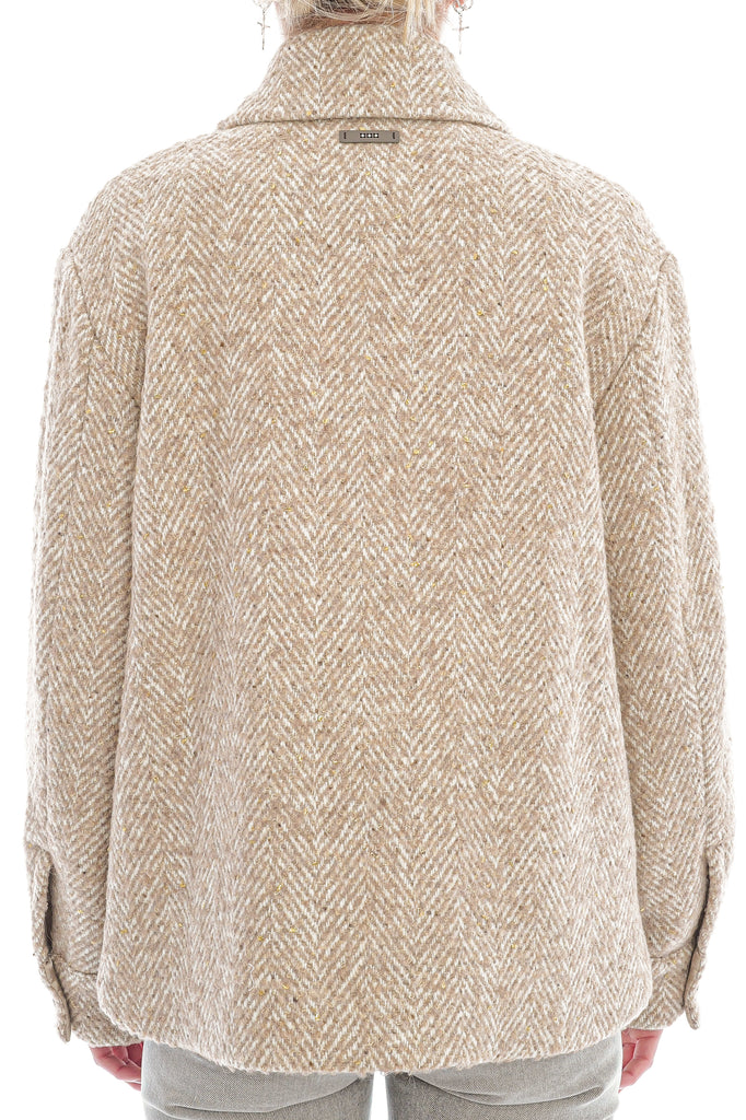 Diese Jacke mit nostalgischem Charme vereint die reiche Textur von Lurex-Knop-Alpaka-Bouclé mit exzellenter Handwerkskunst. Der klassische Hemdkragen, offene Knöpfe und die locker fallende Silhouette schaffen eine elegante, markante Optik – ideal zu maßgeschneiderten Röcken oder Hosen.