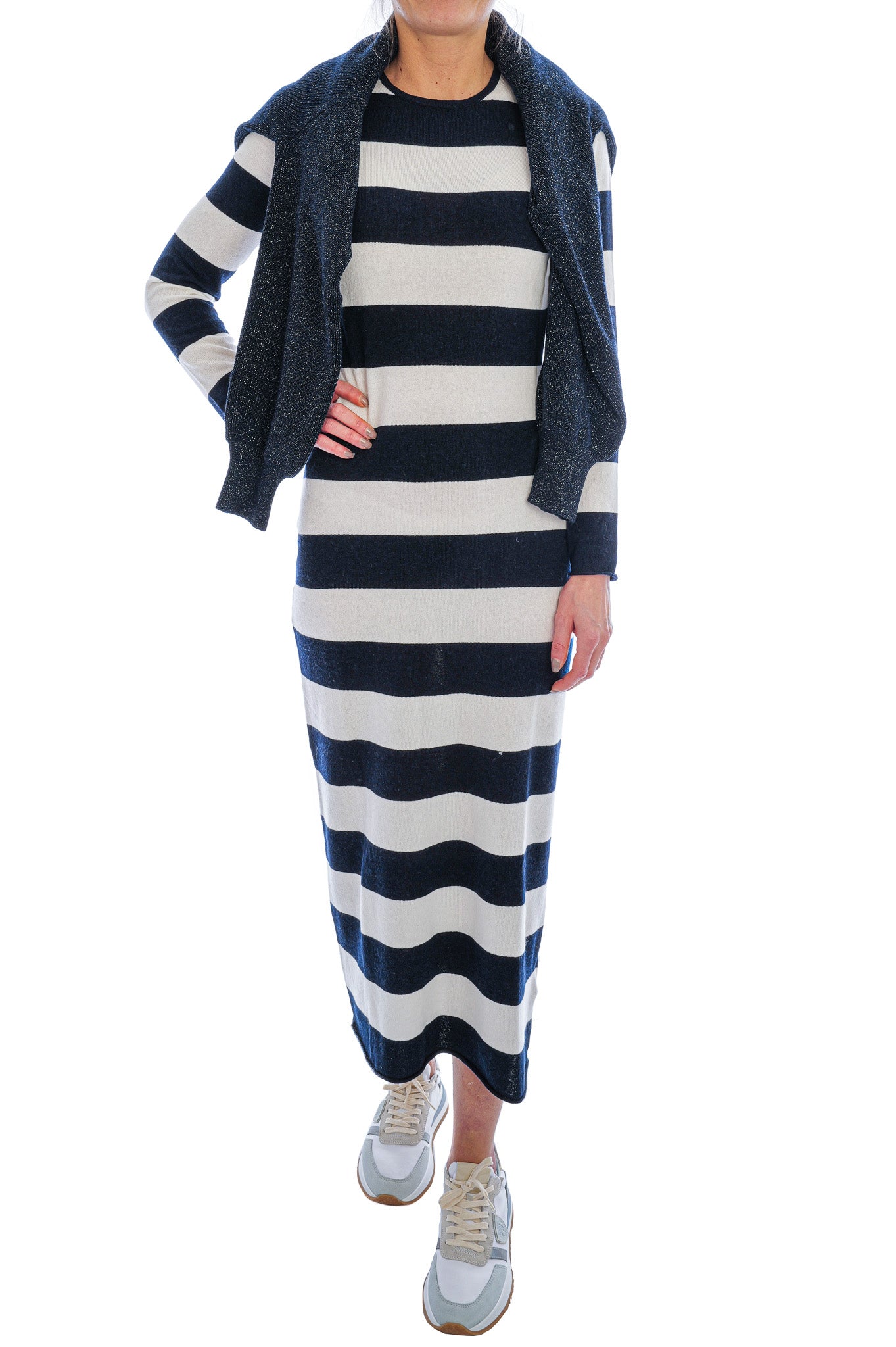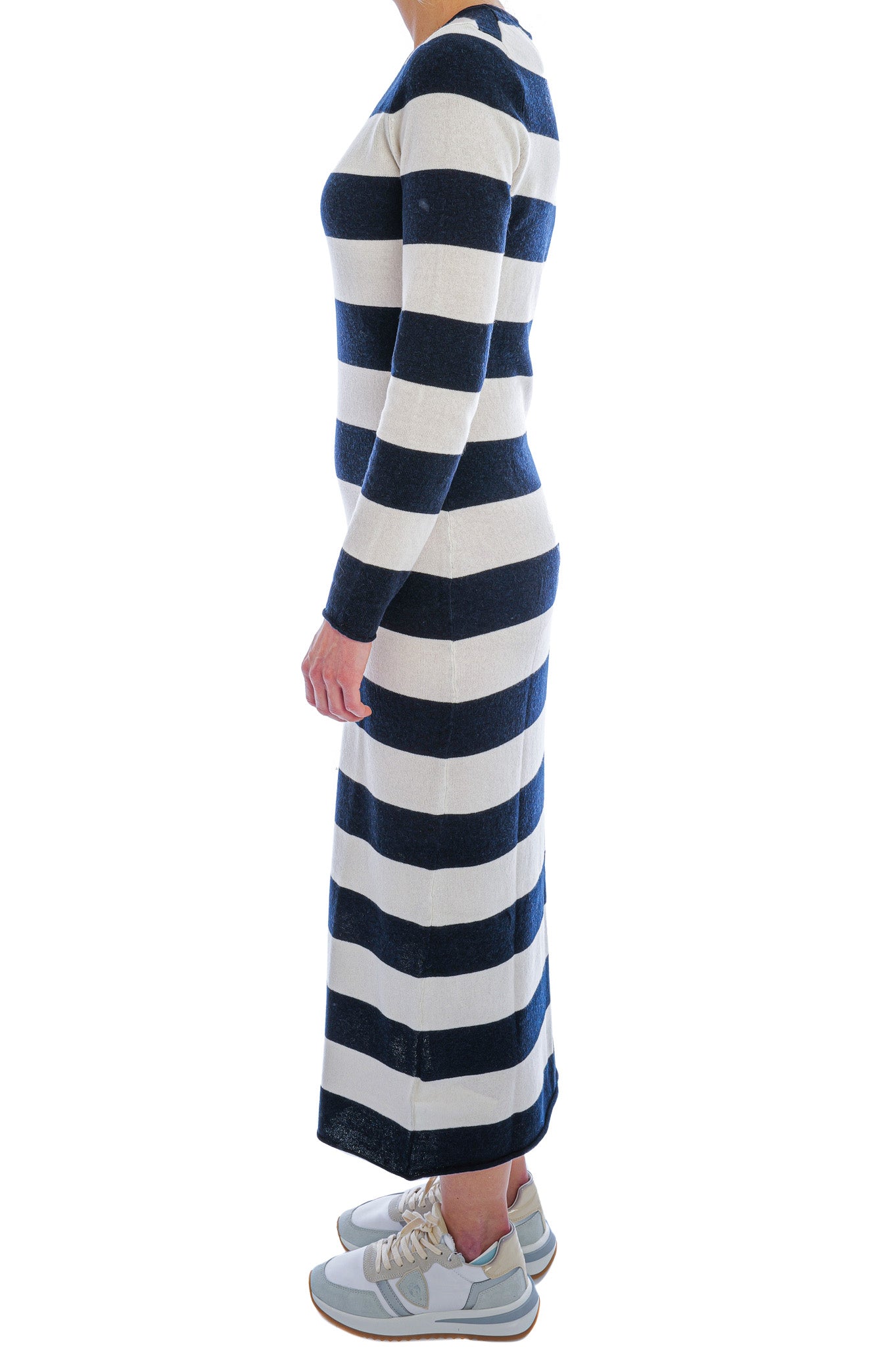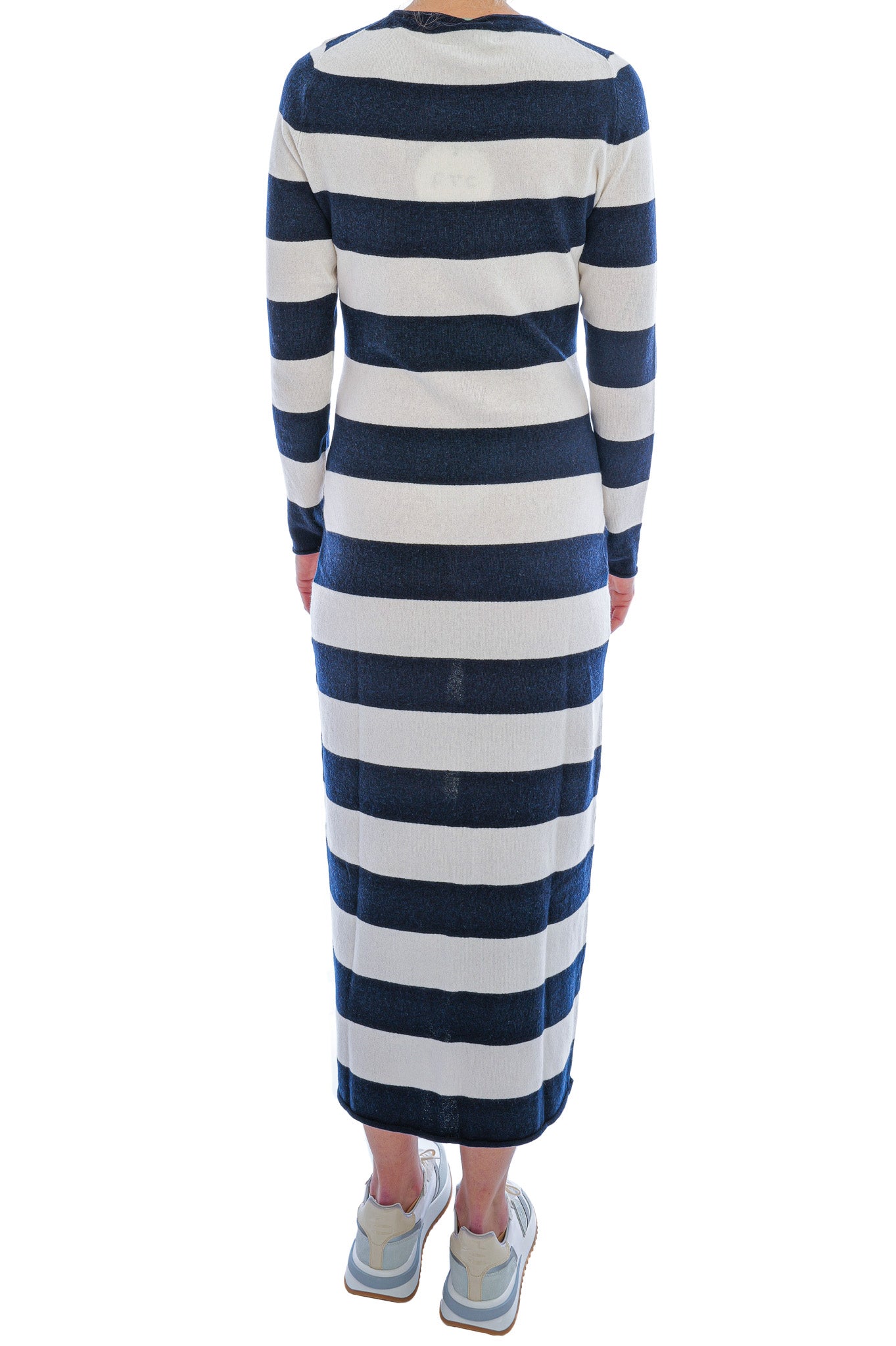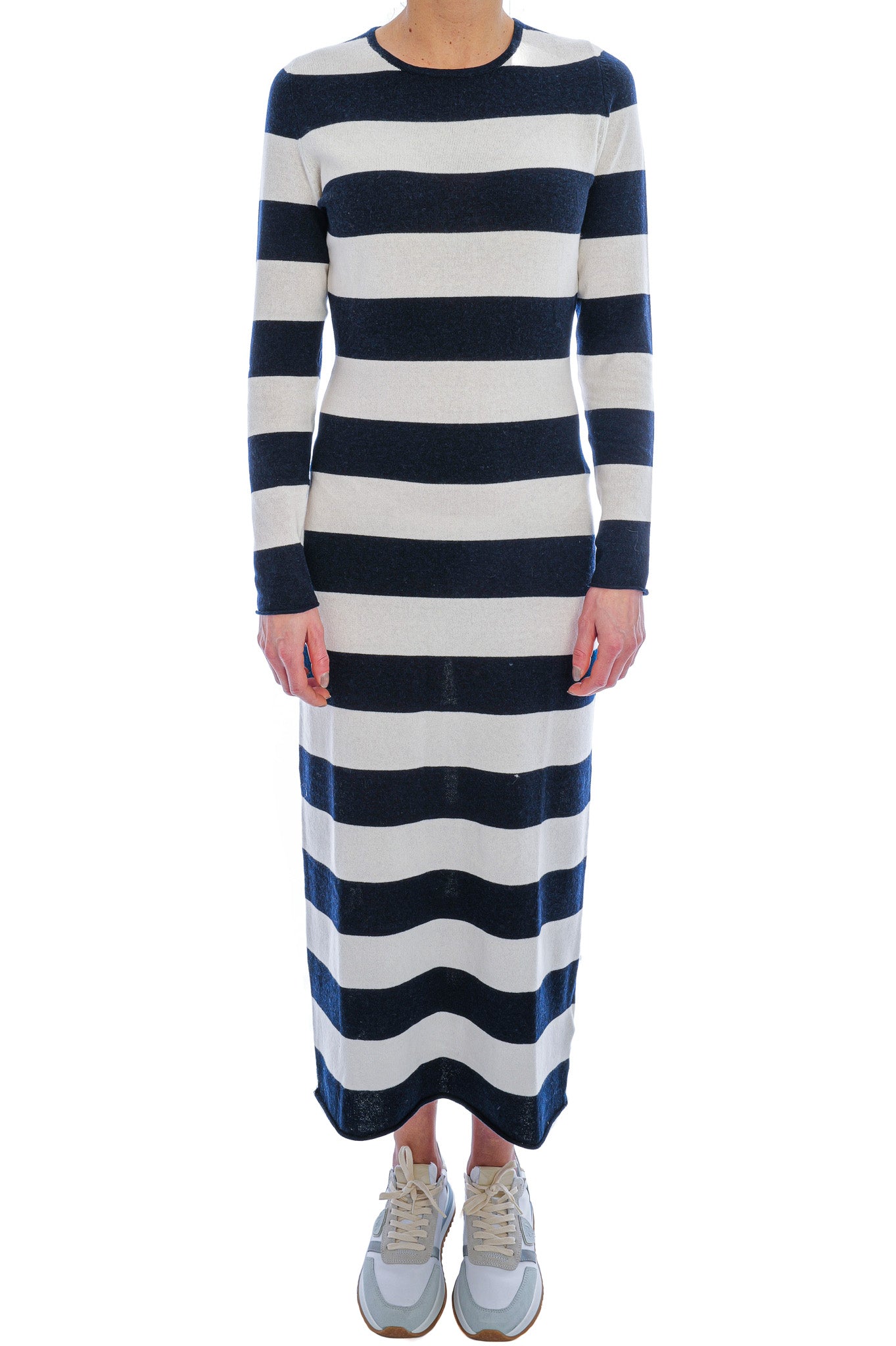 Der Glattstrick mit markanten Querstreifen sorgt für eine moderne, grafische Optik, während lange Ärmel angenehme Wärme bieten. Ein Rundhalsausschnitt mit schmalem Abschluss und dezente Fully-Fashioned-Schulternähte runden das Design stilvoll ab. Styling-Tipp: Mit Chunky Boots oder Sneakern entsteht ein lässiger, zeitgemäßer Tageslook.