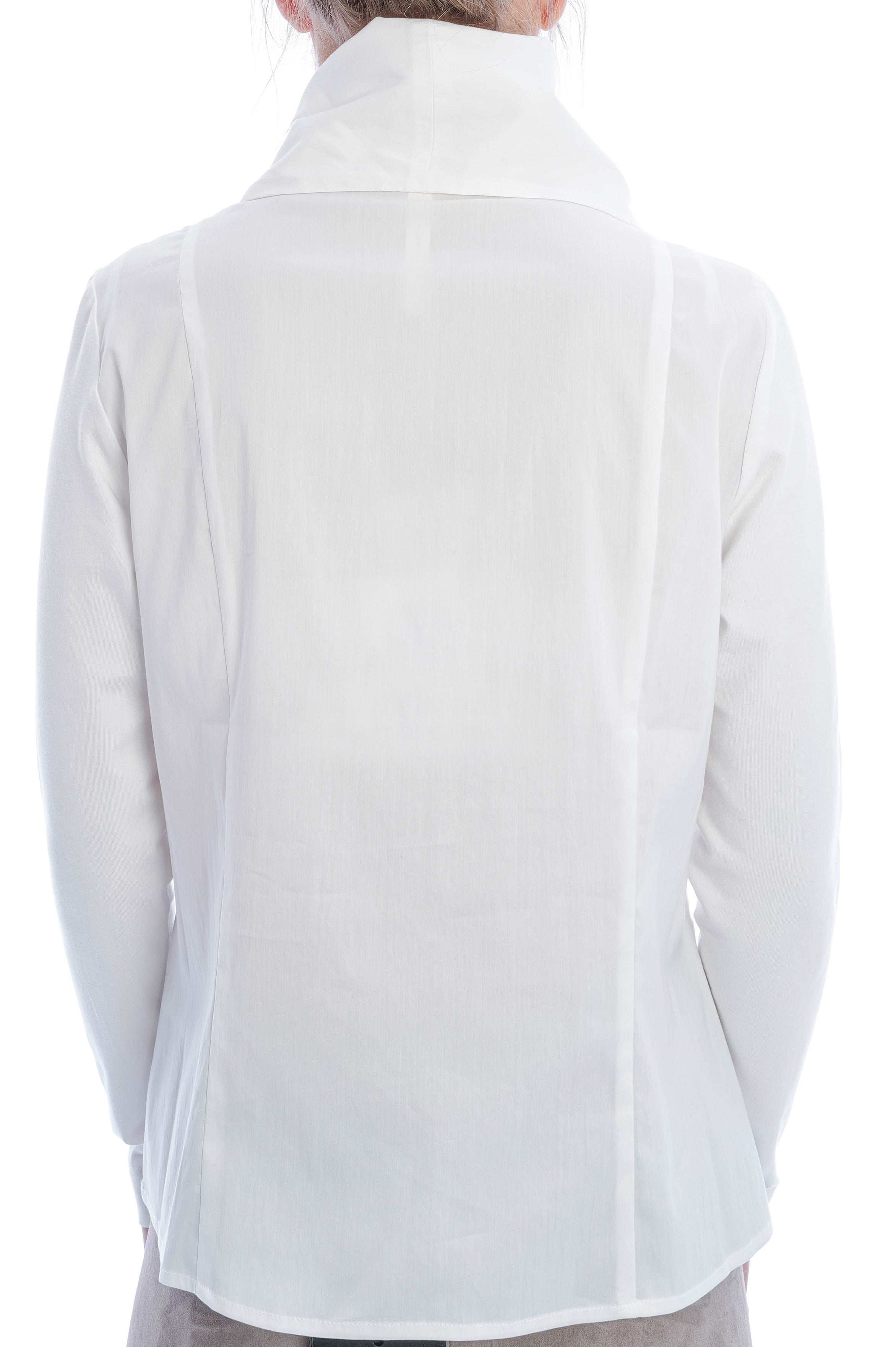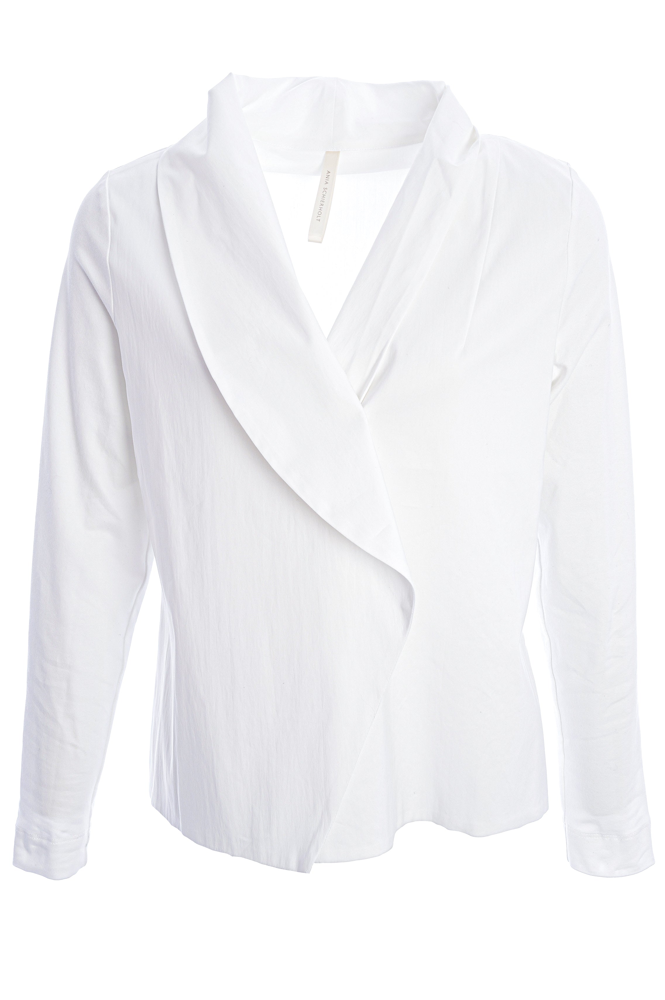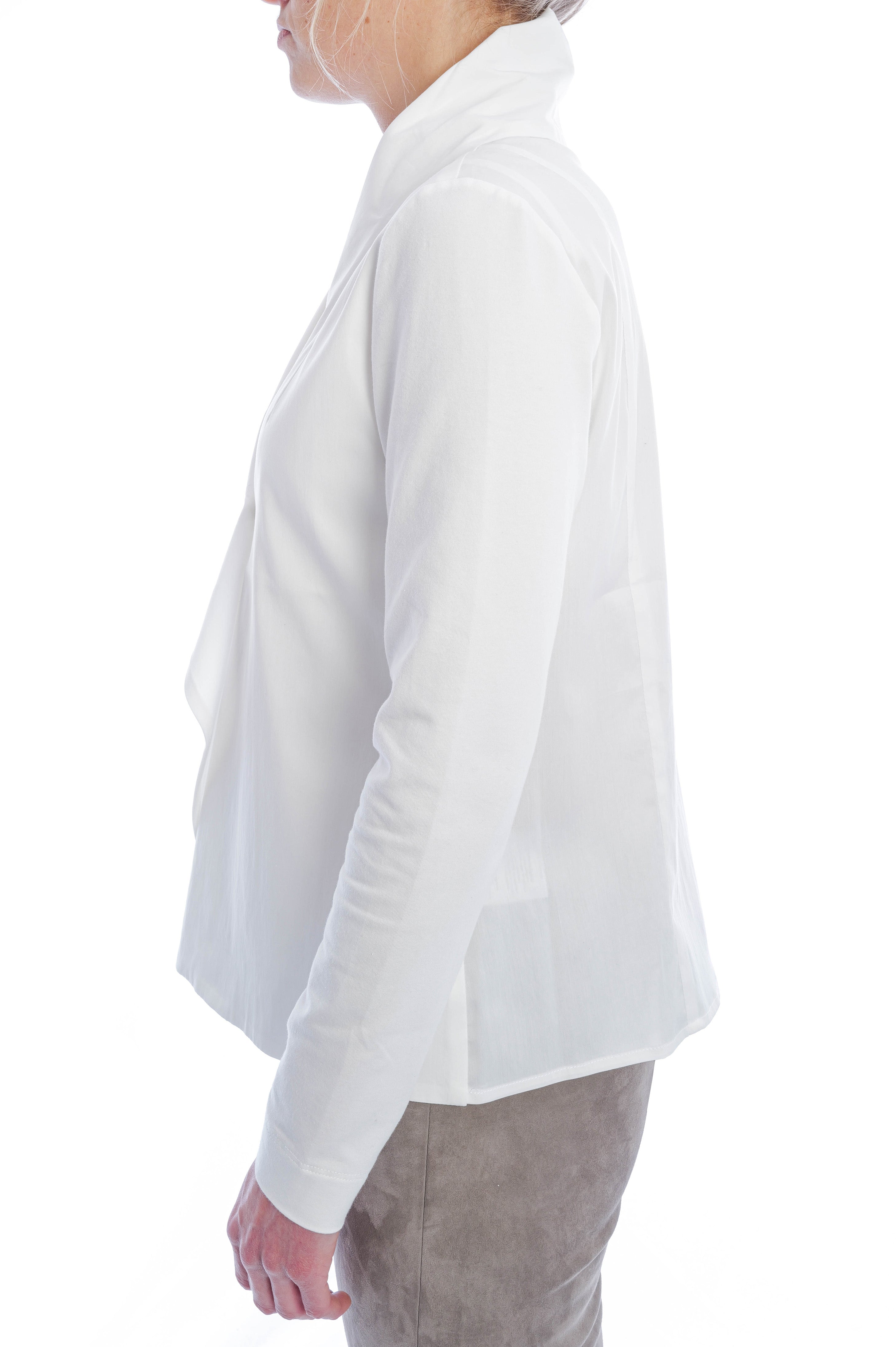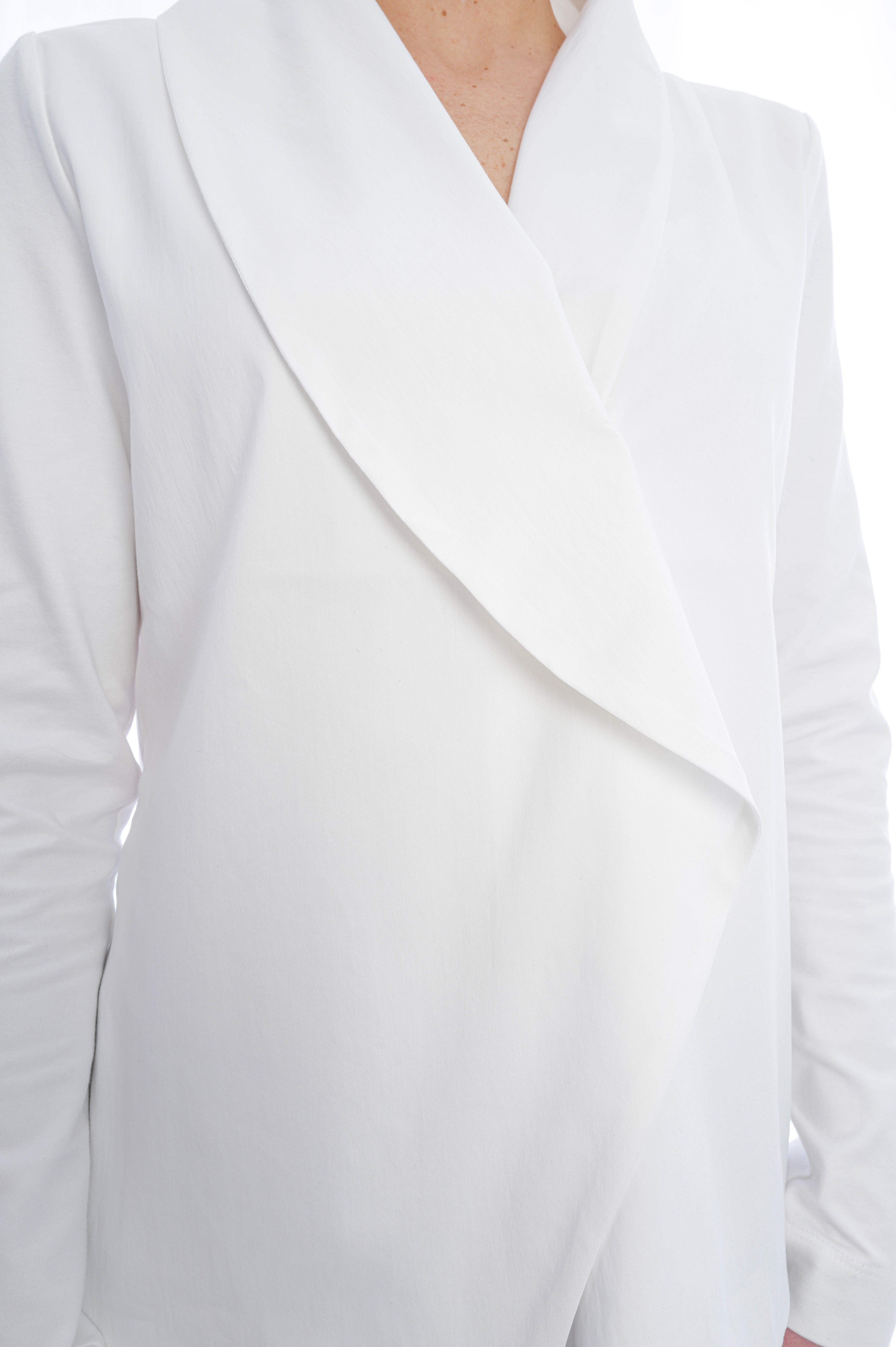 Die weiße Bluse hat eine elegante, weich fallende Wickeloptik mit breitem, asymmetrischem Kragen. Sie hat lange Ärmel und wirkt durch den fließenden Stoff schlicht und modern.