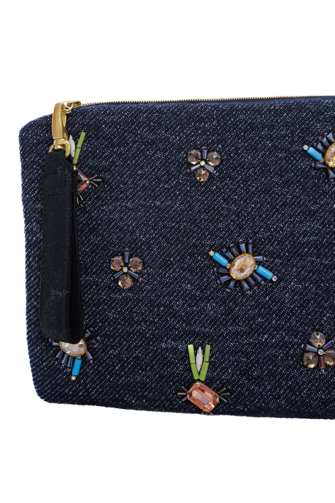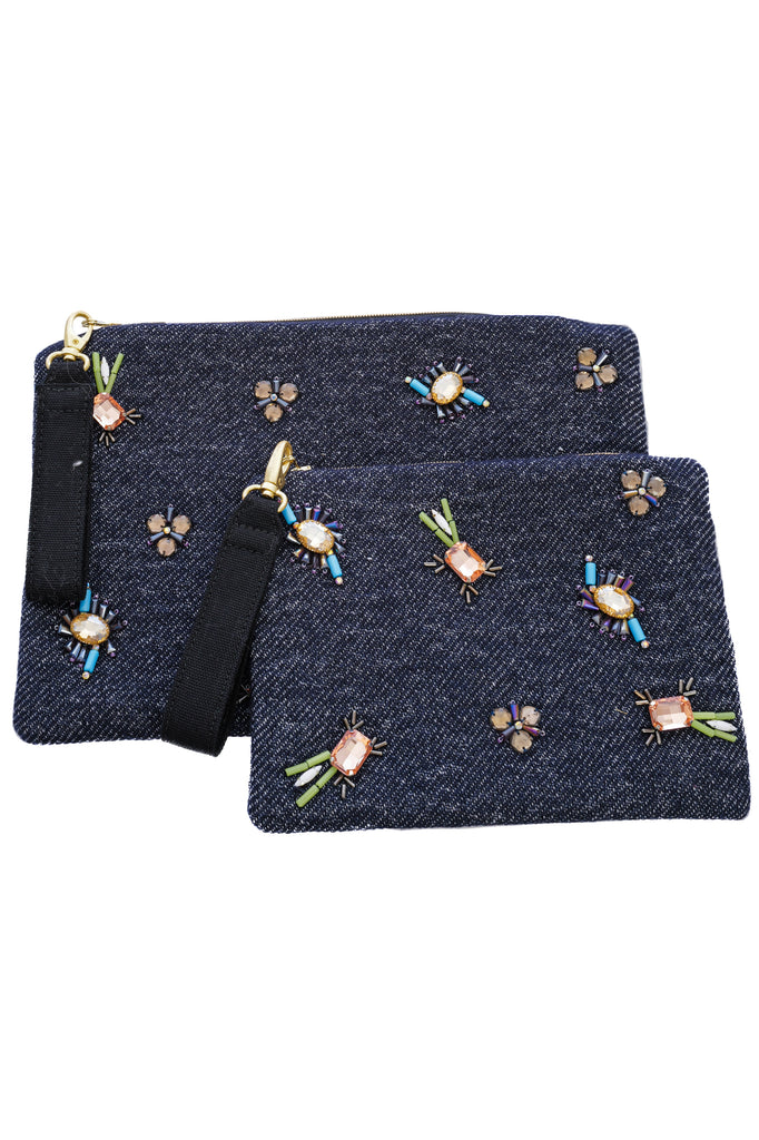 Der große Beutel im Denim-Look ist vielseitig einsetzbar – ob als Schminktasche oder elegante Abend-Clutch. Verziert mit bunten Steinen und Perlen, setzt er stilvolle Akzente, während er kompakt bleibt; der kleinere Beutel ist separat erhältlich.